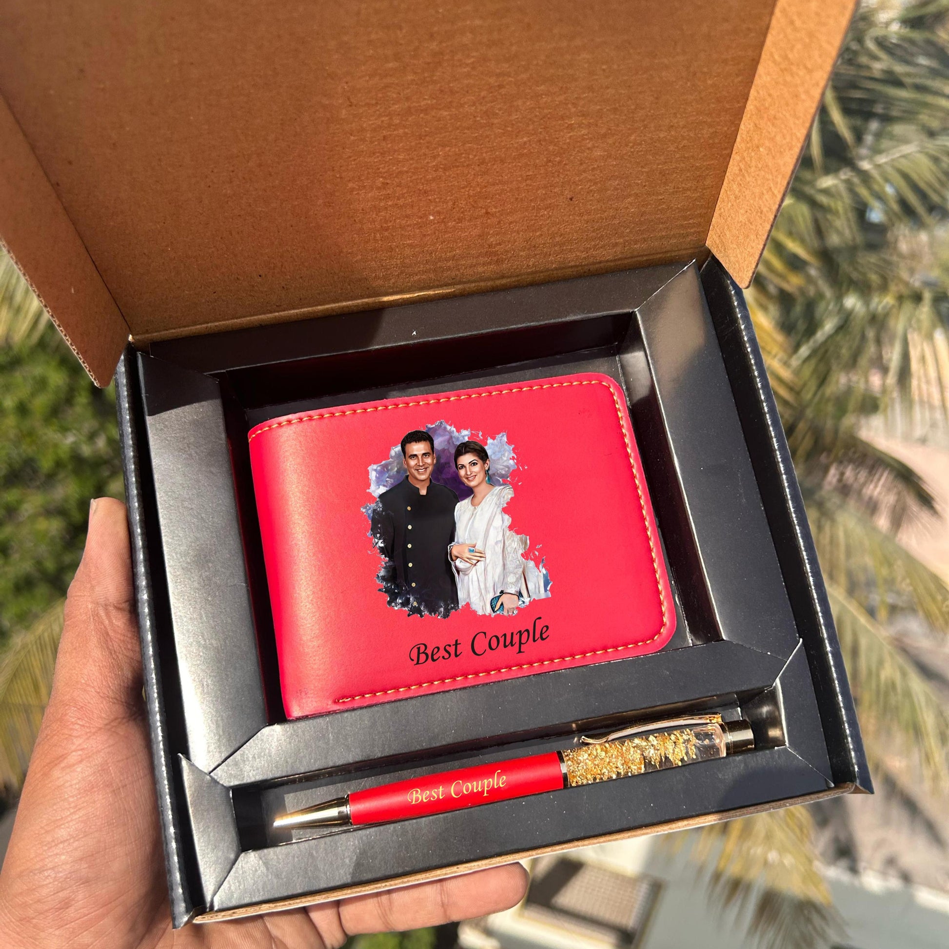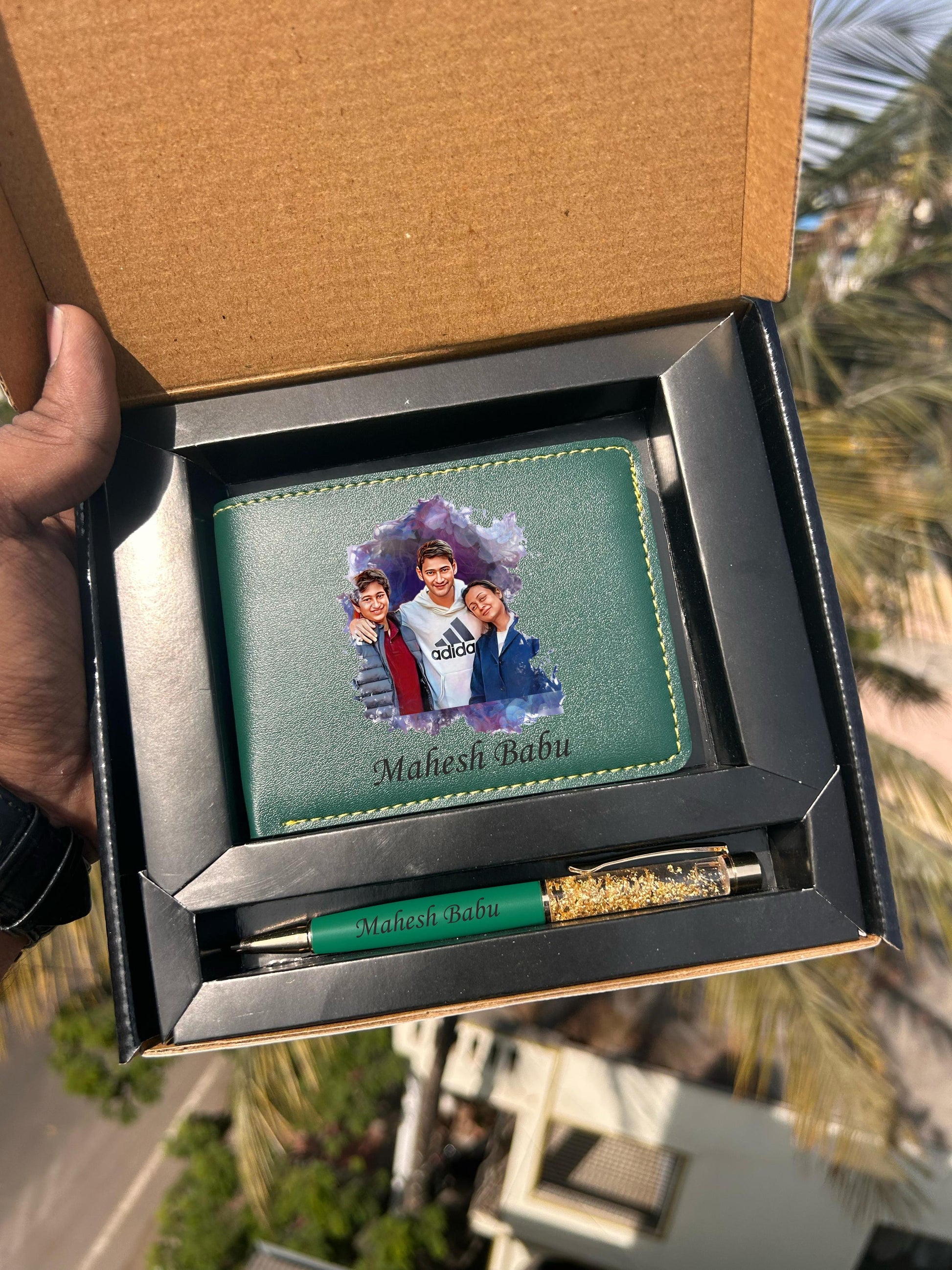 A box of common gifts presented in an uncommon design is now your way. Inclusive of a unique customized wallet (picture and name of your choice in artistic form) and a name engraved pen. The wallet is available in 7 ideal colors, and you can choose a pen from the given list. It comes in a premium box.