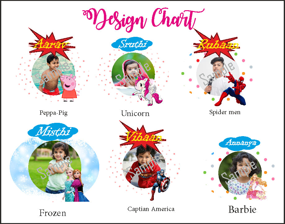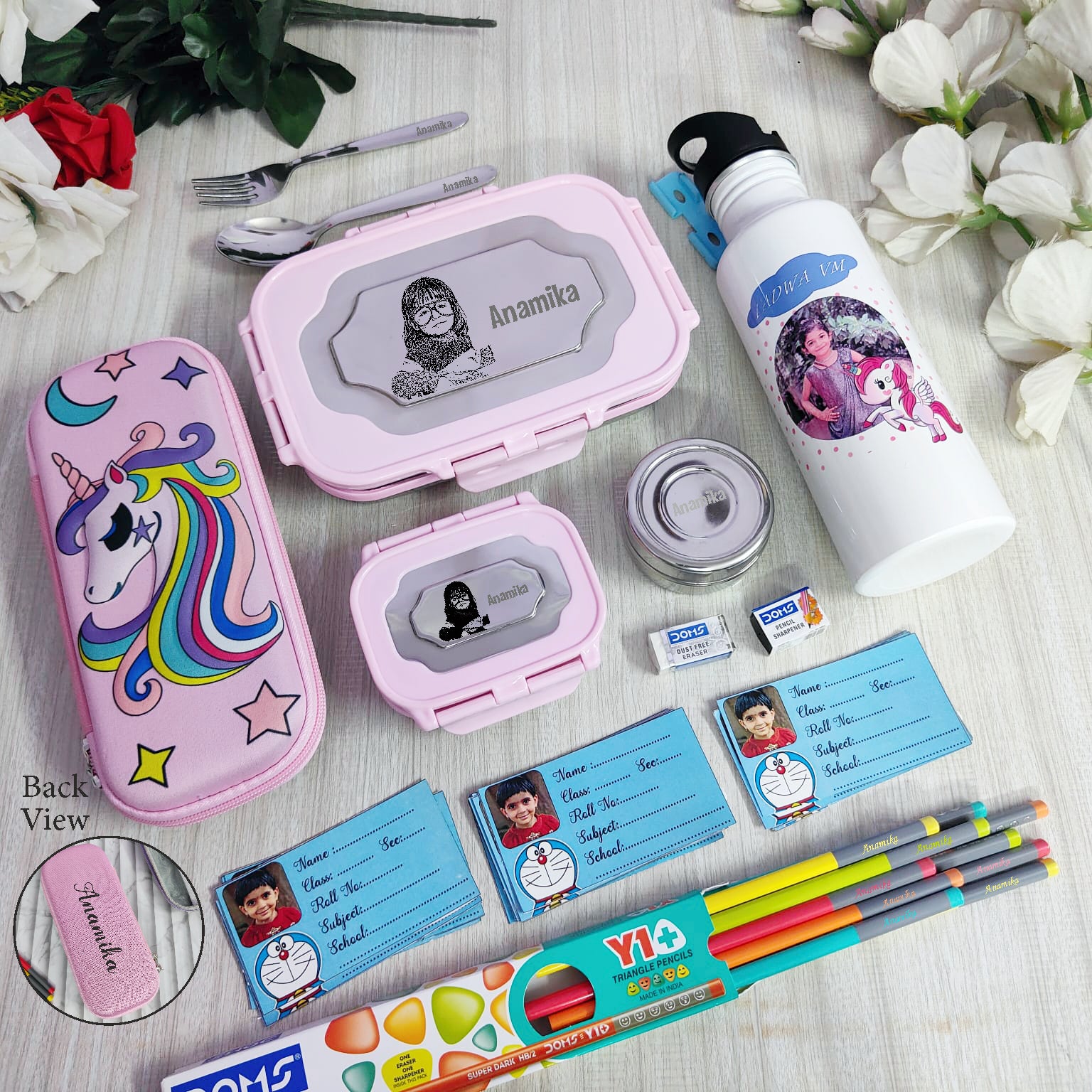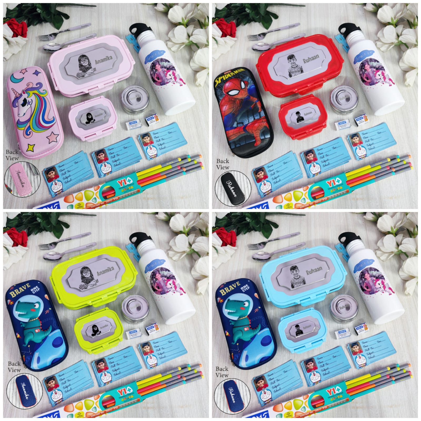 Scope of one pic & name customized on the lunch box set & bottle and one name customized for cutlery, pencil & stationary pouch.