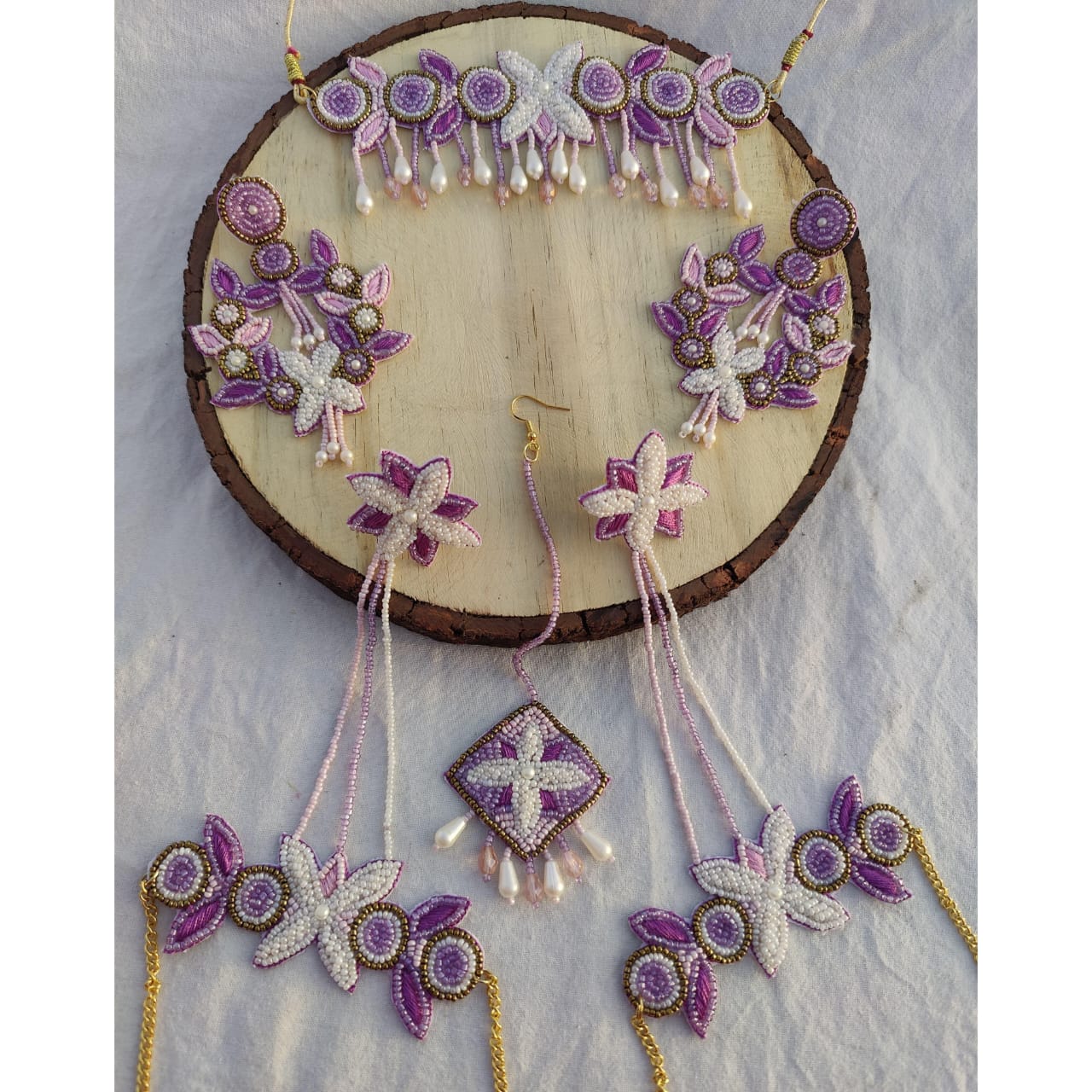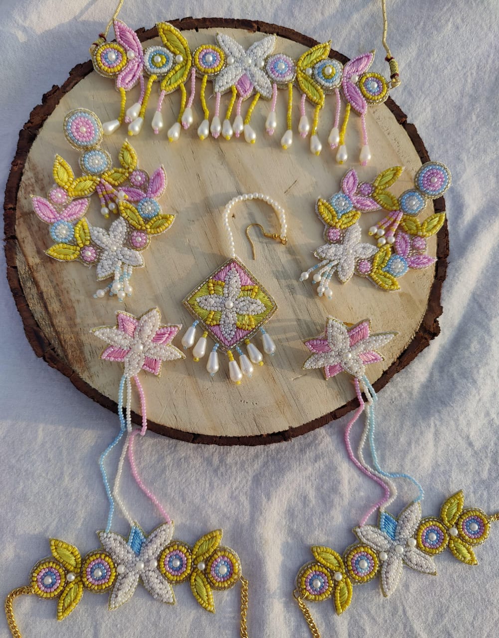 Elevate your festive or bridal look with our Bead Jewelry Set 2.0. Adorned with delicate beadwork, floral patterns, and elegant pearl drops, this handcrafted set includes a necklace, earrings, and hand accessories—perfect for haldi, mehendi, or pre-wedding celebrations.