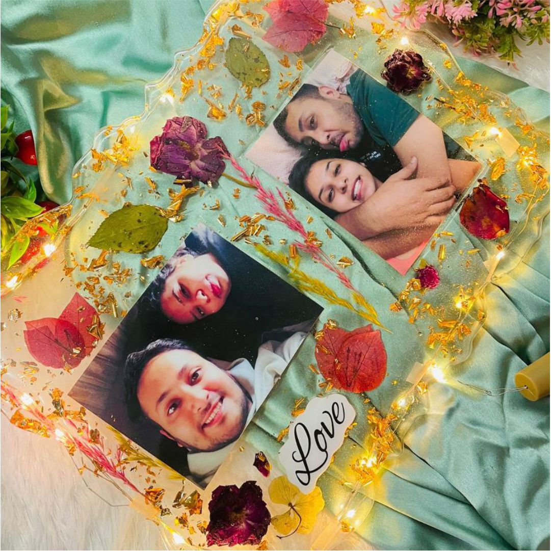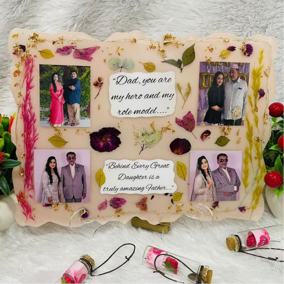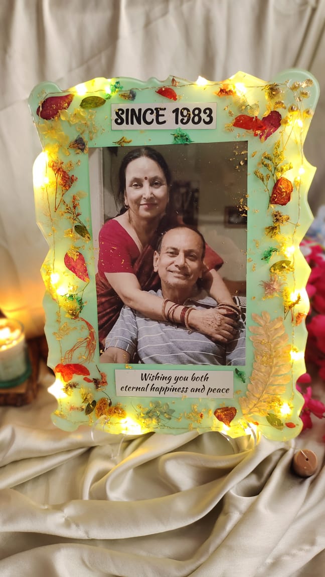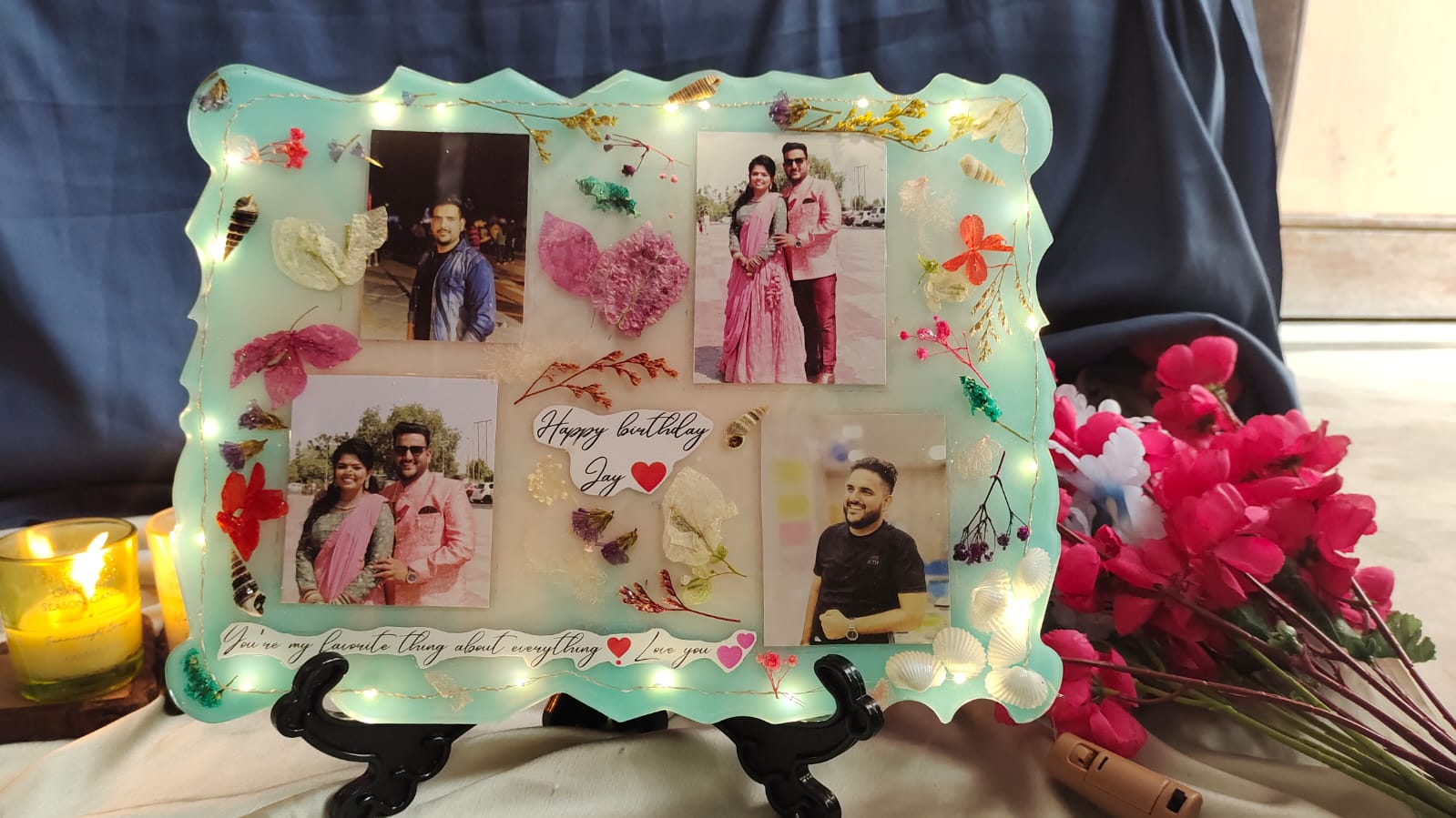Decorate your house's table with this beautiful resin tabletop. It is a religious piece of resin art with cultural ethics. It has a vast border with golden foil outlined by golden paint and a wooden base.