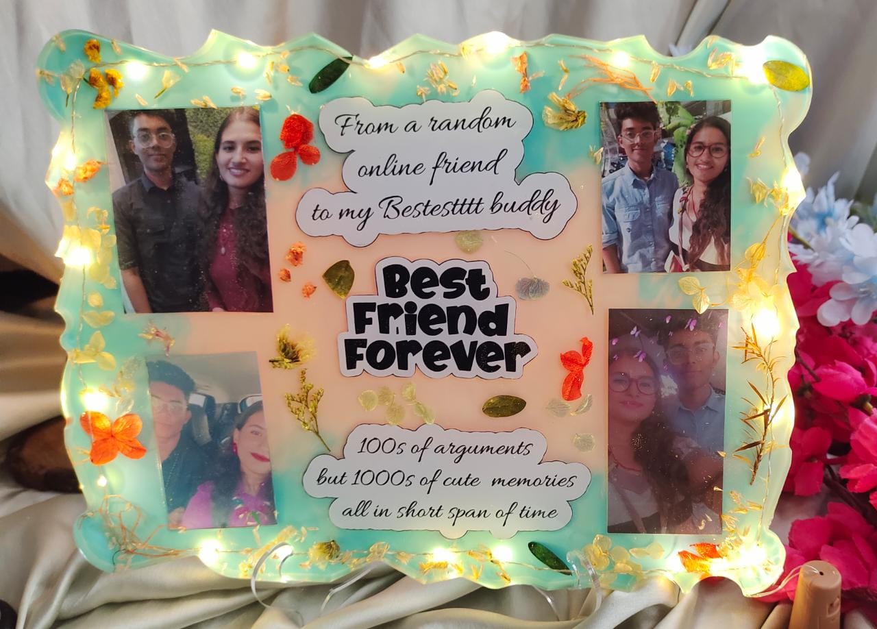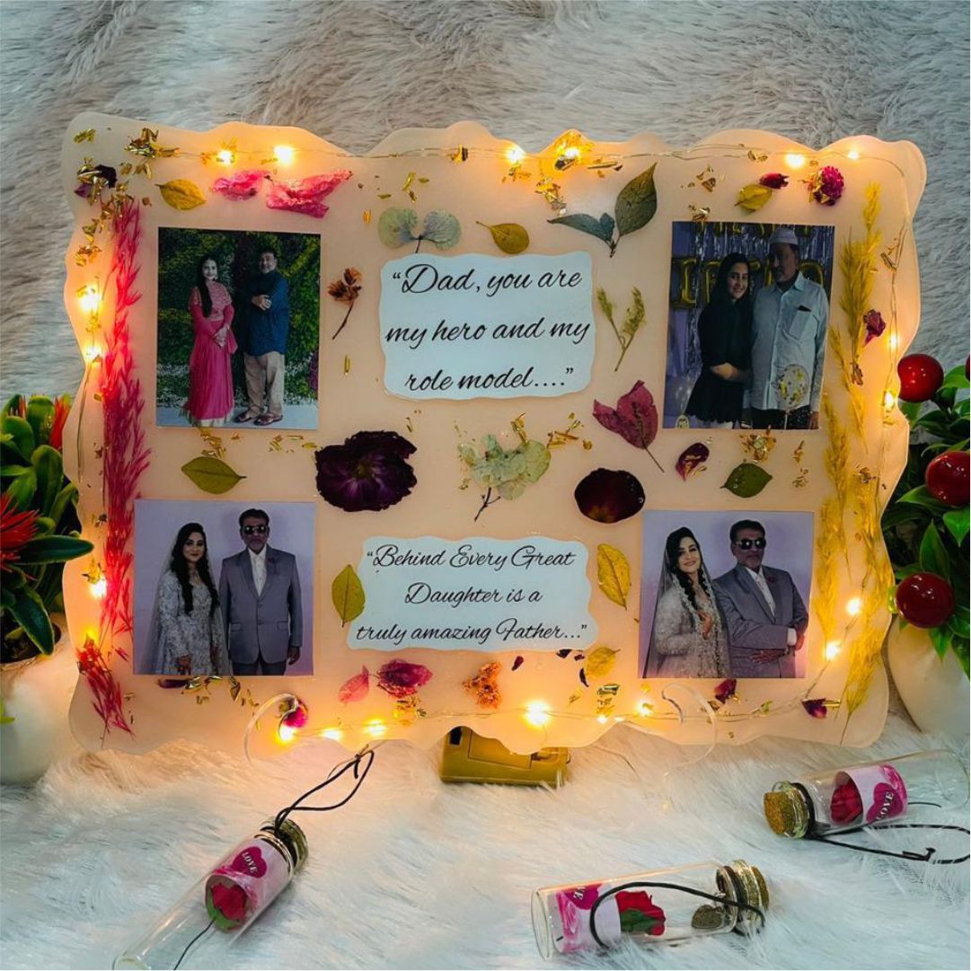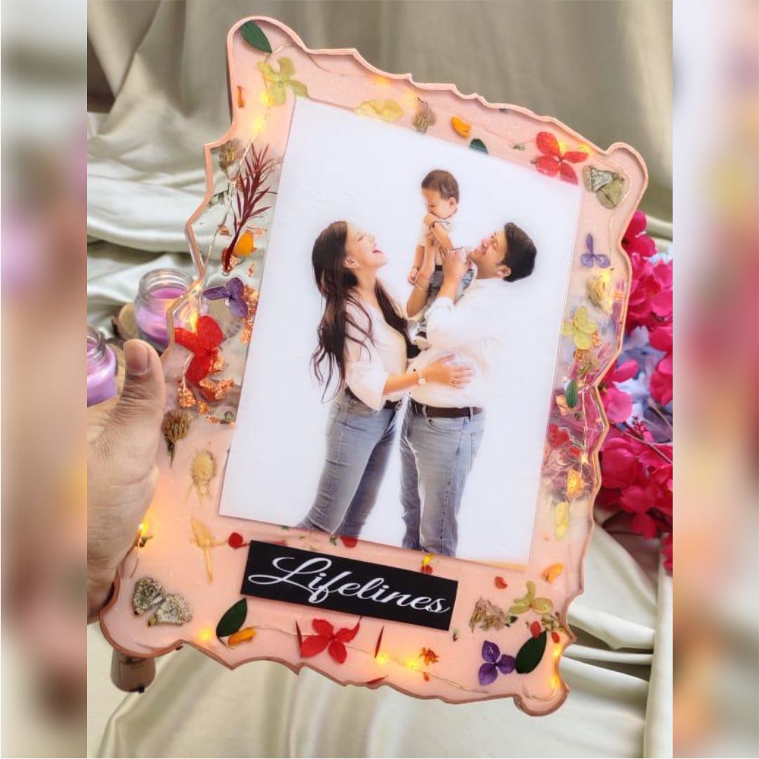 Decorate your house's table with this beautiful resin tabletop. It is a religious piece of resin art with cultural ethics. It has a vast border with golden foil outlined by golden paint and a wooden base.