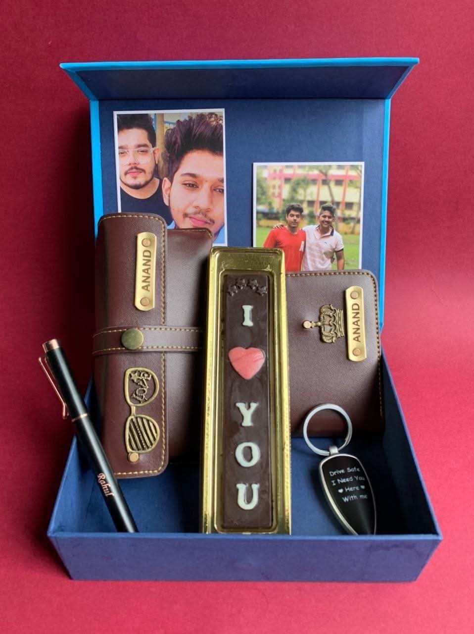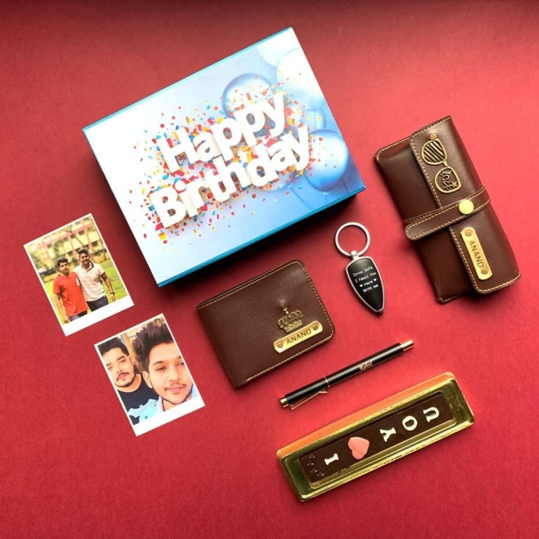 Garnish your love with the goodness of this sweet birthday combo. It includes 1 happy birthday box, 1 men's wallet, 1 eyewear case, 1 rose gold clipper pin, 1 drive safe LED keychain, 1 I ❤ you chocolate, and 2 customized pictures, making it extremely special for gifting.