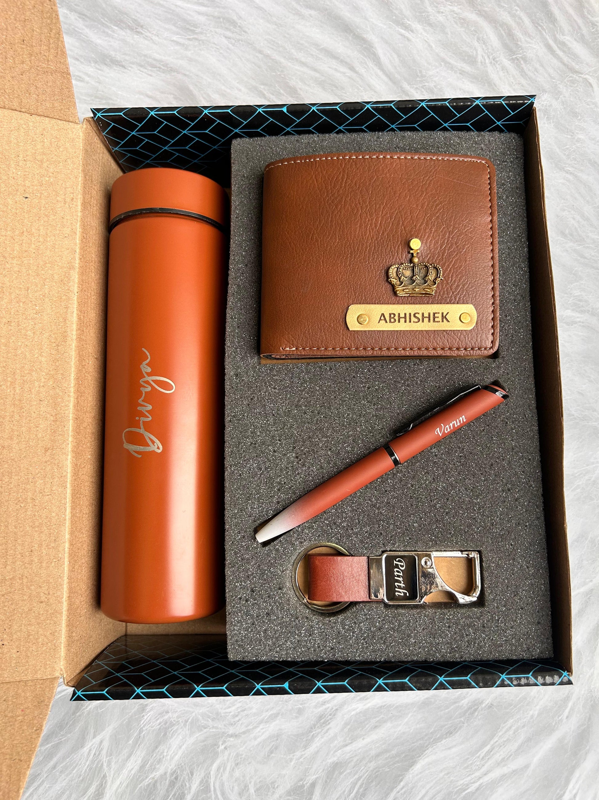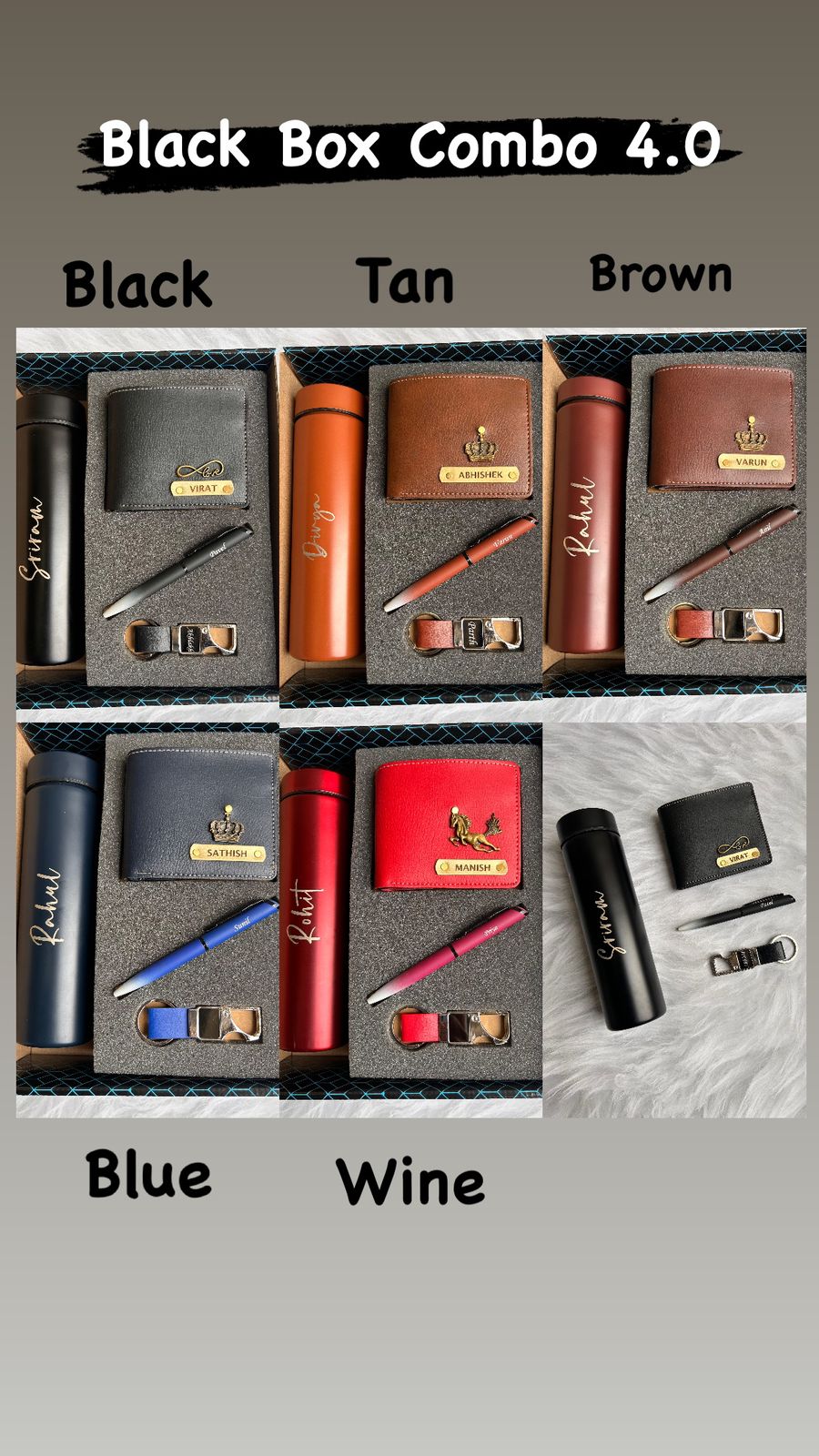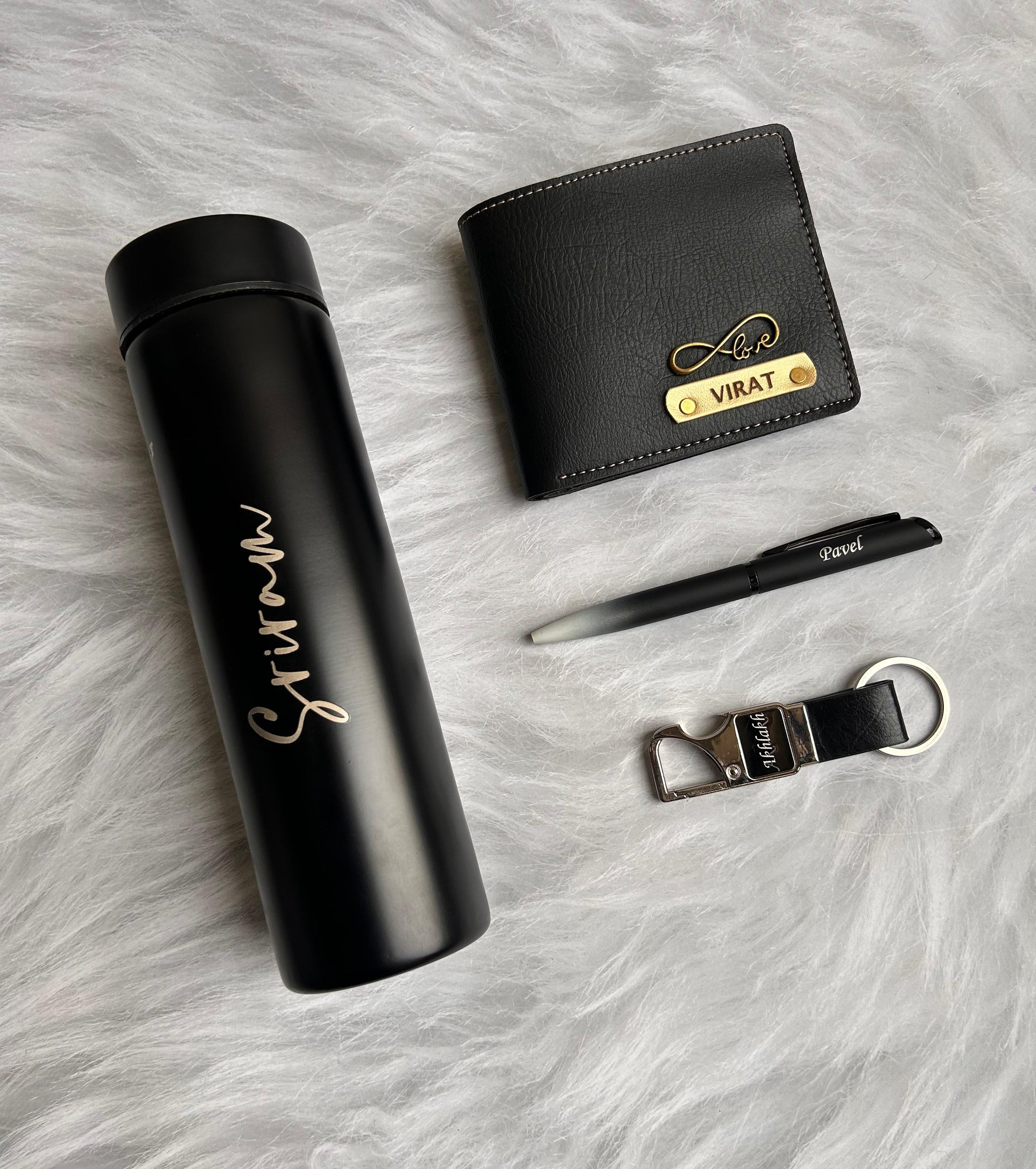 Assorted from our premium collection, we bring you an exclusive combo. It includes 1 men's wallet 1.0, 1 pen, 1 keychain, and 1 turbo bottle with your name customized on all items. It comes packed in a black premium box.