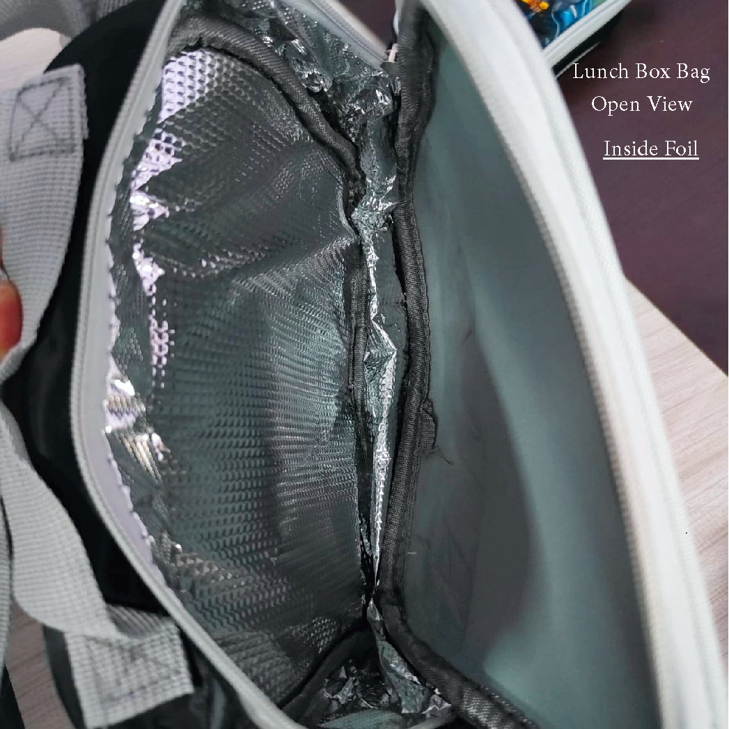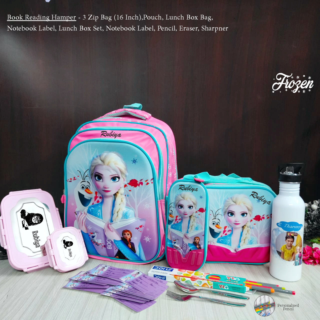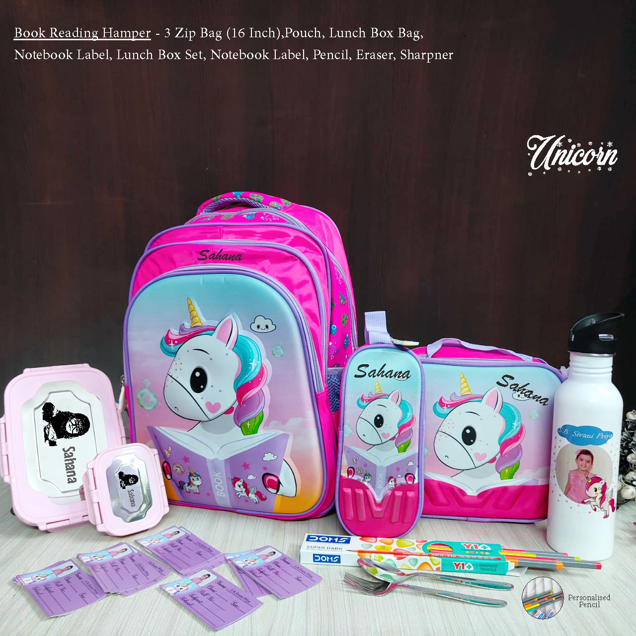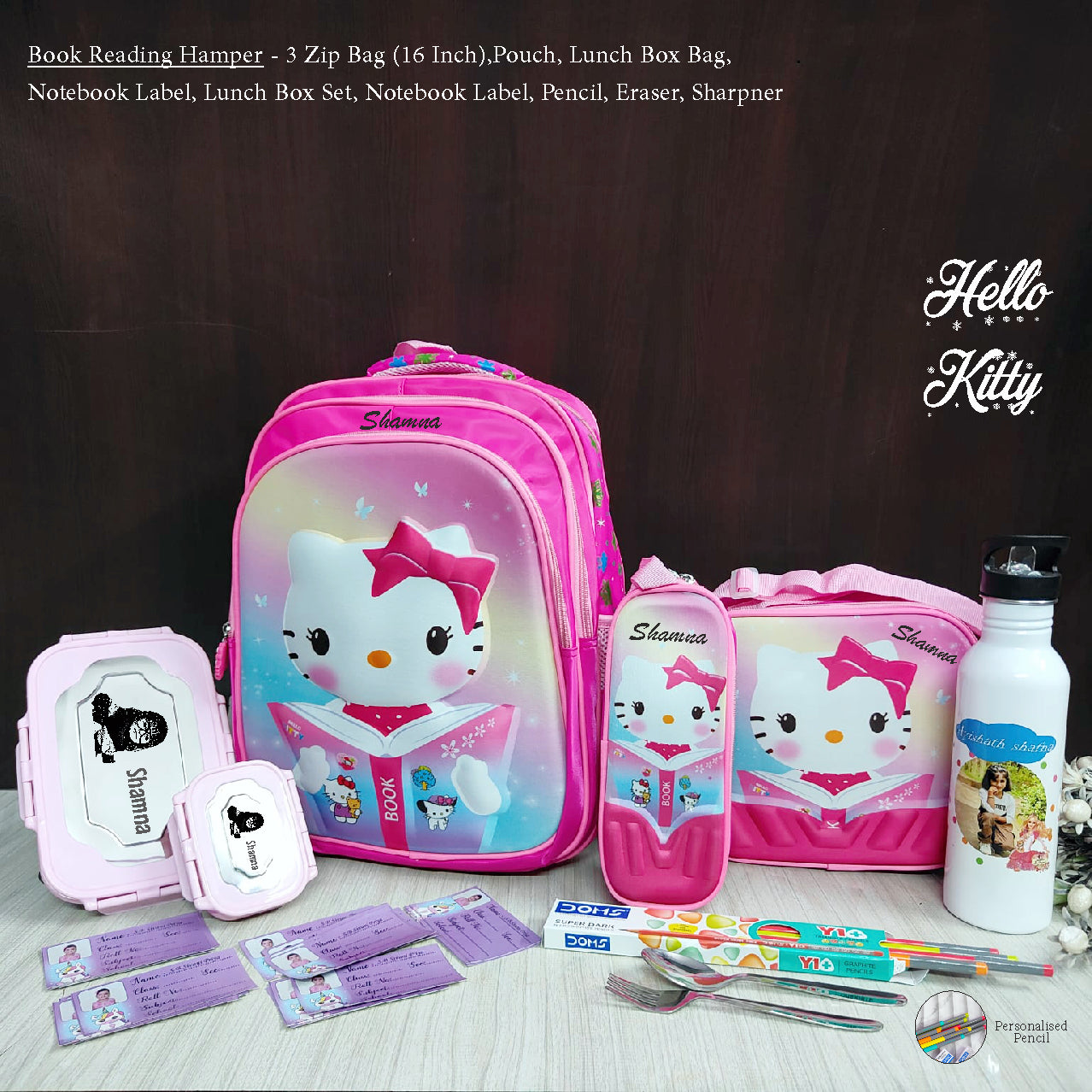 Scope of one name customized on bag, pouch, lunch bag, pencil, fork, spoon and one pic & name customized on notebook label, lunch box set & steel sipper.