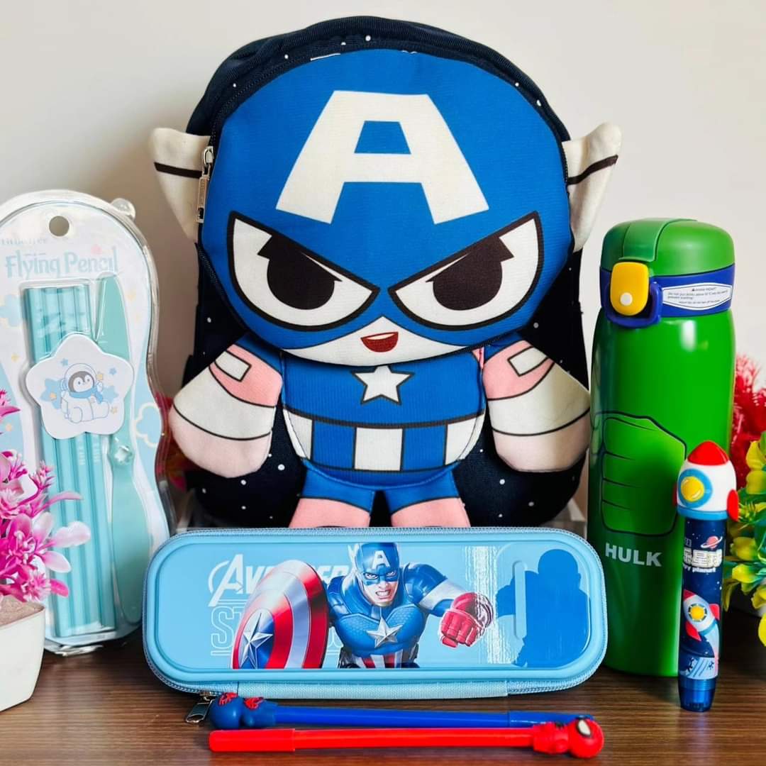Get ready for an action-packed picnic with our Boys Picnic Bag Combo! This set includes a 10-inch Captain America picnic bag, an insulated steel bottle, a pencil pouch, a pack of flying pencils, a push eraser, and 2 Avenger pens. Stay hydrated and organized while channeling your inner superhero. Perfect for young adventurers!