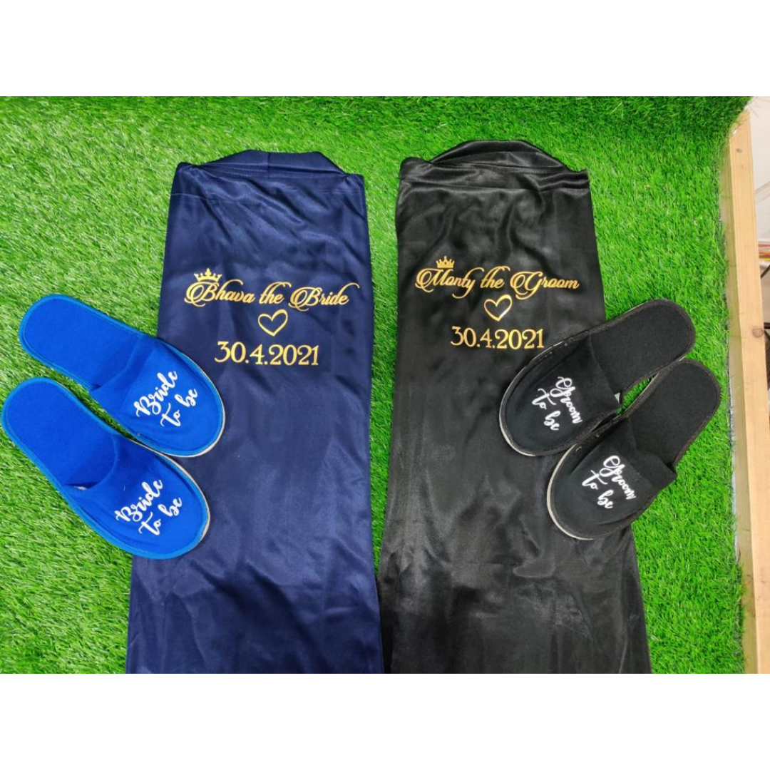 Ideal for gifting a newly engaged couple, a personalized satin robe with slippers. Get the bride's name and groom's name along with their marriage date designed on a bathrobe. Don't miss this price-worthy offer. Choose from a variety of colors and designs.