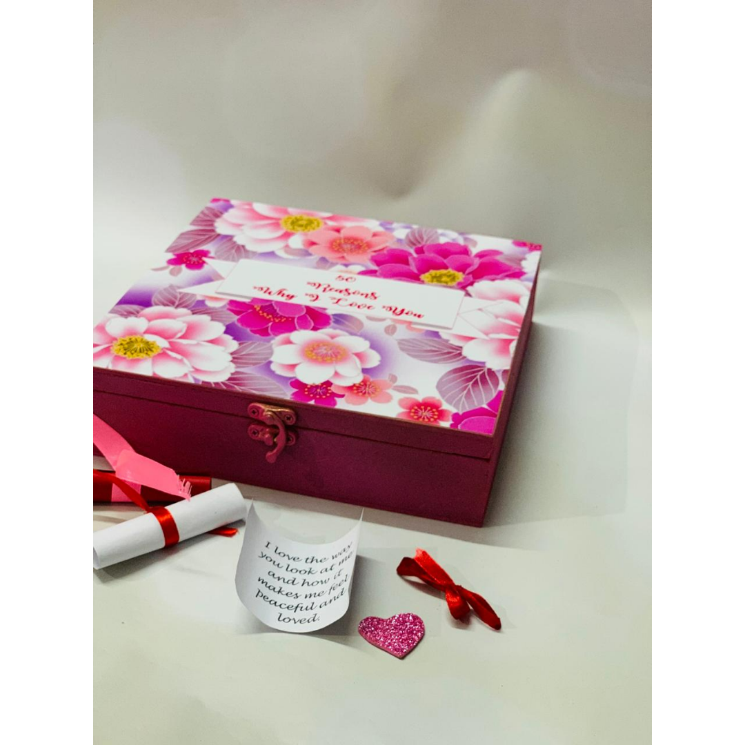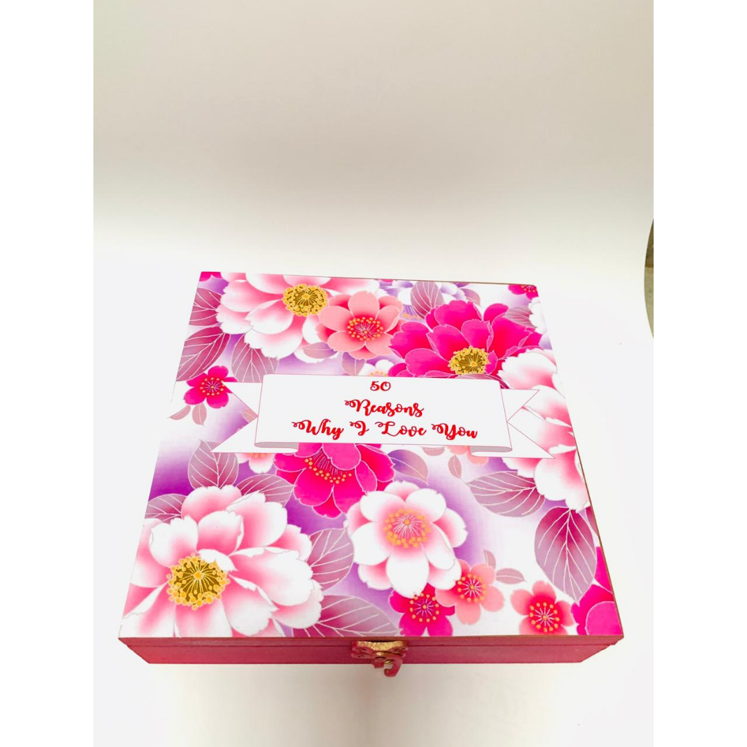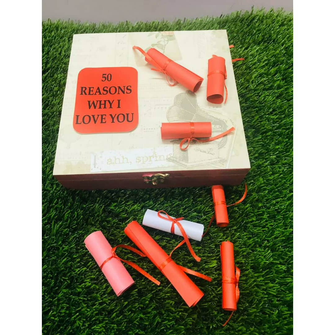 Amaze your loved ones with this unbeatable idea of expressing your love. It is an 8 inches wooden box topped with 2 photos and 50 text messages rolled up in beautiful colored paper. The theme and texts can Be customized according to demand.