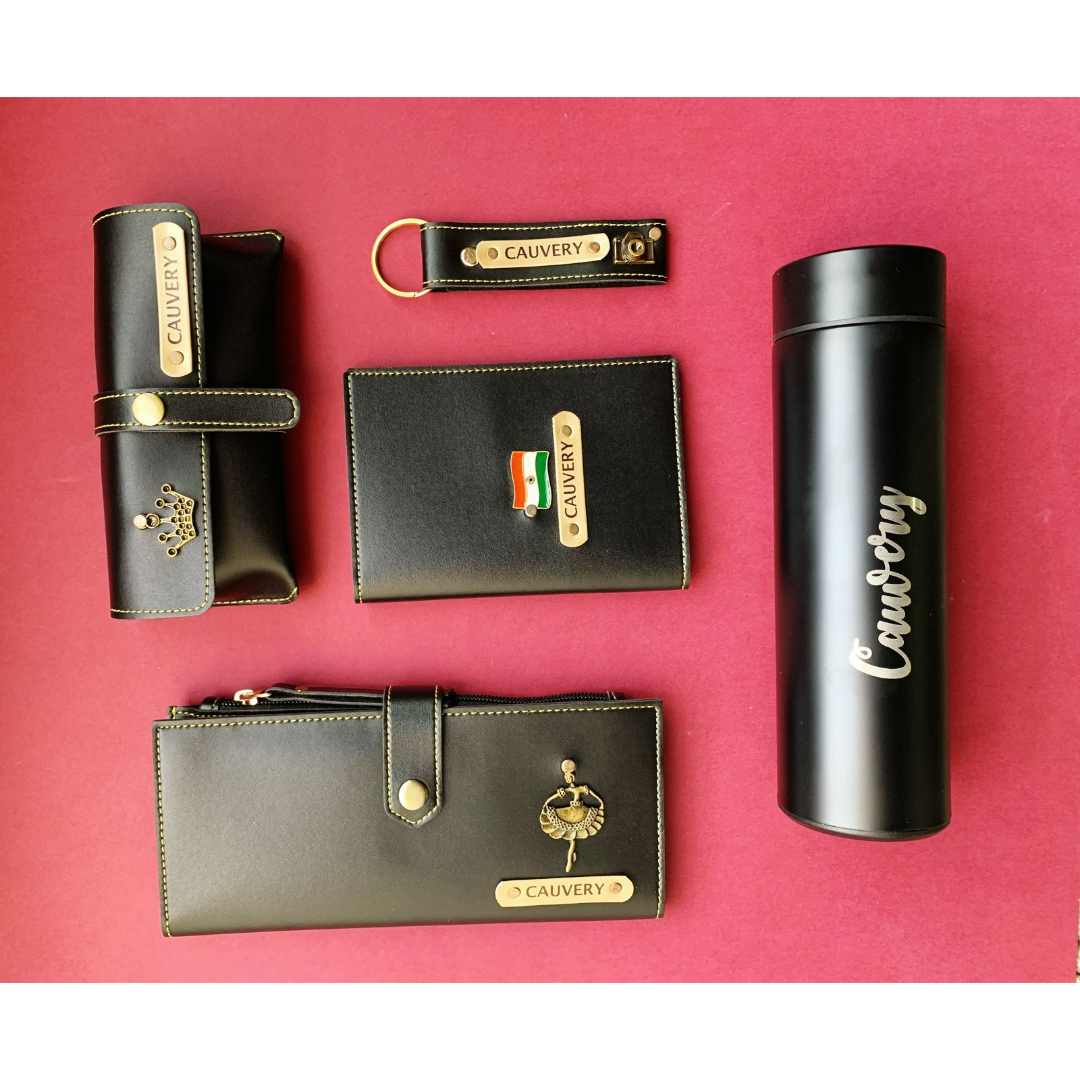 Surprise your lady love with our unique 5-in-1 women's combo. Inclusive of 1 black Led flask 3.0, 1 ladies wallet 3.0, 1 astonishing passport cover, 1 eyewear case, 1 keychain enclosed all together in one single box. It is available in 7 distinct colours ( color chart given).
