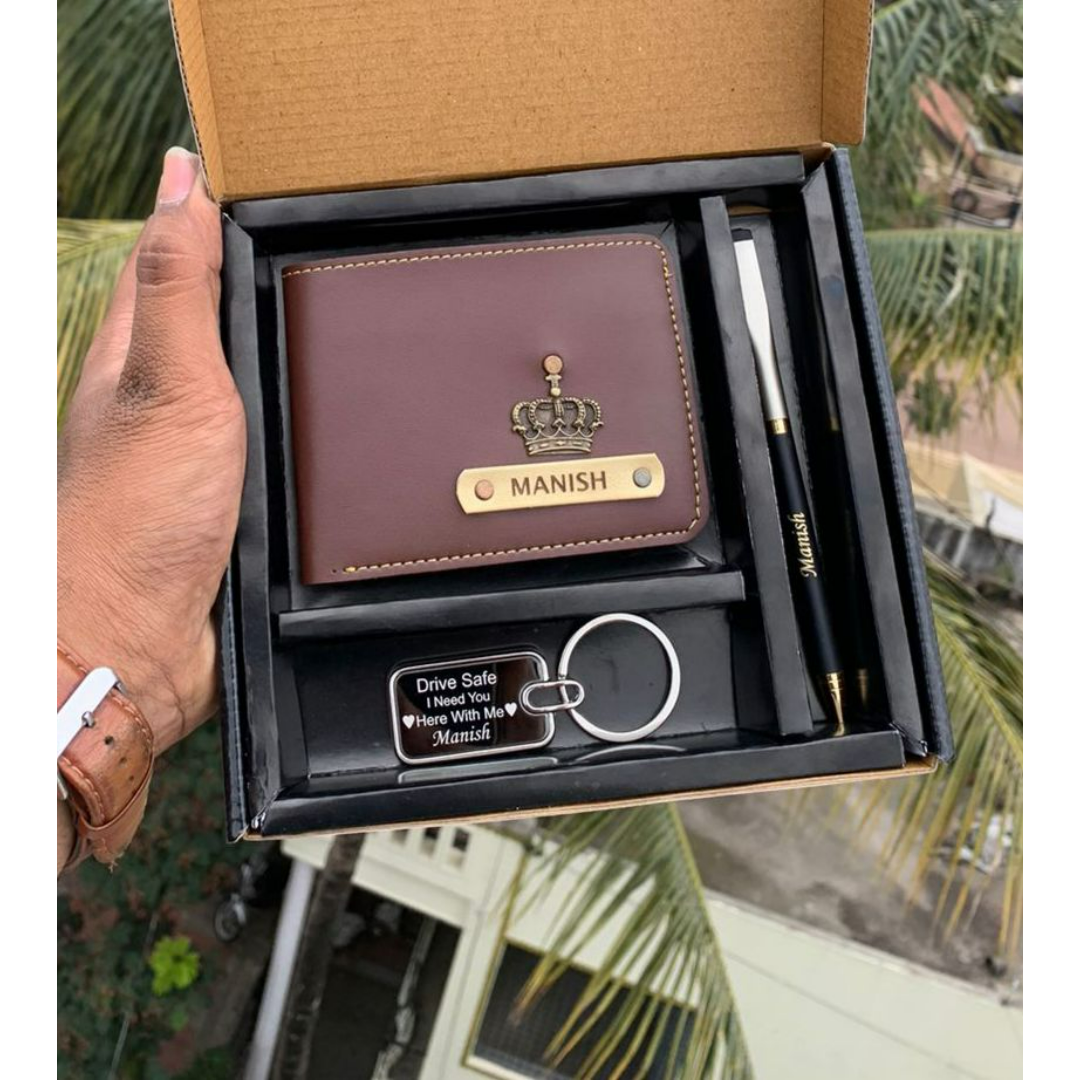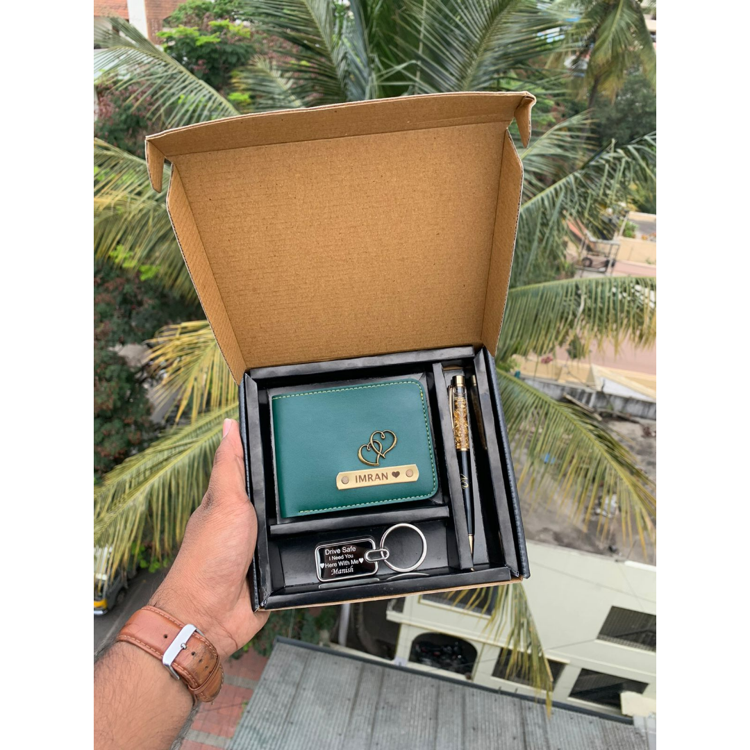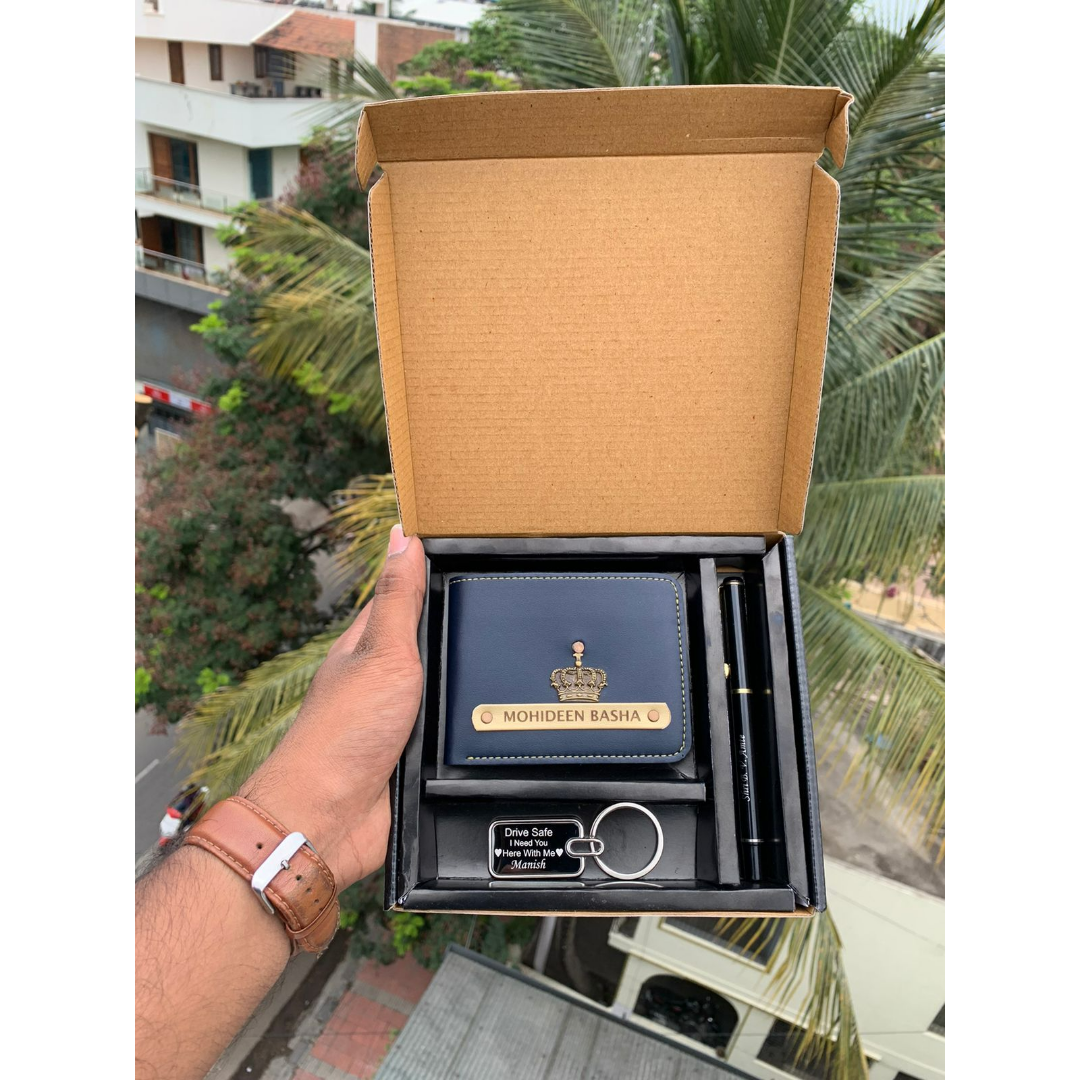 Present your charming ones with a special mini combo. It includes 1 men's customized wallet, 1 metal keychain, 1 customized pen (choose from the given charts) and comes in a premium box. It is a price-worthy item and looks awesome to gift.