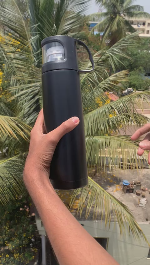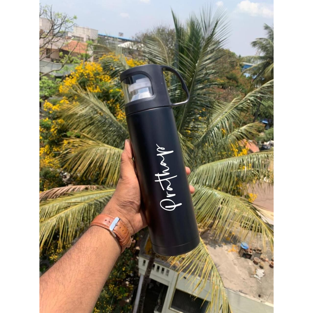 Unbox happiness with this hot and cold flask. It is a stainless-steel insulated bottle that keeps the liquid hot and cold for up to 6 hours. Customize it with your name and enjoy your drink.
