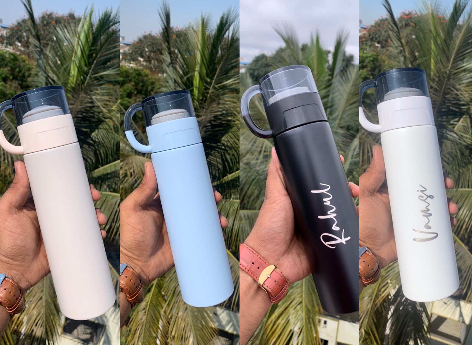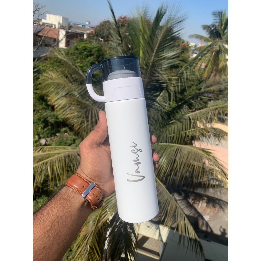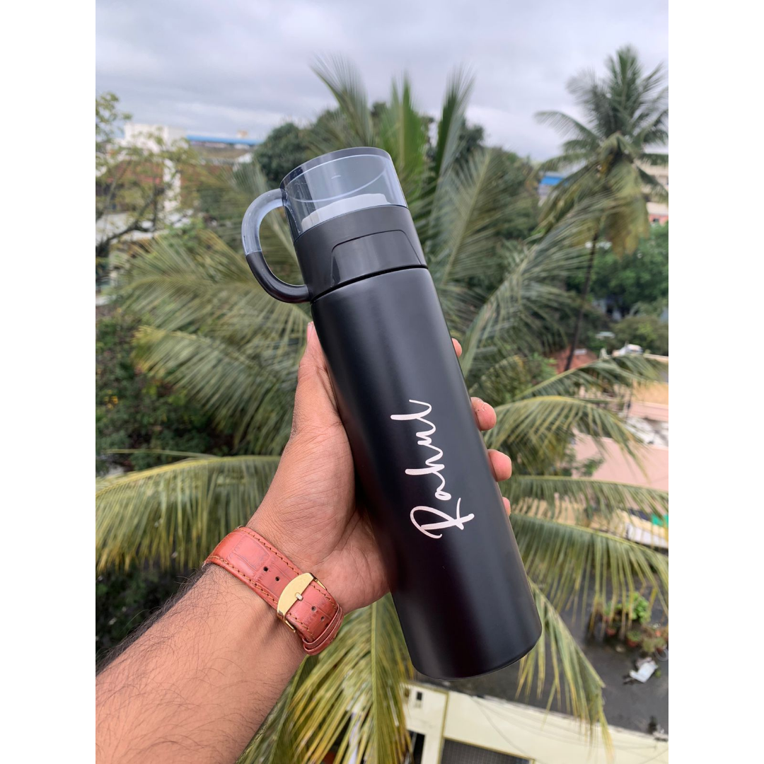 A uniquely crafted modern design flask that holds up to 500 ml of water. It is made with high-quality stainless steel and can keep the liquid hot/ cold for up to 8 hours. Engrave your name on one side of the flask and make it look different.