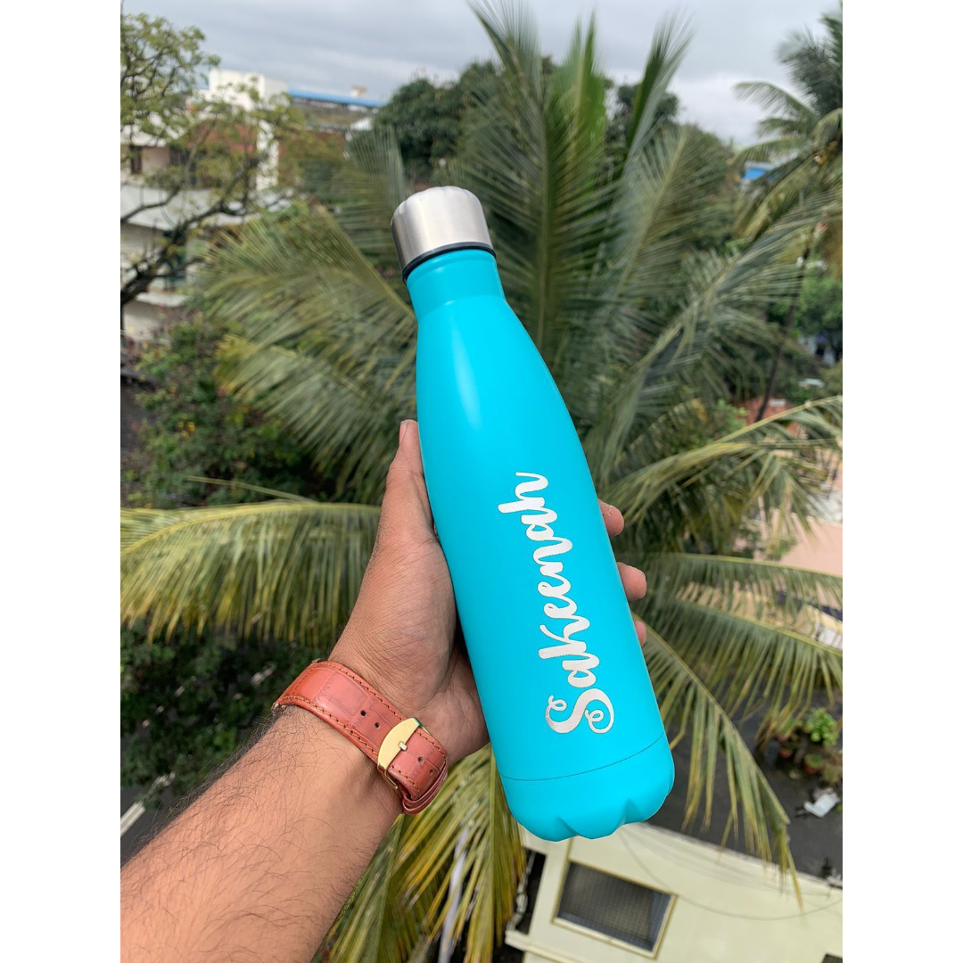 Get your customized name hot & cold flask, made up of stainless Steel & leak proof. It can hold up to 500 ml of water and is ideal for the gym, yoga class, dance class, etc. Customize with name & is available in 3 colors, Black, red, and teal blue.