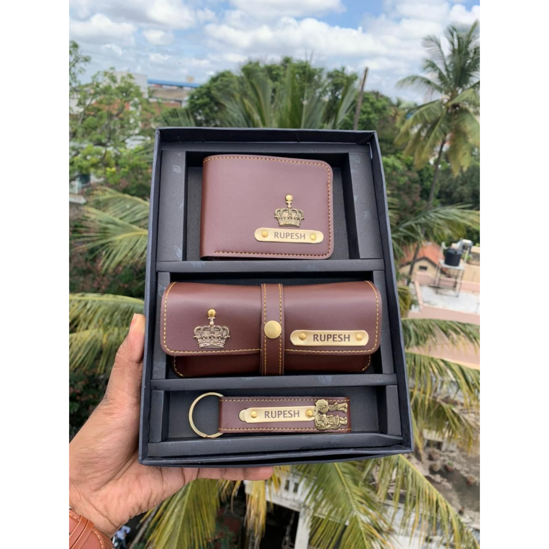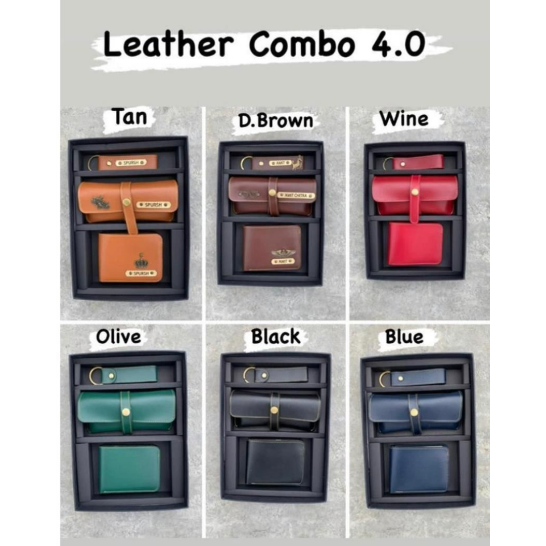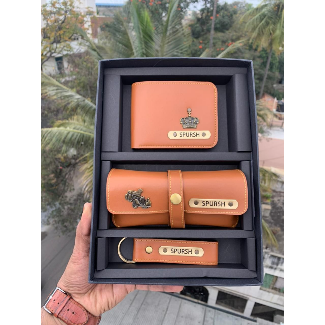 We believe that sharing happiness with someone special doubles its value. Gifting ready-made products is common, but customizations make it unique. This leather combo includes 1 men's wallet, 1 eyewear case & 1 keychain. It comes with a wide range of colors too & a box.