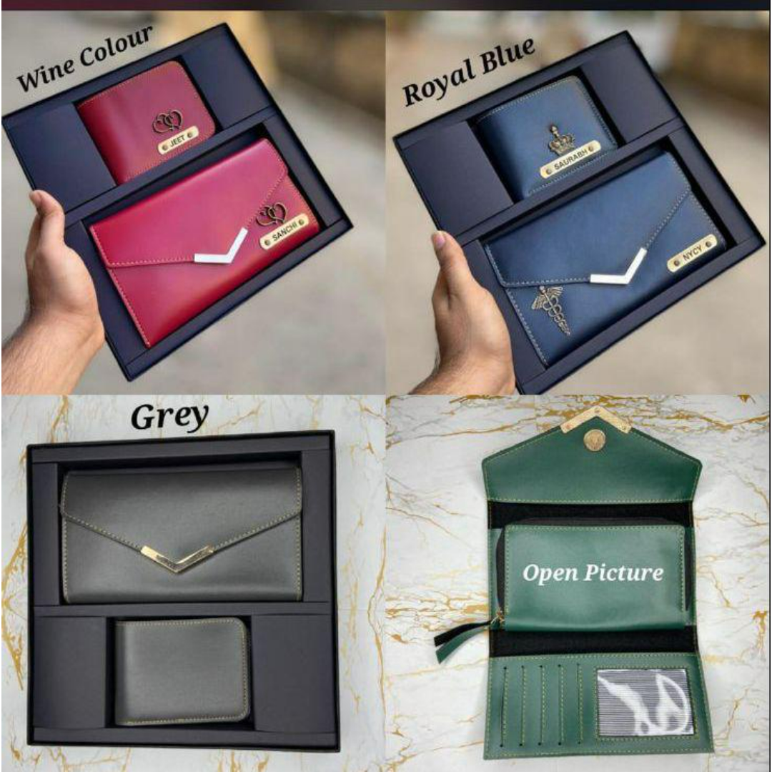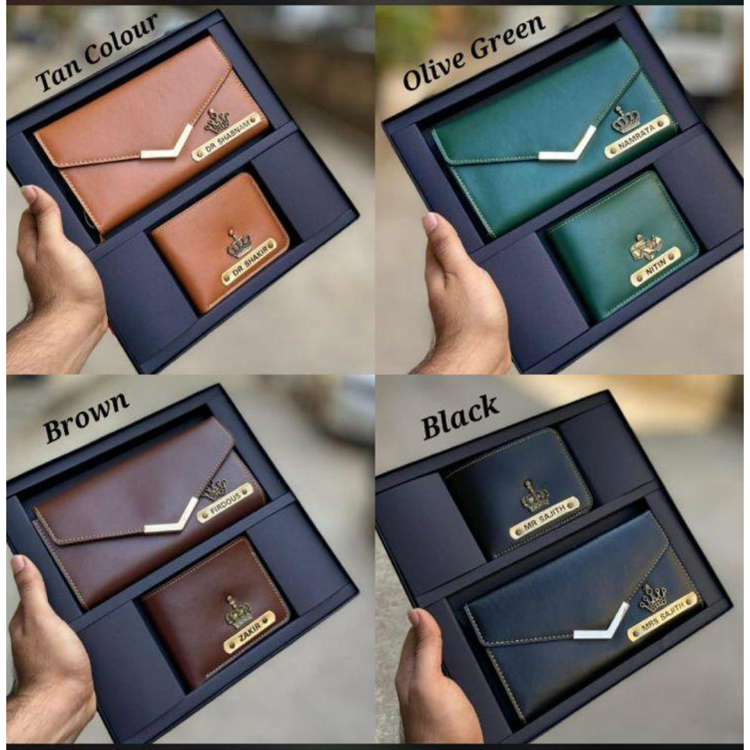 We believe that sharing happiness with someone special doubles its value. Gifting ready-made products is common, but customizations make it unique. This leather combo includes 1 men's wallet 1.0 & 1 ladies' wallet 1.0 with a customizable name on it, A wide variety of colors are available & it comes with a premium box too.