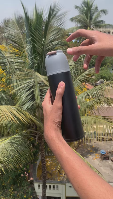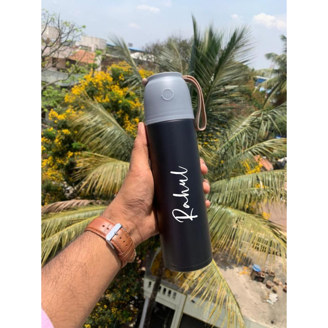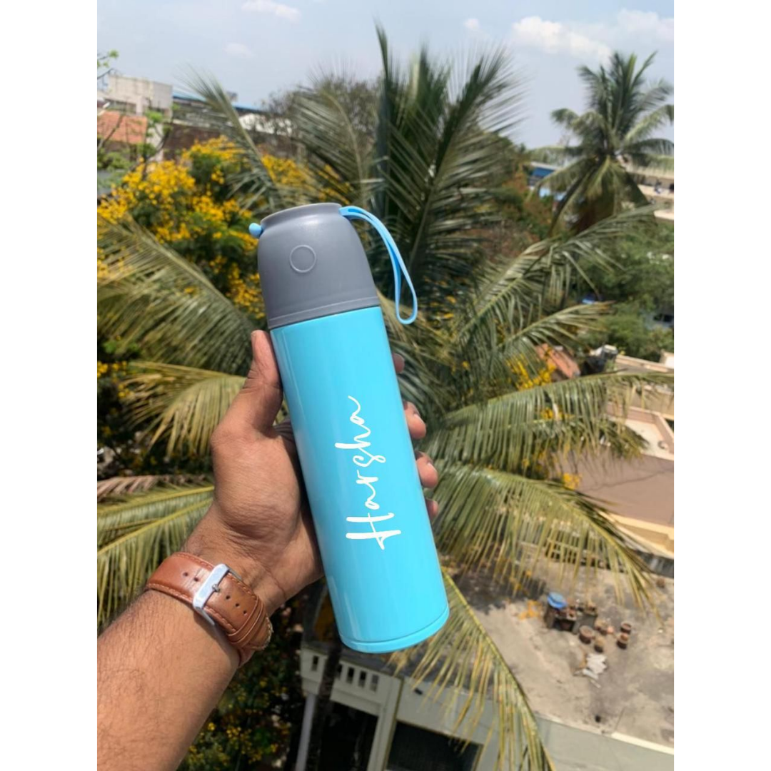 Stay updated with the hot and cold flask's latest versions. It comes with a rubber string on the cap. It can be customized with your name and can hold up to 500ml of water. Order Now. Available in Black & Sky-Blue color.