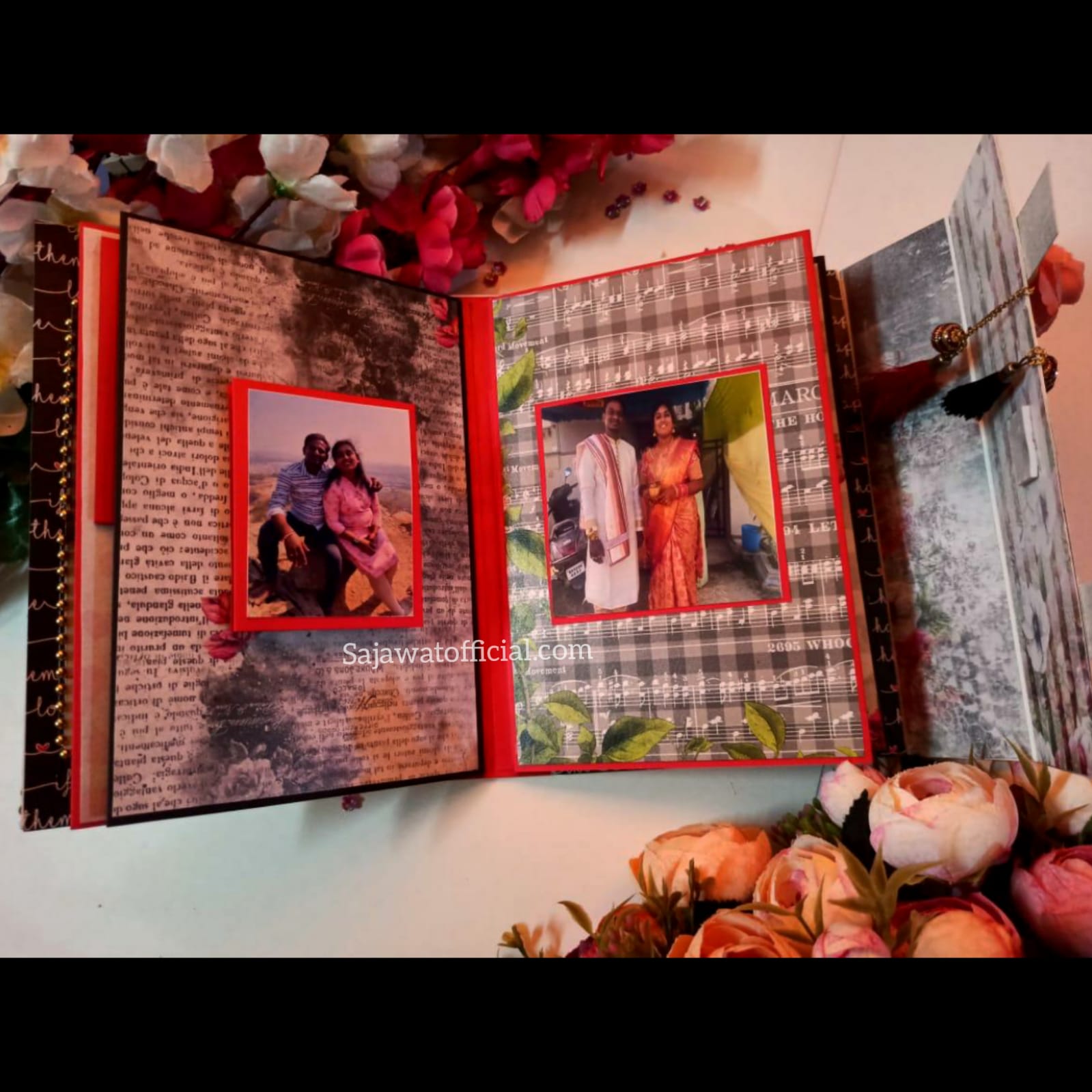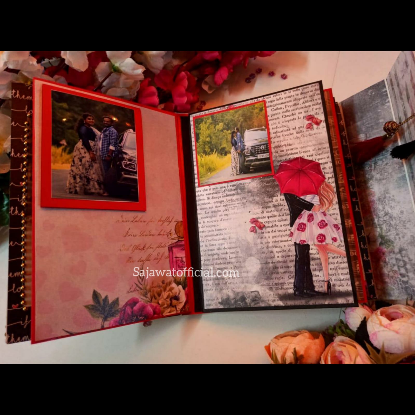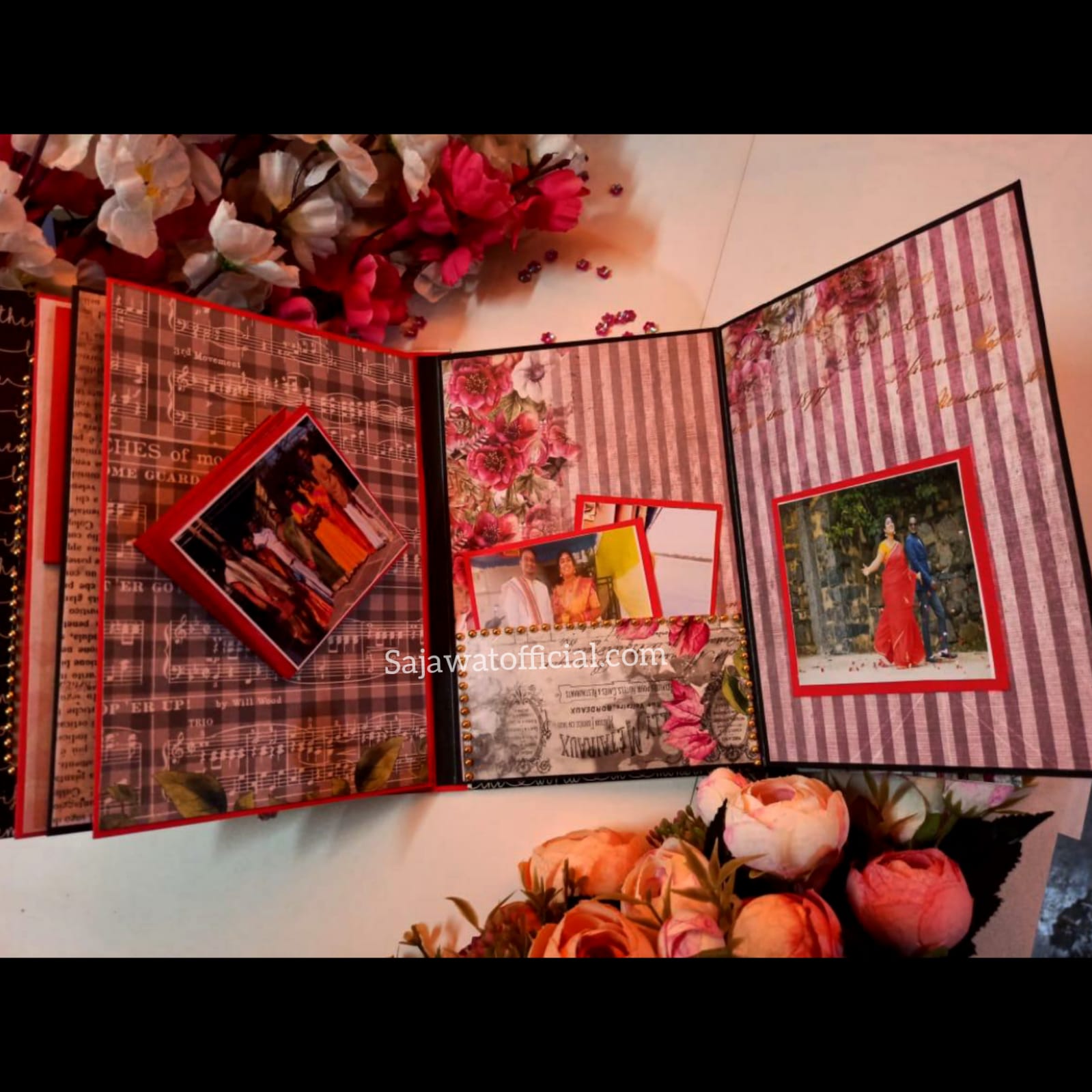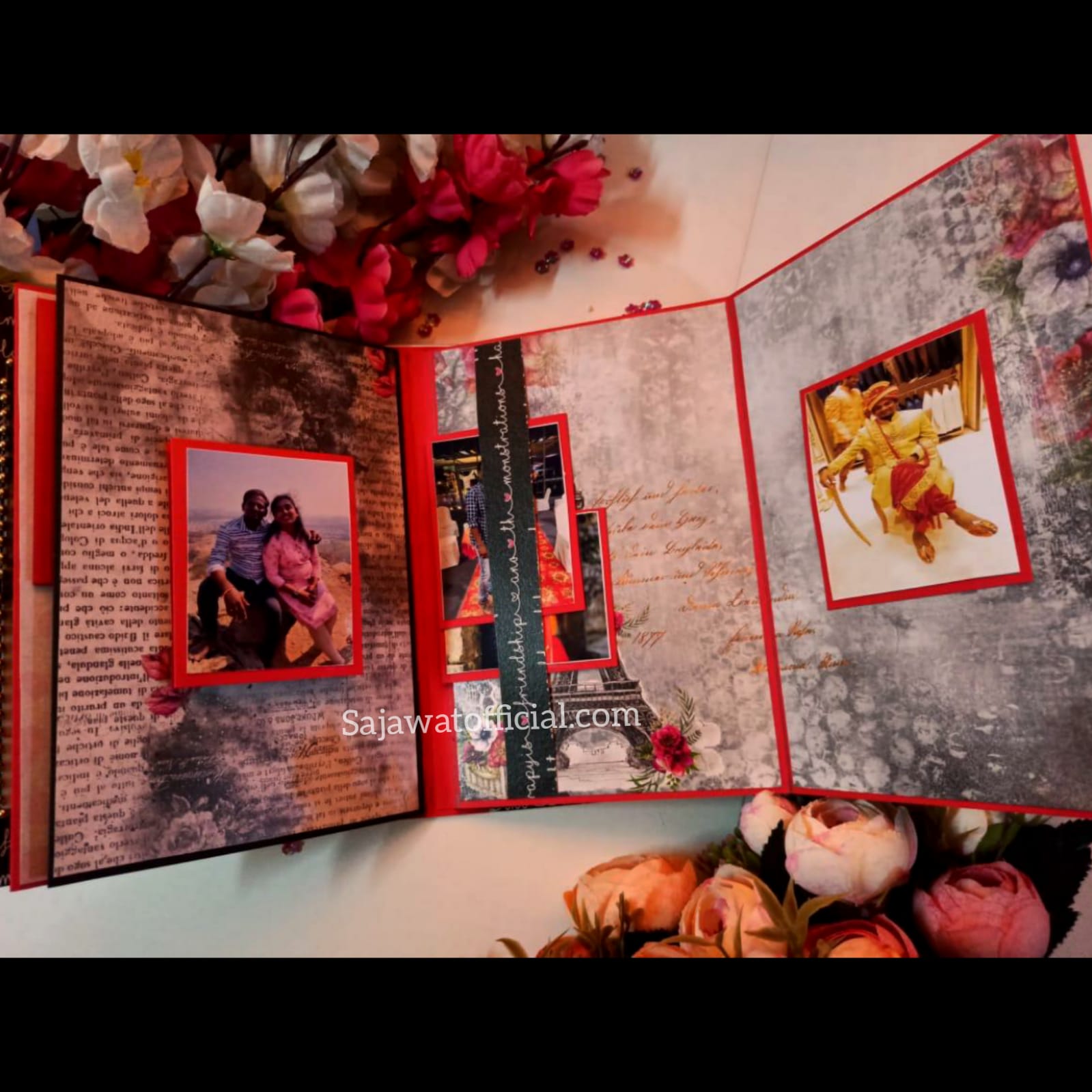 Unbox happiness with this premium suitcase album. It is specially handcrafted, with different designs, like flip folds and small pockets, using printed papers with a customized theme, handmade flowers, and chains to give it a fascinating look.