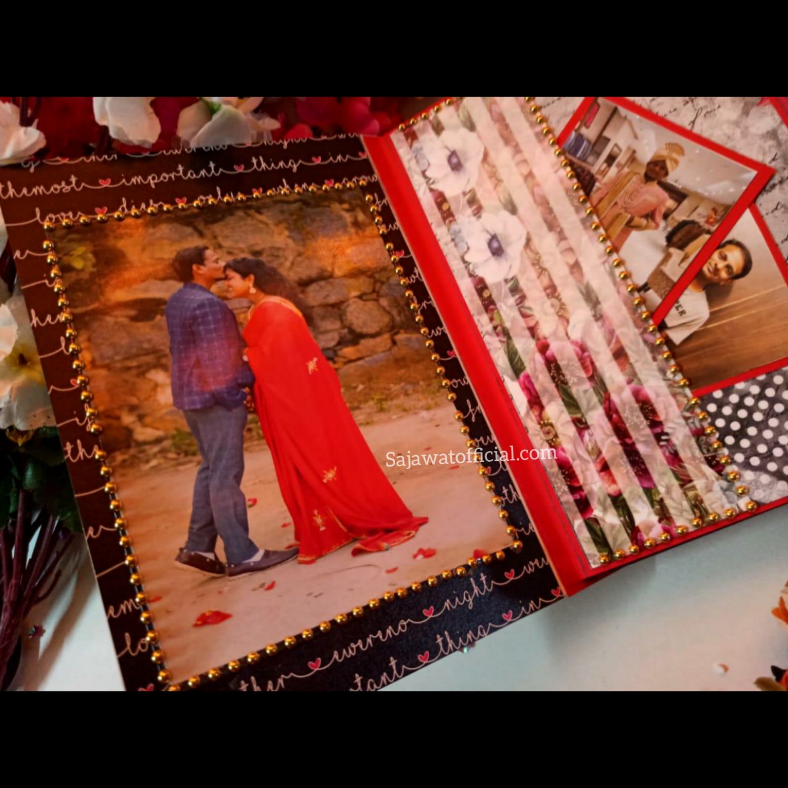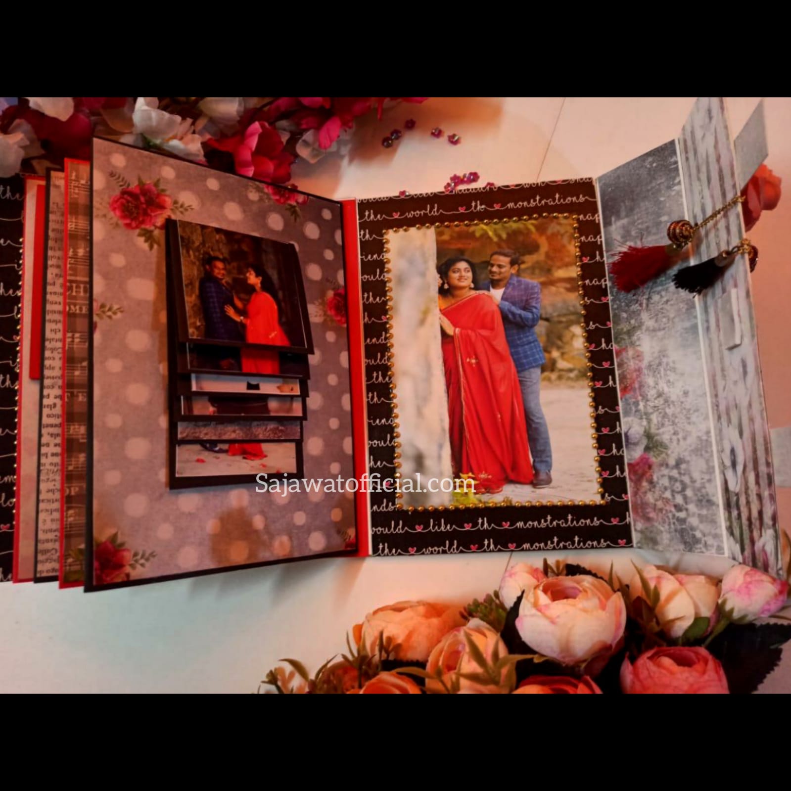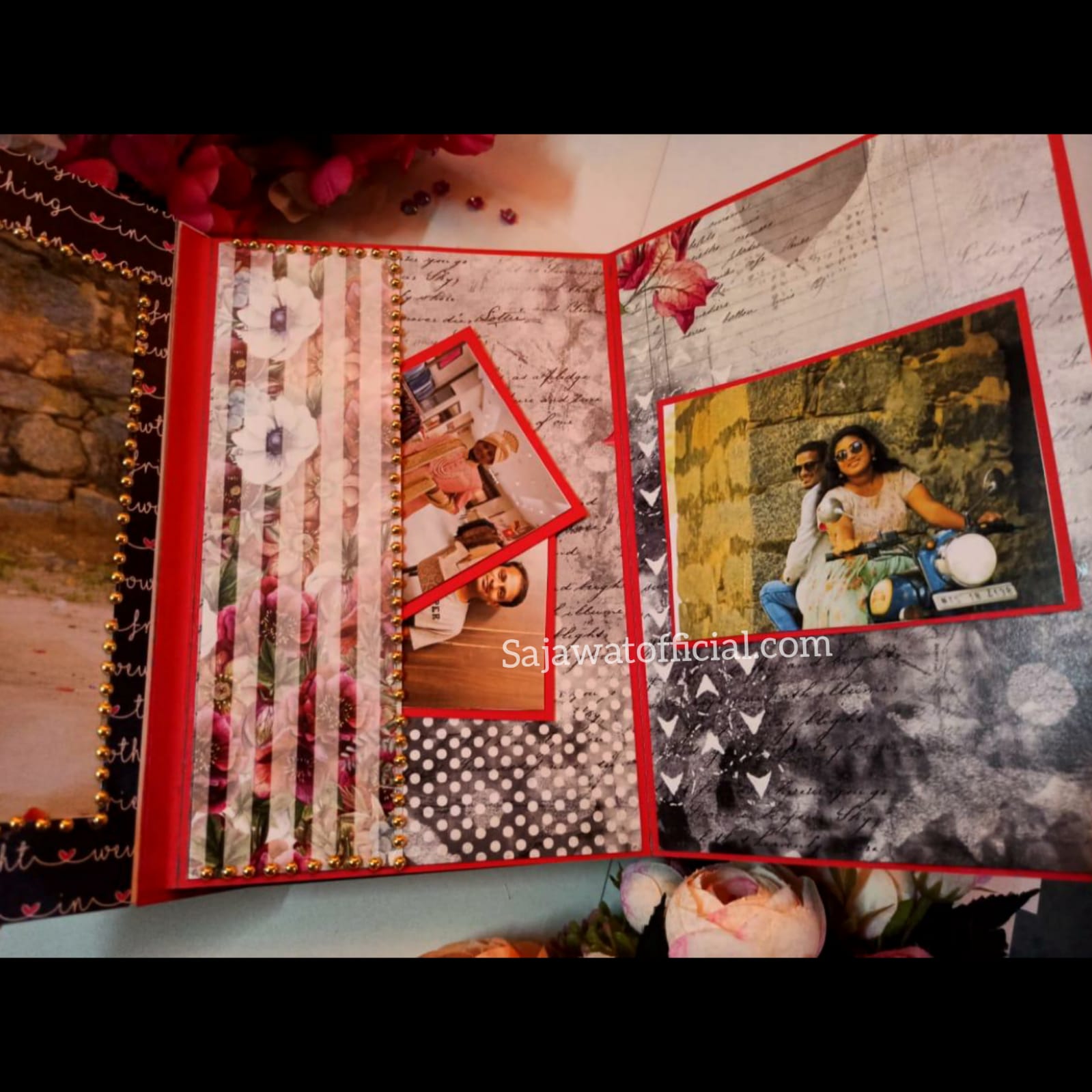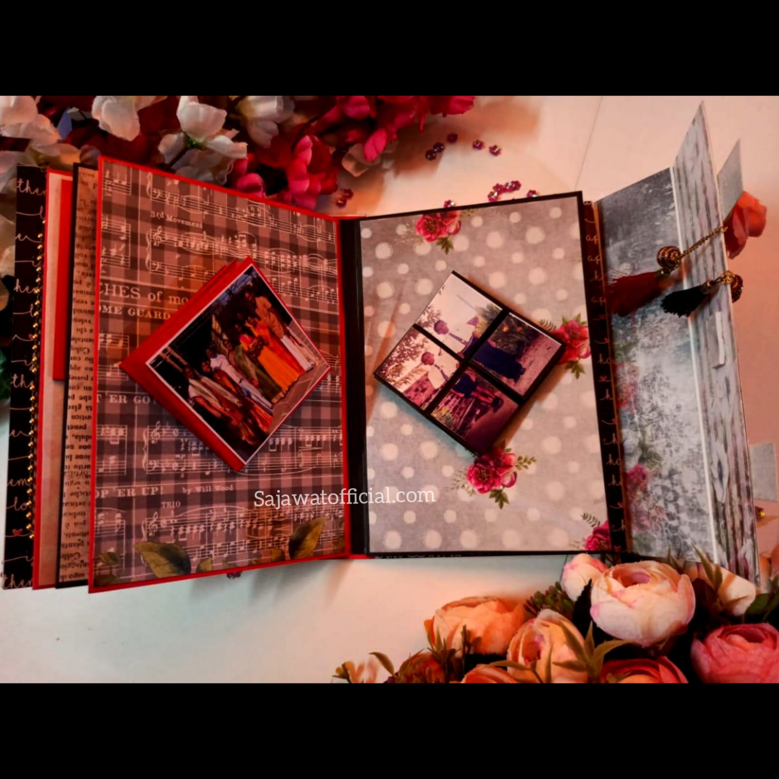 Unbox happiness with this premium suitcase album. It is specially handcrafted, with different designs, like flip folds and small pockets, using printed papers with a customized theme, handmade flowers, and chains to give it a fascinating look.