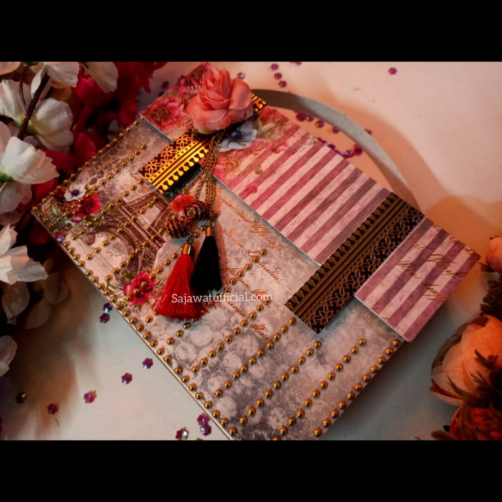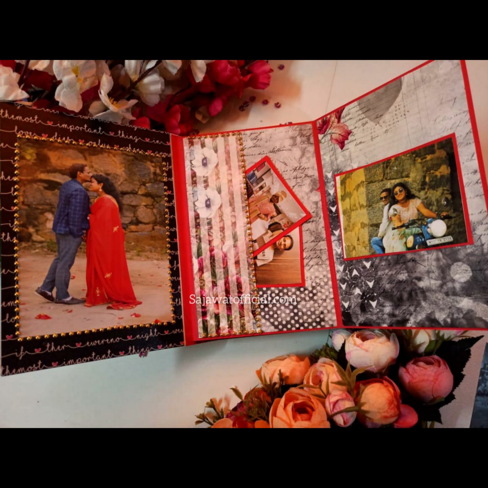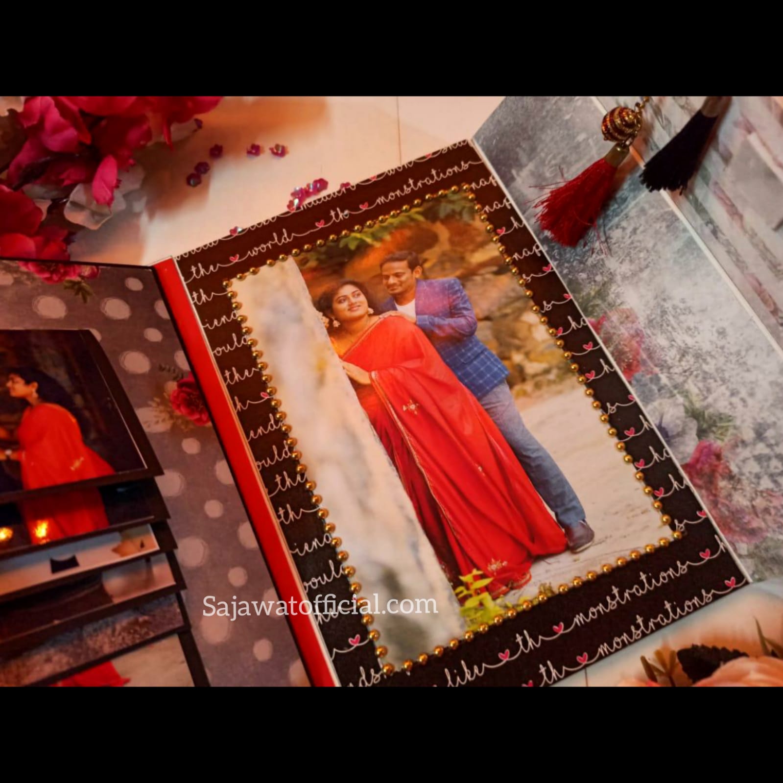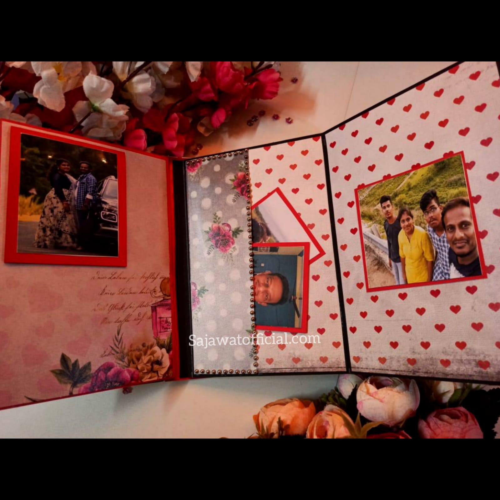 Unbox happiness with this premium suitcase album. It is specially handcrafted, with different designs, like flip folds and small pockets, using printed papers with a customized theme, handmade flowers, and chains to give it a fascinating look.
