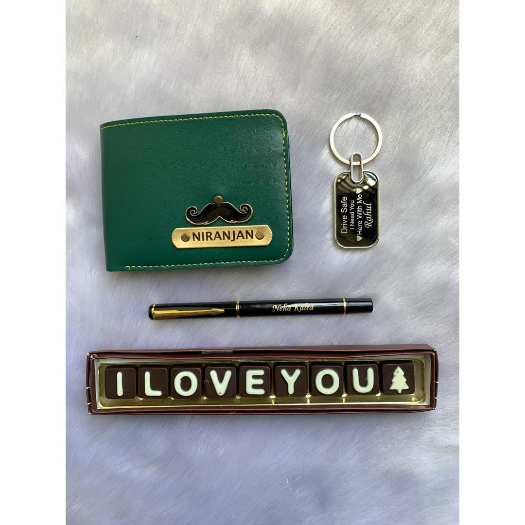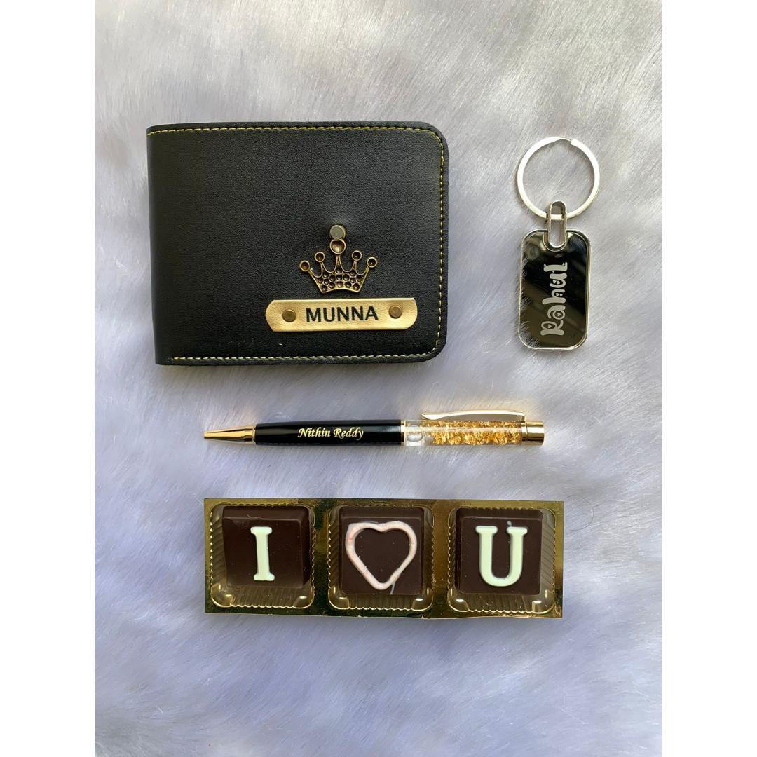 Looking for something unique yet significant to present. We bring you a special mini combo. It includes multiple gifts like a customized men's leather wallet, 1 customized Pen (choose from the given charts), 1 customized metal key chain, and 1 sweet chocolate (I LOVE YOU / I💓U) all in a box. It is ideal for gifting purposes.