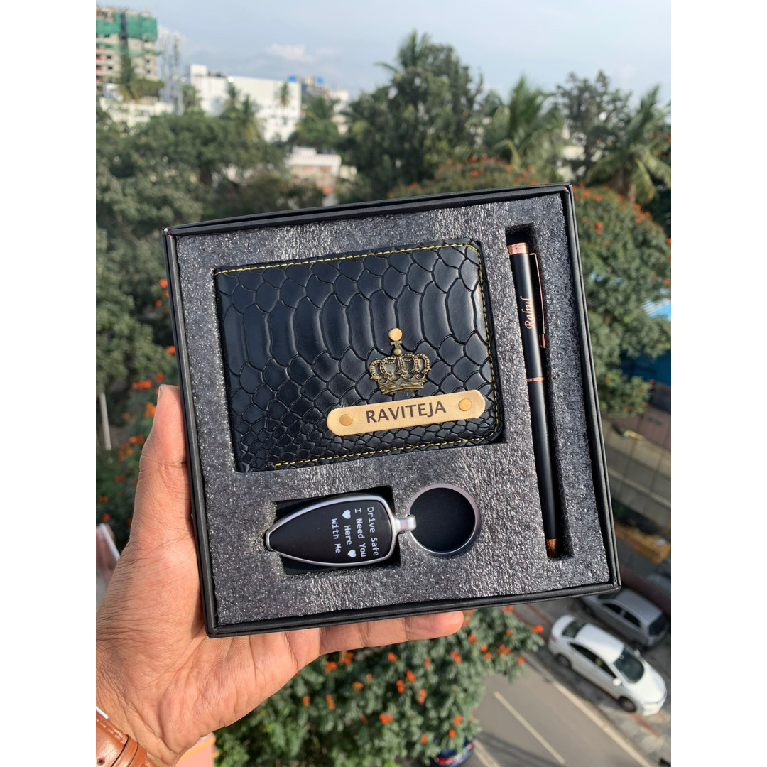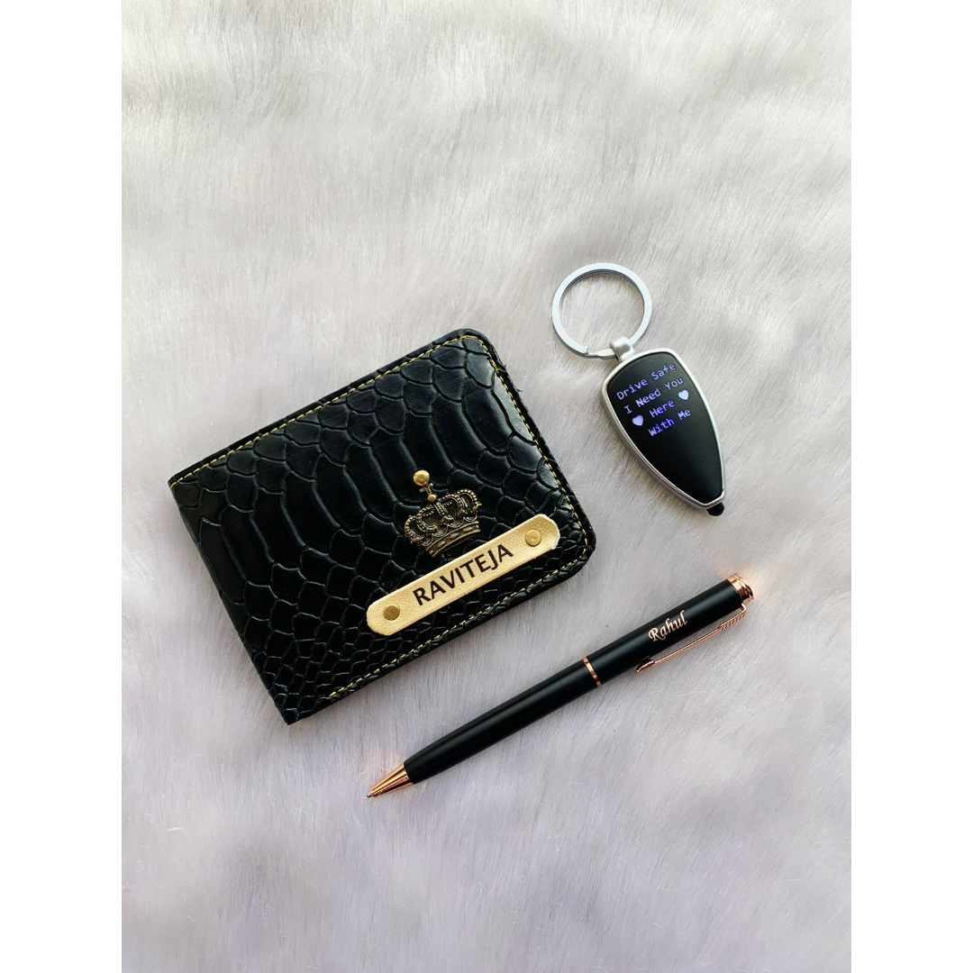 Unbox happiness with an exclusive mini combo that includes our aesthetic collection of Customized croc wallets, 1 LED keychain, and 1 metal pen (choose from the given charts). A common name can be customized on all 3 products, and it comes packed in a ready-to-gift box.