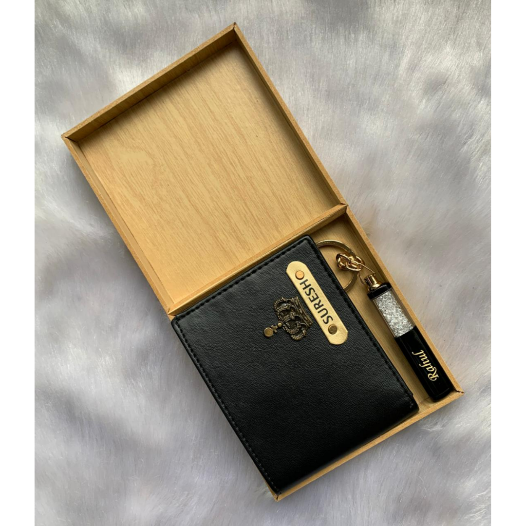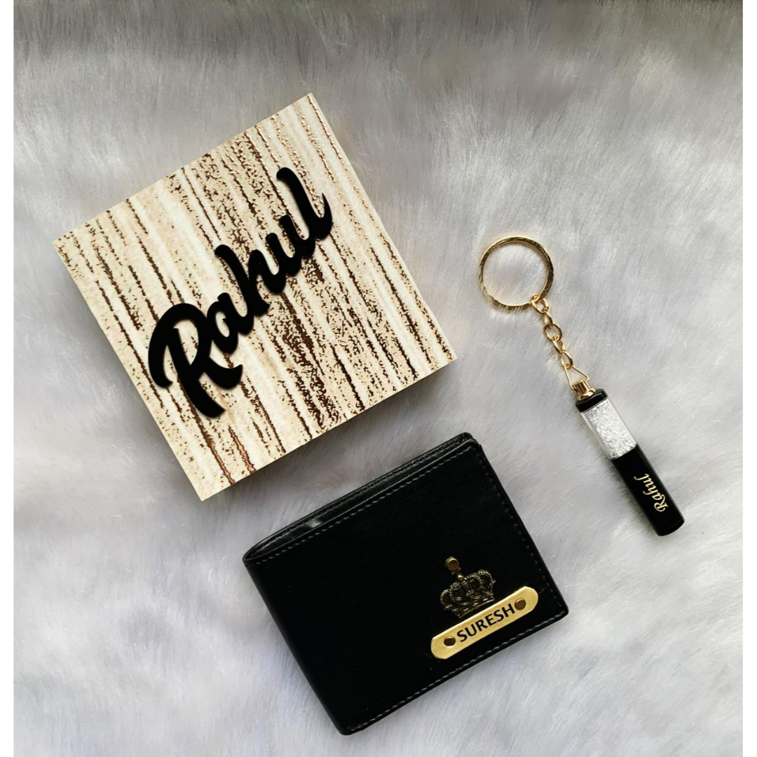 We bring you a bundle of joy to celebrate your priceless moments with mini combo 9.0. It includes 1 4D acrylic name on the box, 1 men's wallet 2.0, 1 Baleno keychain, and 1 wooden box with one single name customized on all 3 products. All these kinds of stuff come in 1 box ideal for gifting purposes.