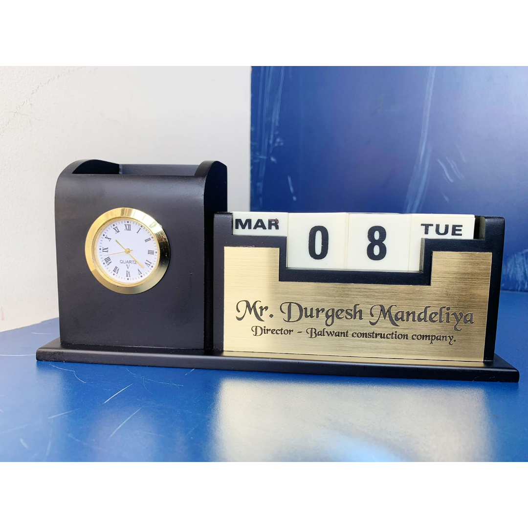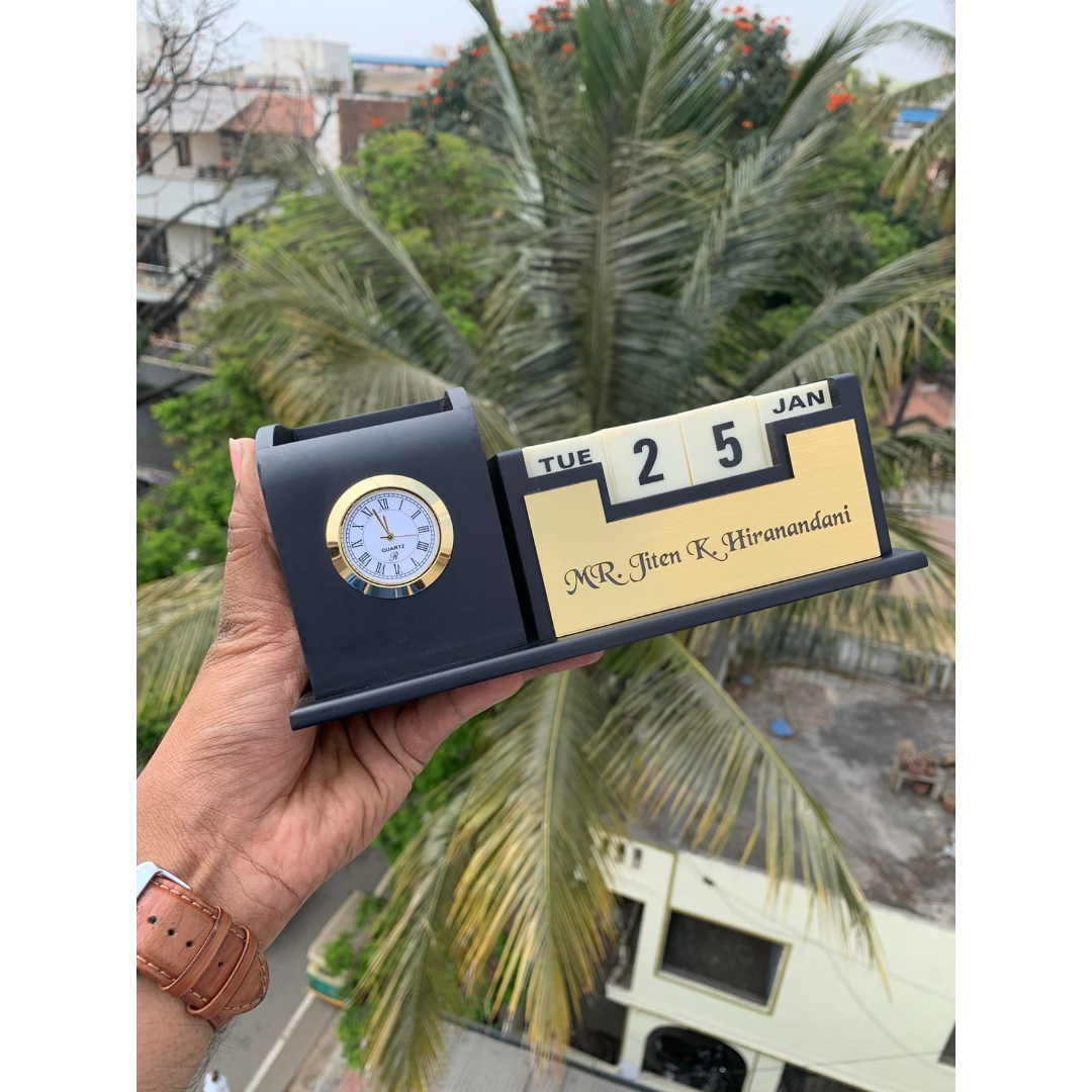 An ideal gift for office employees, this penstand 4.0 is a smartly designed piece. It carries a small clock, with enough space for stationary a designed calendar for date, month, and day small section to hold mobile phones, and a customized name plate with your position mentioned.