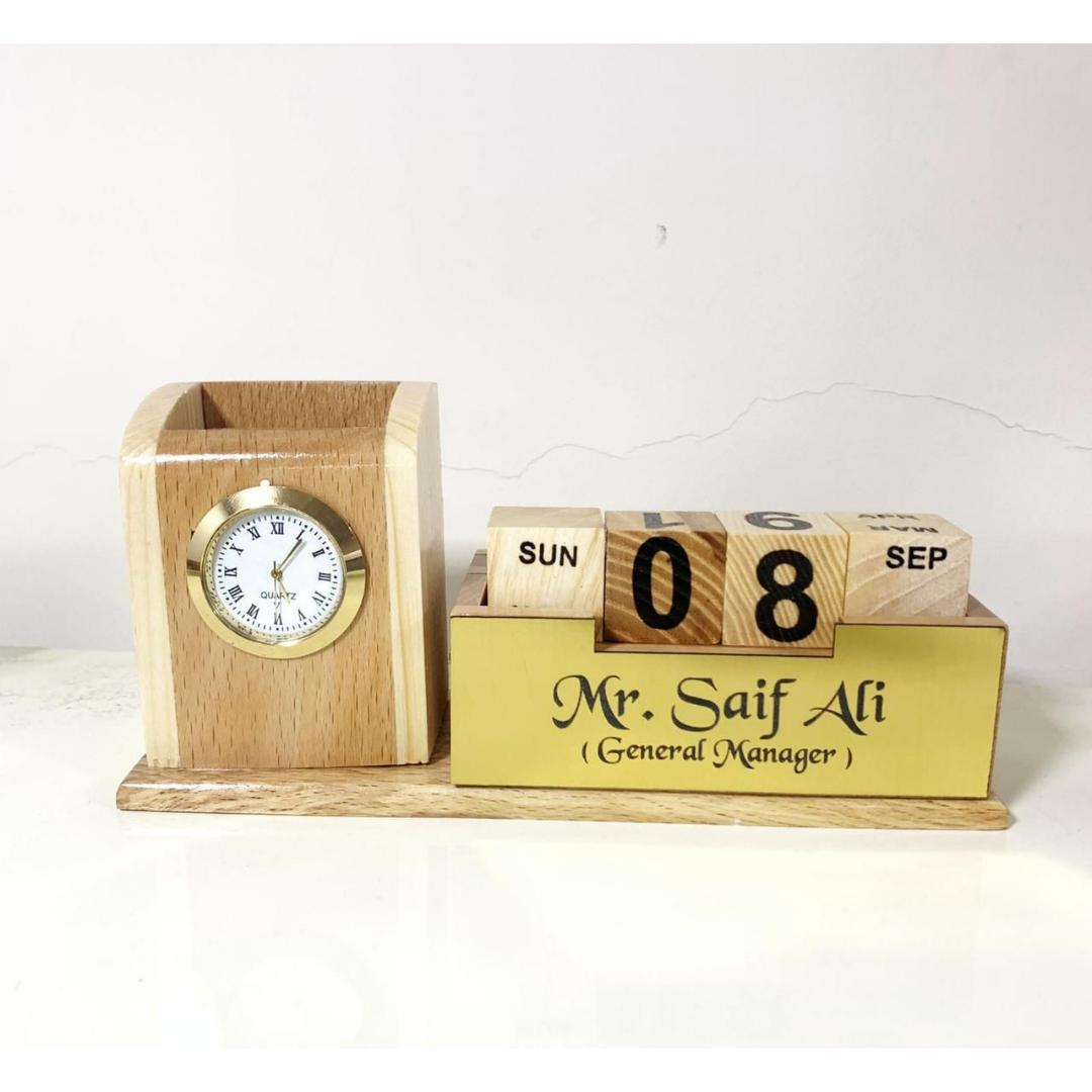 No space to keep stationery? Get a price-worthy Pen stand now! This pen stand comes with an in-built calendar of date, month & day, a clock, a separate space for holding the phone, a pen stand, name of your choice customized on a golden plate.