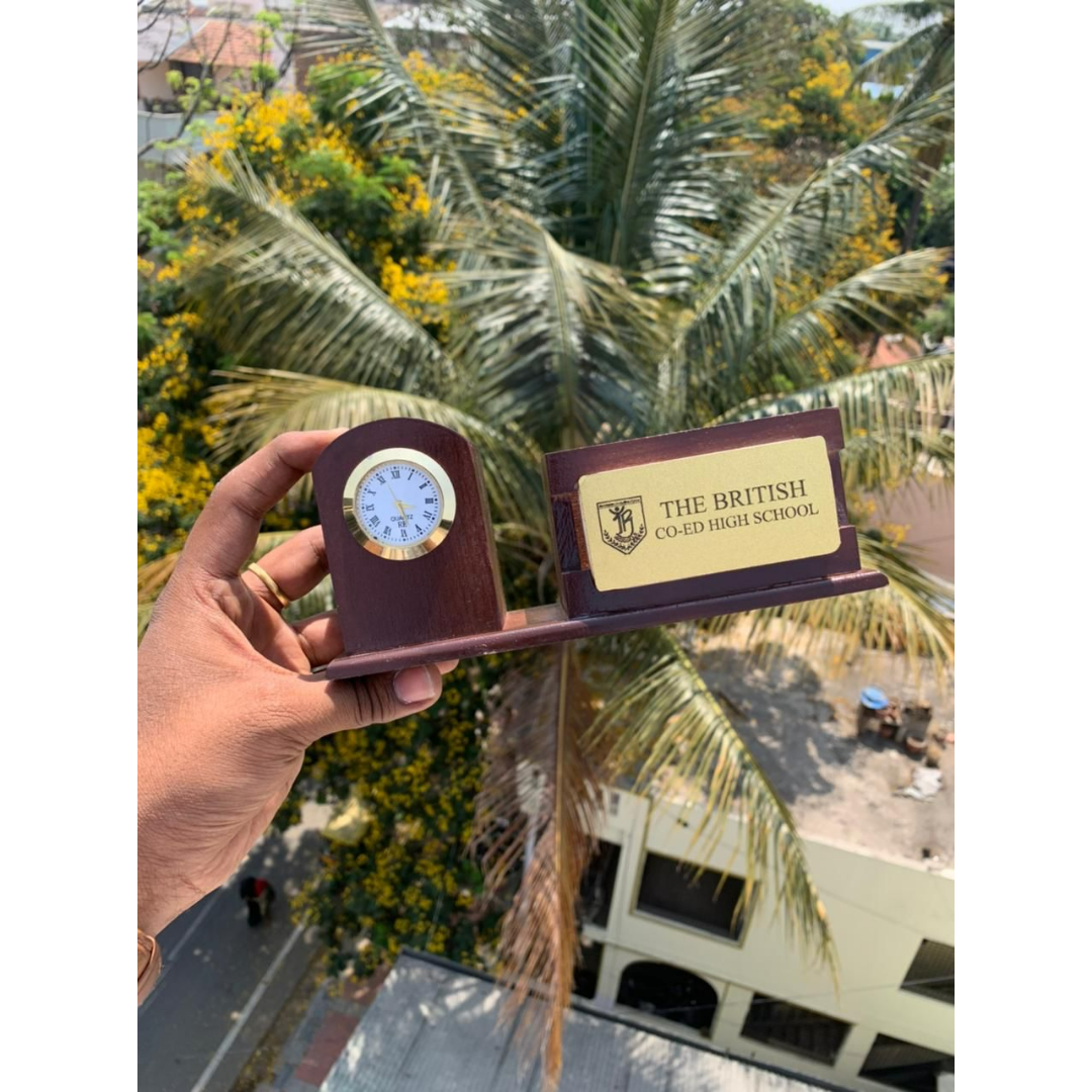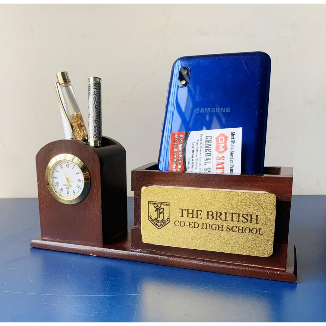 Bored with ordinary pen stands? Switch to a classy Pen stand. It holds a big space for mobile, cards, and other important stuff, a pen holder, a small clock and your name, and the logo of your choice on a golden plate.
