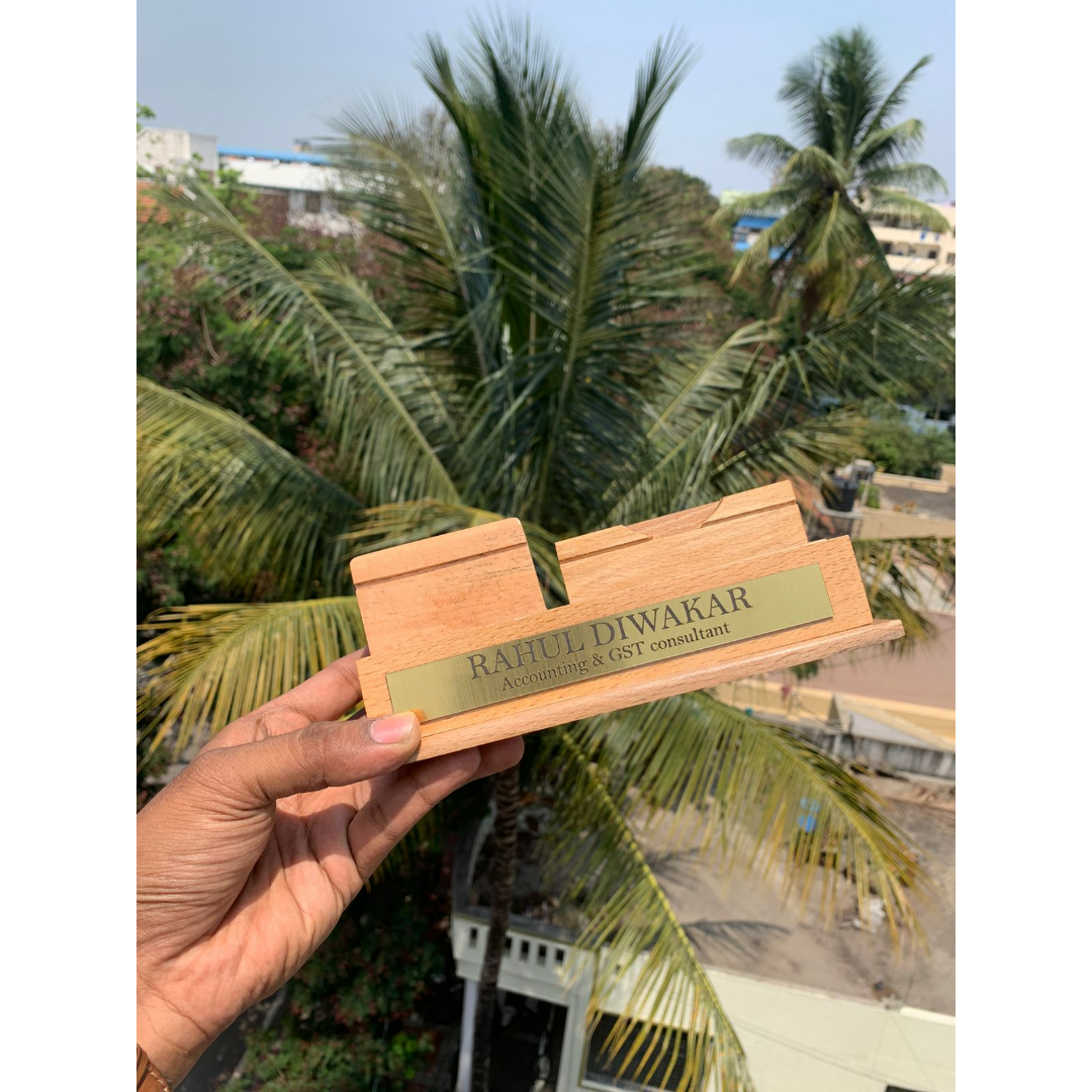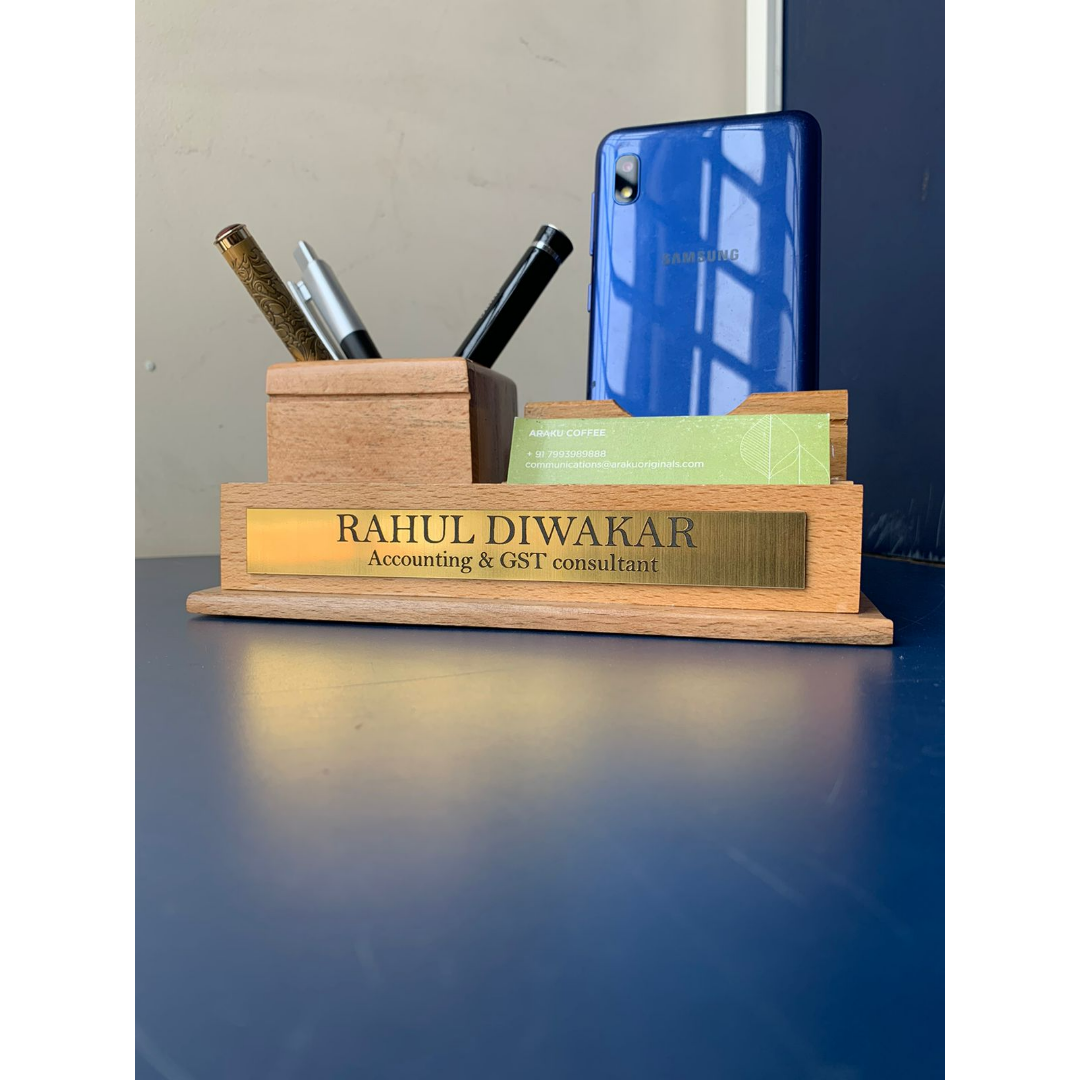 Give your table a significant look with two aesthetic pen stand 9.0. It consists of a golden nameplate with the position you hold in the company. A separate section for pea, mobile, and cards with a wooden base.