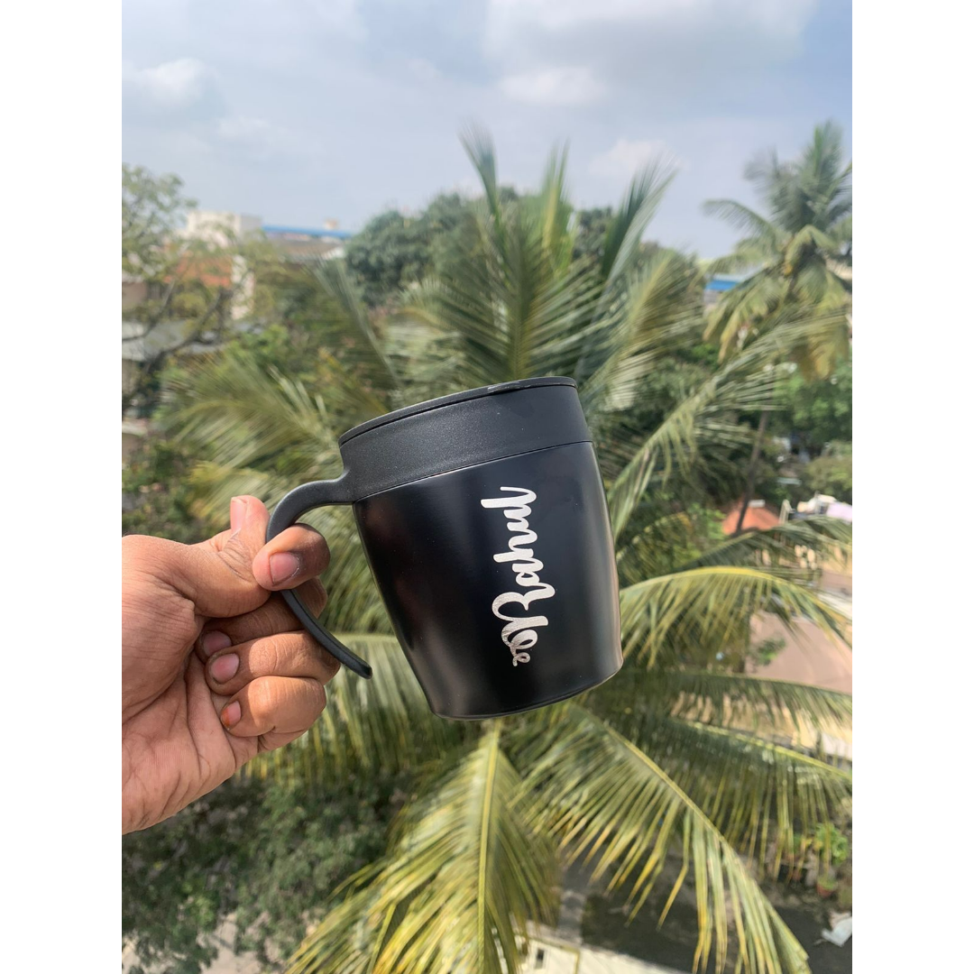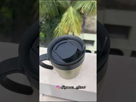 Get this differently designed travel mug. Made with stainless steel inside and outside, it has a rubber grip and handle. It can be personalized with the name and logo of your choice. It is available in gold and black color.