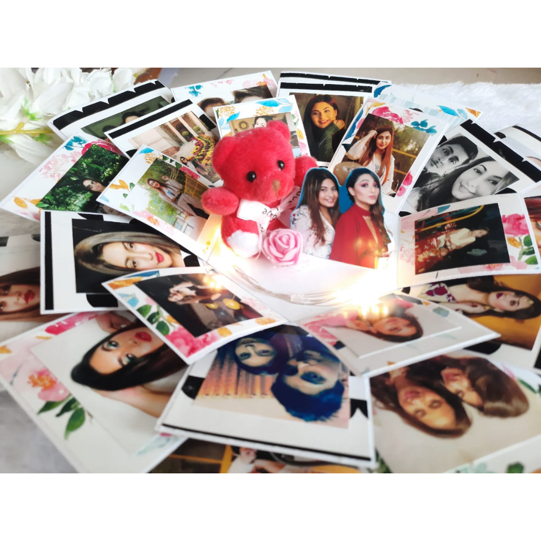 Some memories stay in our hearts forever, but we can't just let go of that sight. Embrace those special moments with the magic of the white explosion box. It is a 4-layer theme-based explosion box adorned with teddy and light, personalized with 30 ideal images and 5-7 heartwarming messages.