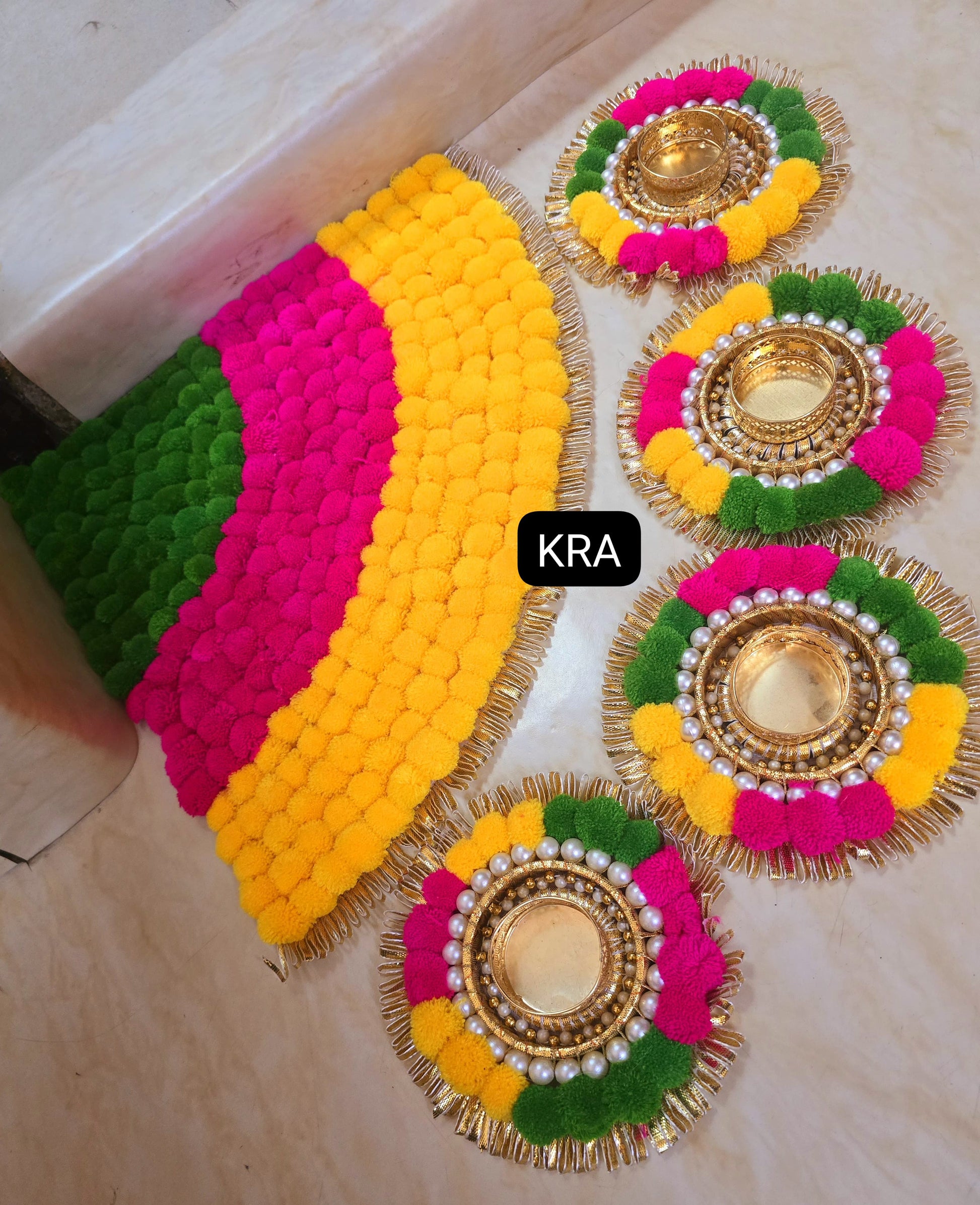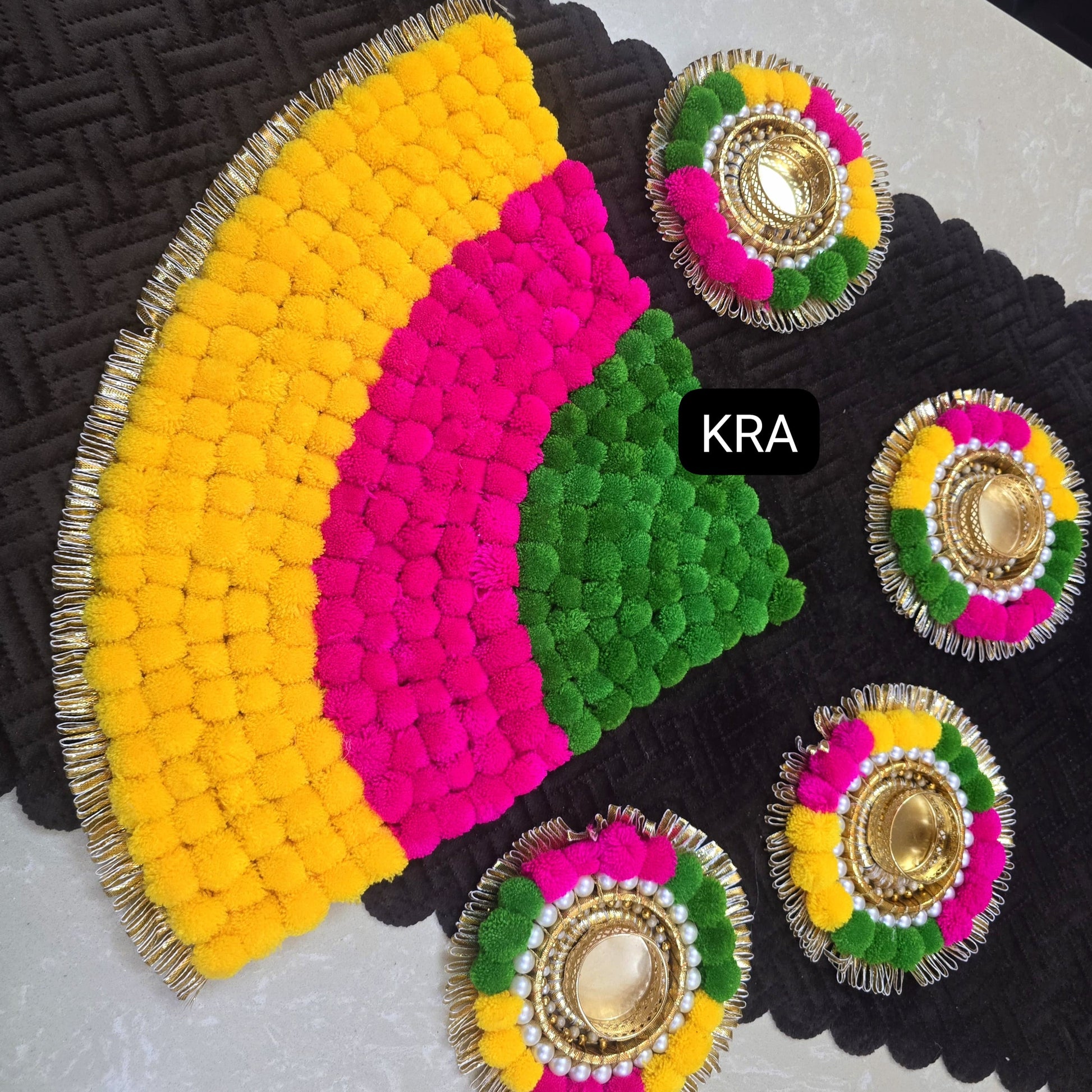 Brighten up your home corners with these colorful Corner Mats, crafted with vibrant pompoms and paired with elegant tealight holders. Ideal for festive decorations, they add warmth and a cheerful charm to your Diwali celebrations.