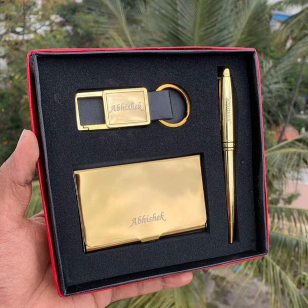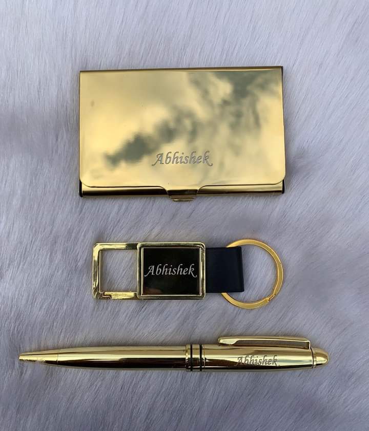 Embellish love for your dear ones by presenting them with a distinct corporate combo. It includes 1 metal card holder, 1 keychain, and 1 pen, all customized with your name. It is a value-for-money product and is suitable for gifting purposes.
