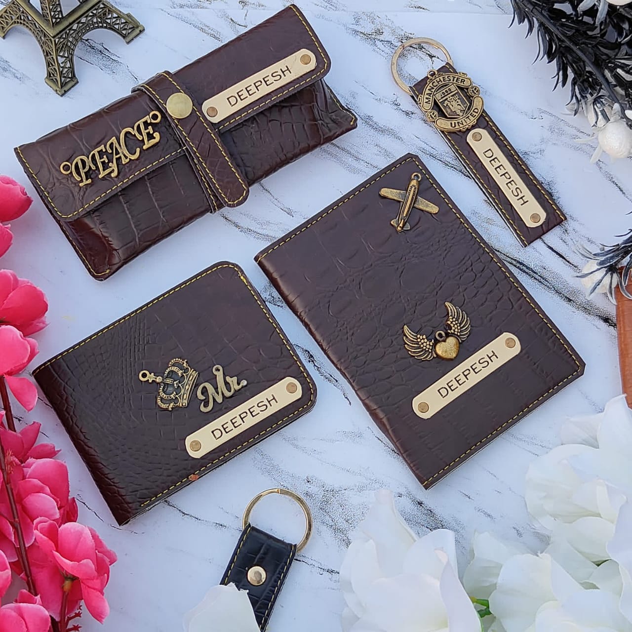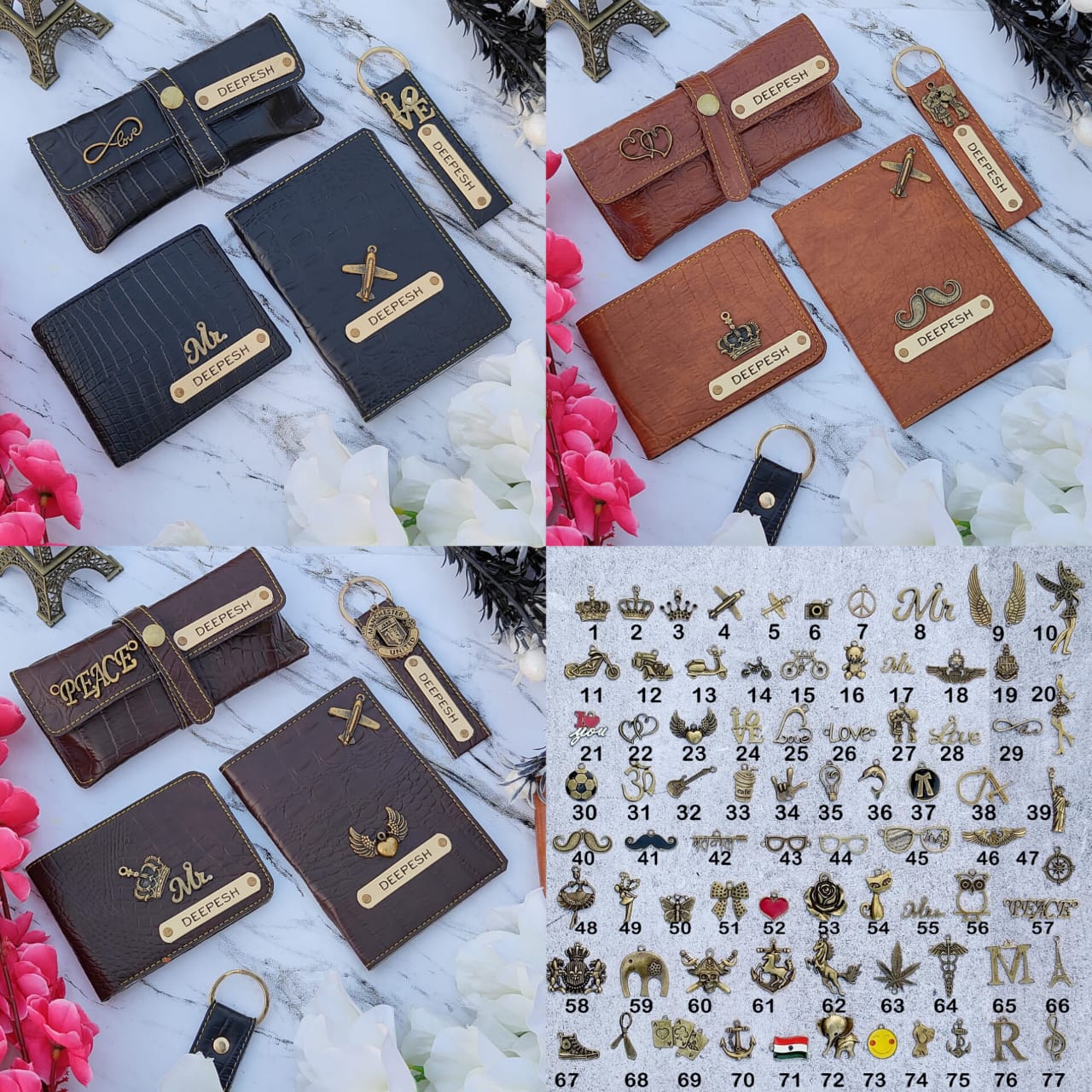 Scope of one name & one charm on the wallet, passport cover, eyewear case & keychain.