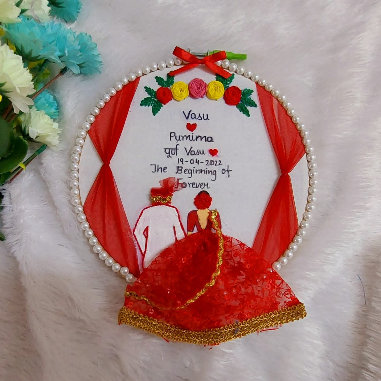 - Embroidery color will be made in contrast to the bride & groom dress color combination.