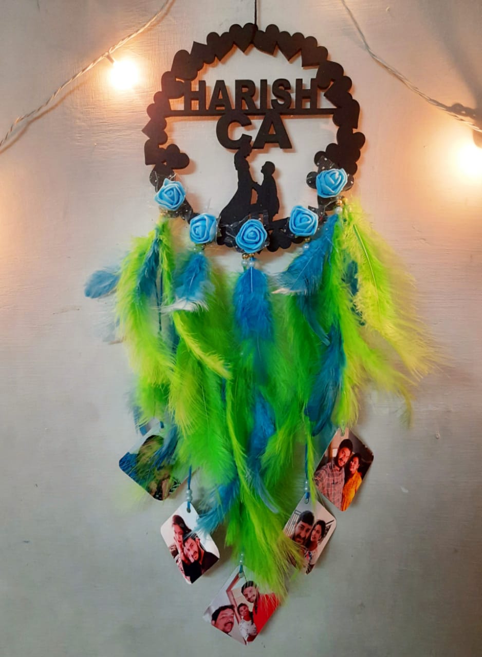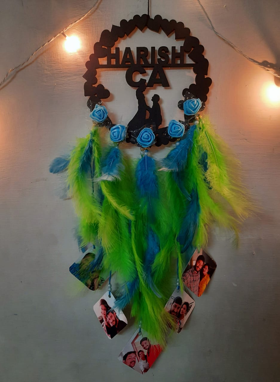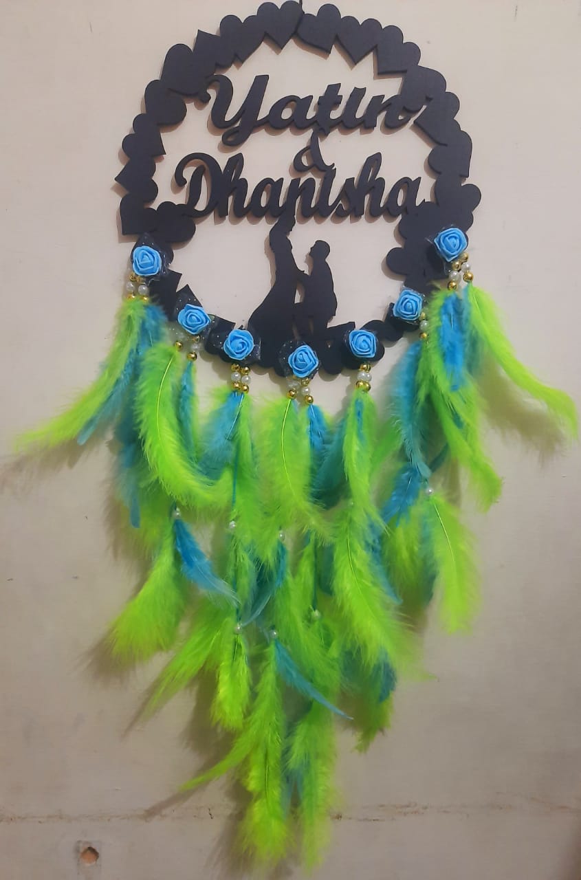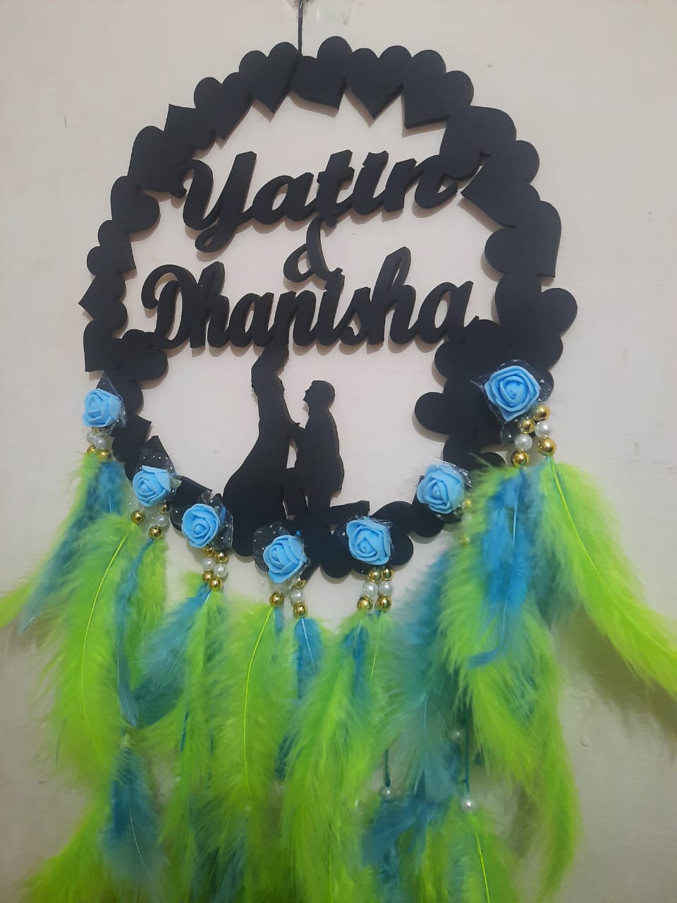 Give an engrossing look to the walls of your room/living area with a custom feather hanging. It is made of MDF and is decorated with handmade flowers, long colorful feathers, and simple designs. It has a customized name in the center with heart design borders. Available in two variations, with and without a picture.
