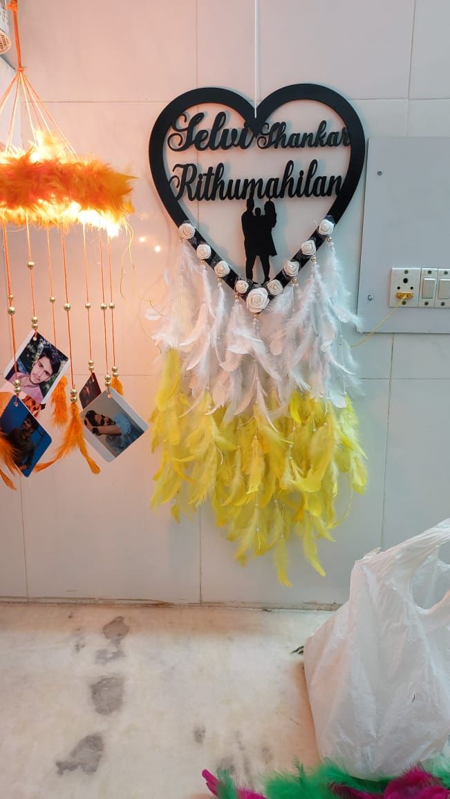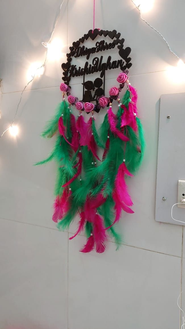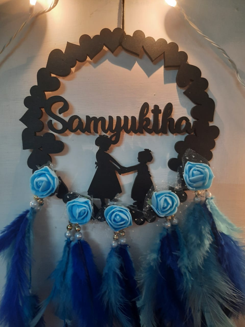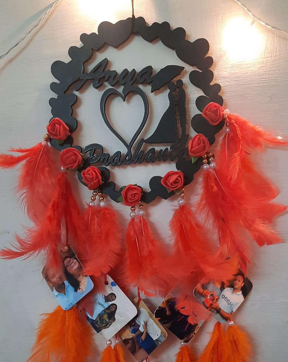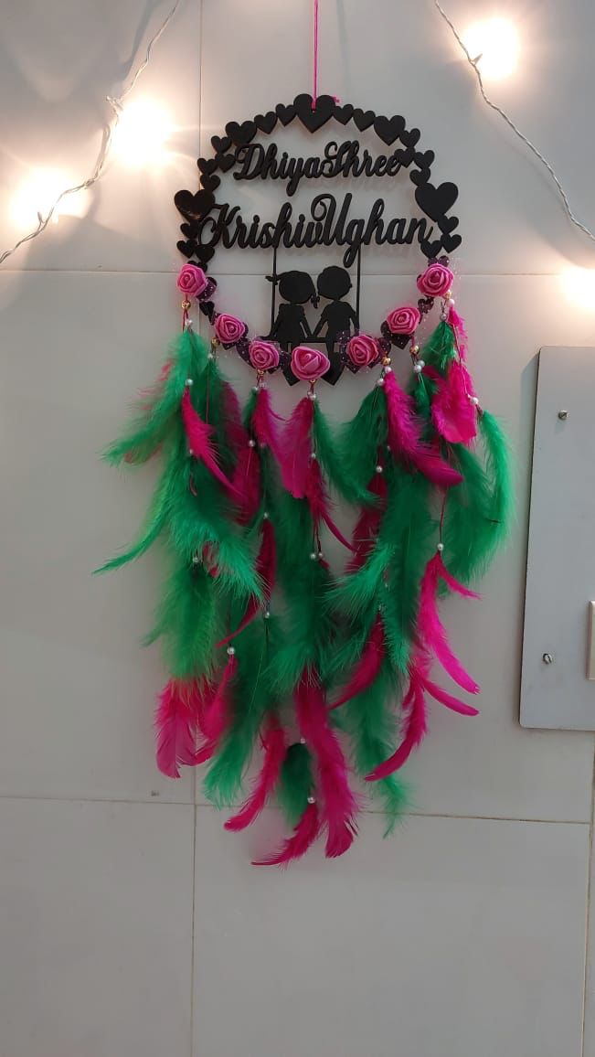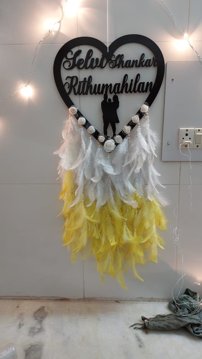 Give an engrossing look to the walls of your room/living area with a custom feather hanging. It is made of MDF and is decorated with handmade flowers, long colorful feathers, and simple designs. It has a customized name in the center with heart design borders. Available in two variations, with and without a picture.