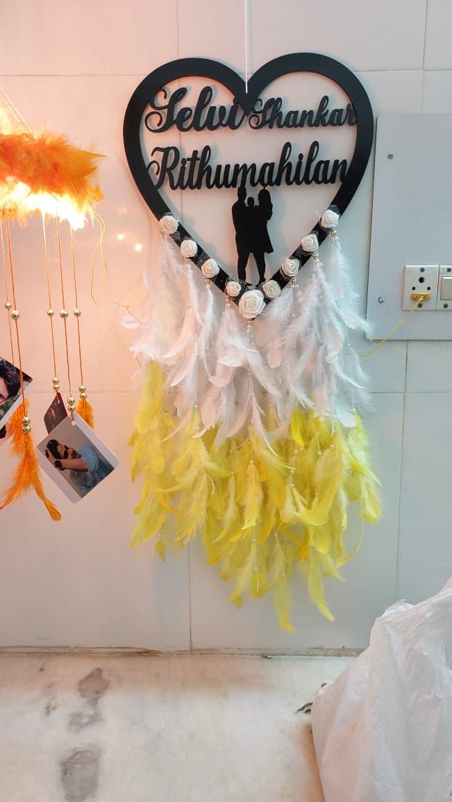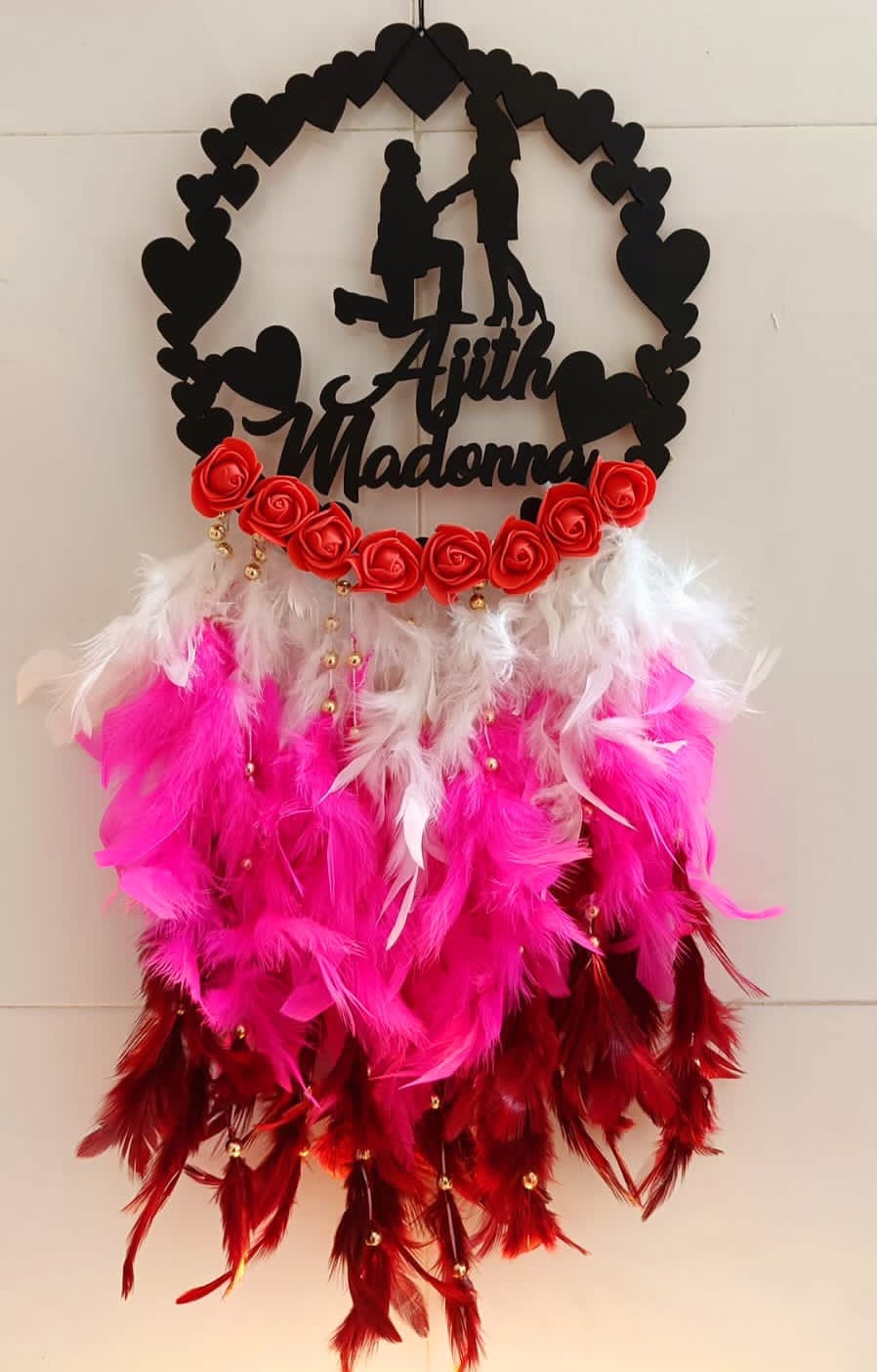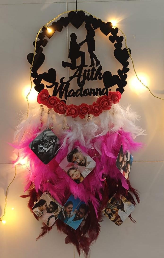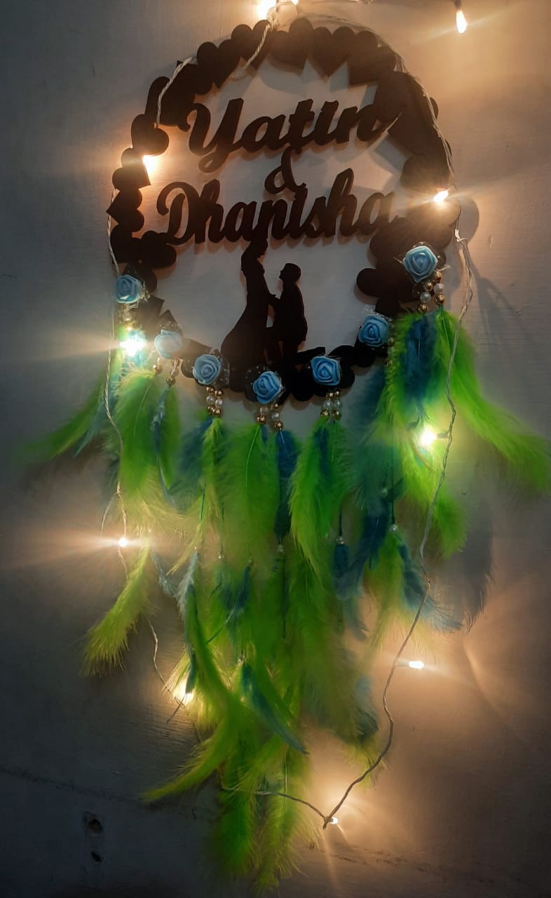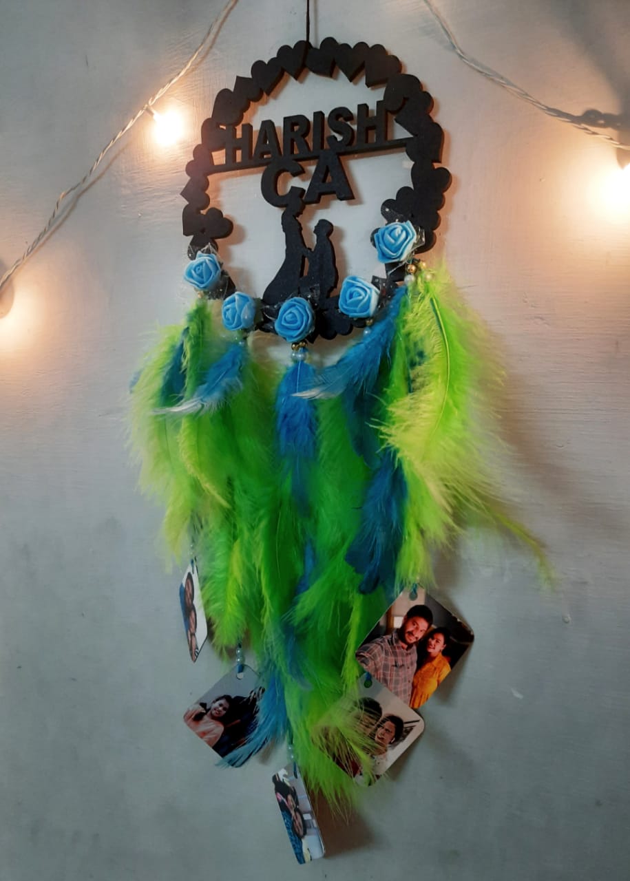 Give an engrossing look to the walls of your room/living area with a custom feather hanging. It is made of MDF and is decorated with handmade flowers, long colorful feathers, and simple designs. It has a customized name in the center with heart design borders. Available in two variations, with and without a picture.