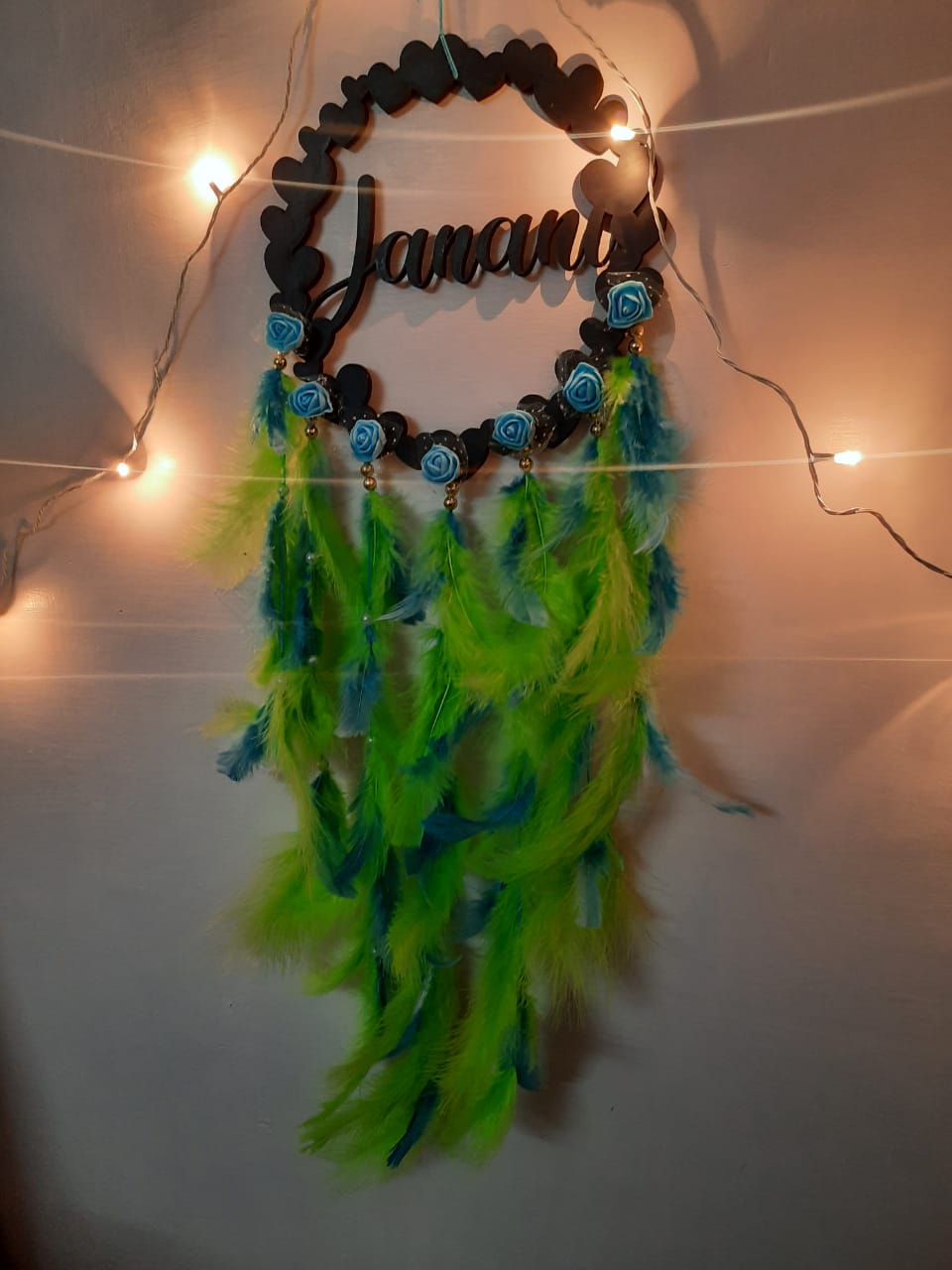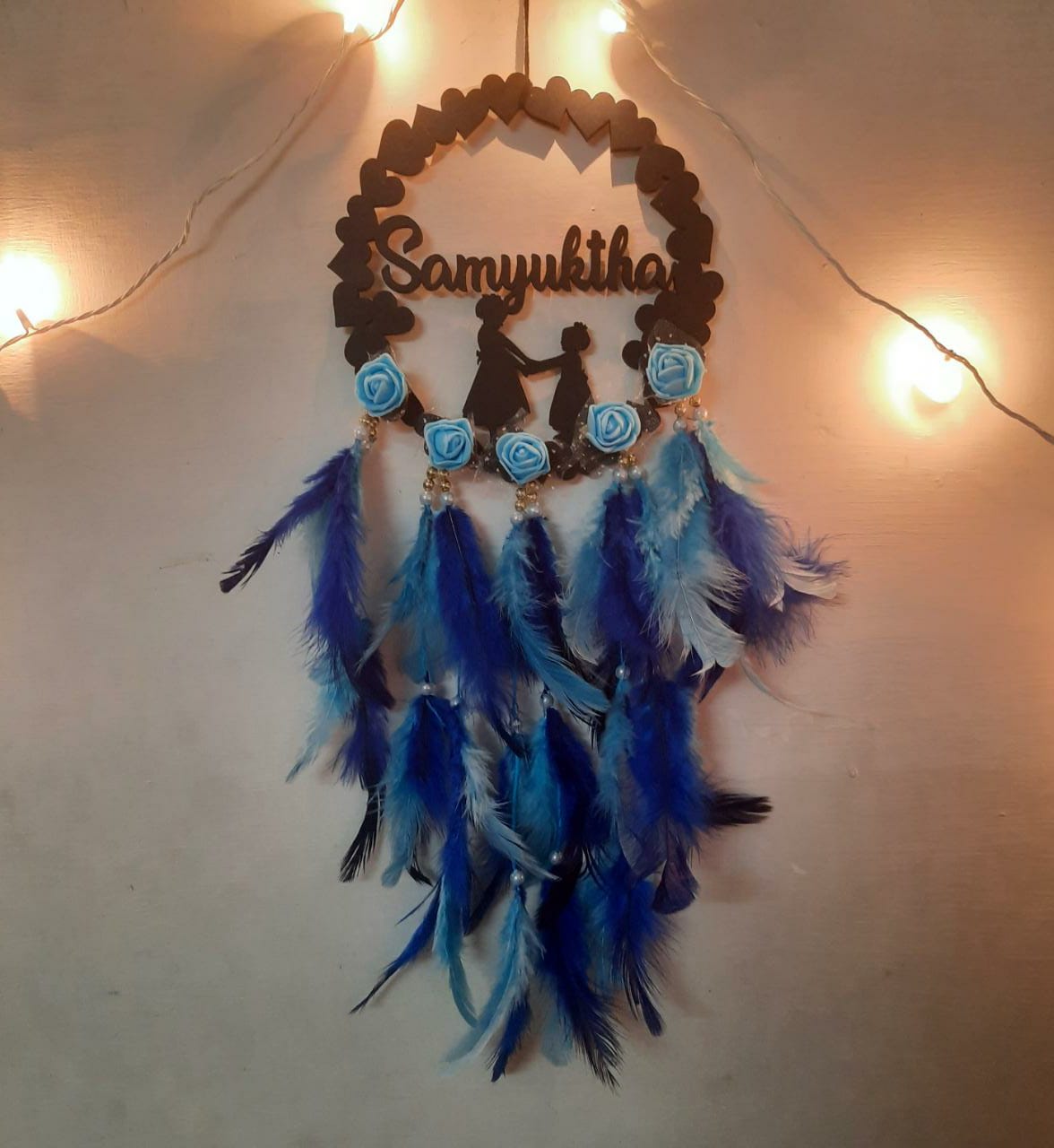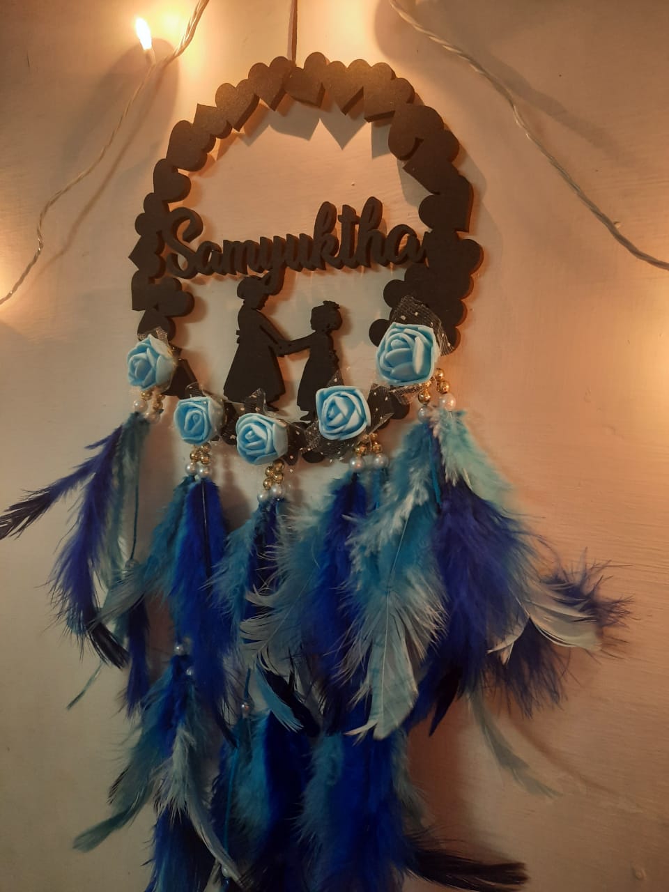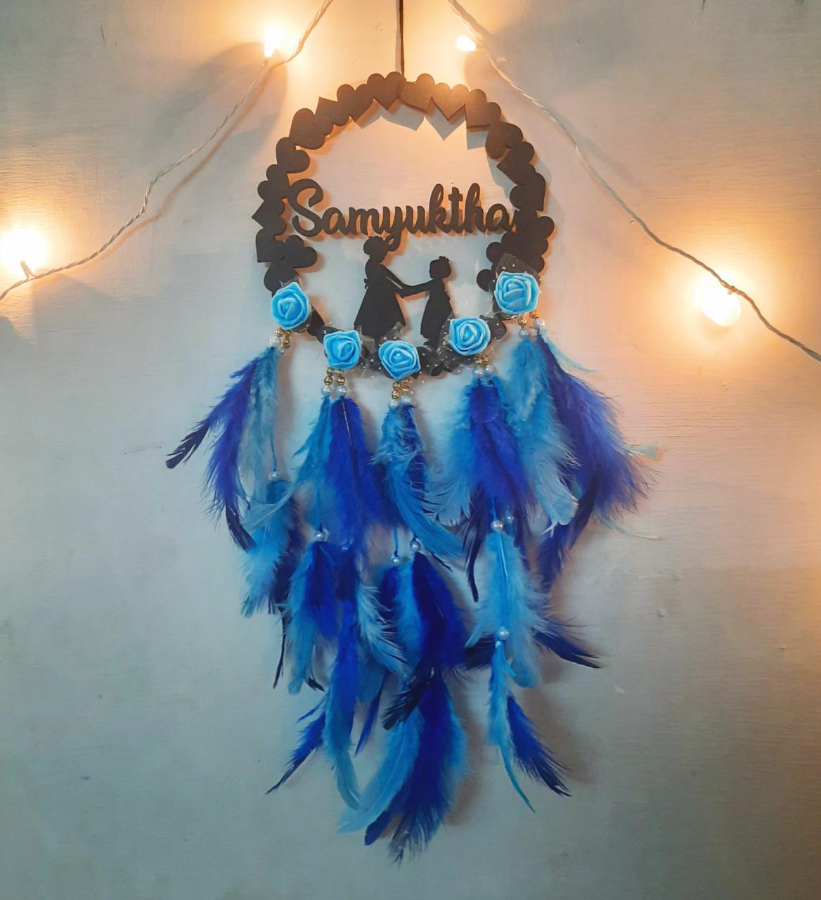 Give an engrossing look to the walls of your room/living area with a custom feather hanging. It is made of MDF and is decorated with handmade flowers, long colorful feathers, and simple designs. It has a customized name in the center with heart design borders. Available in two variations, with and without a picture.