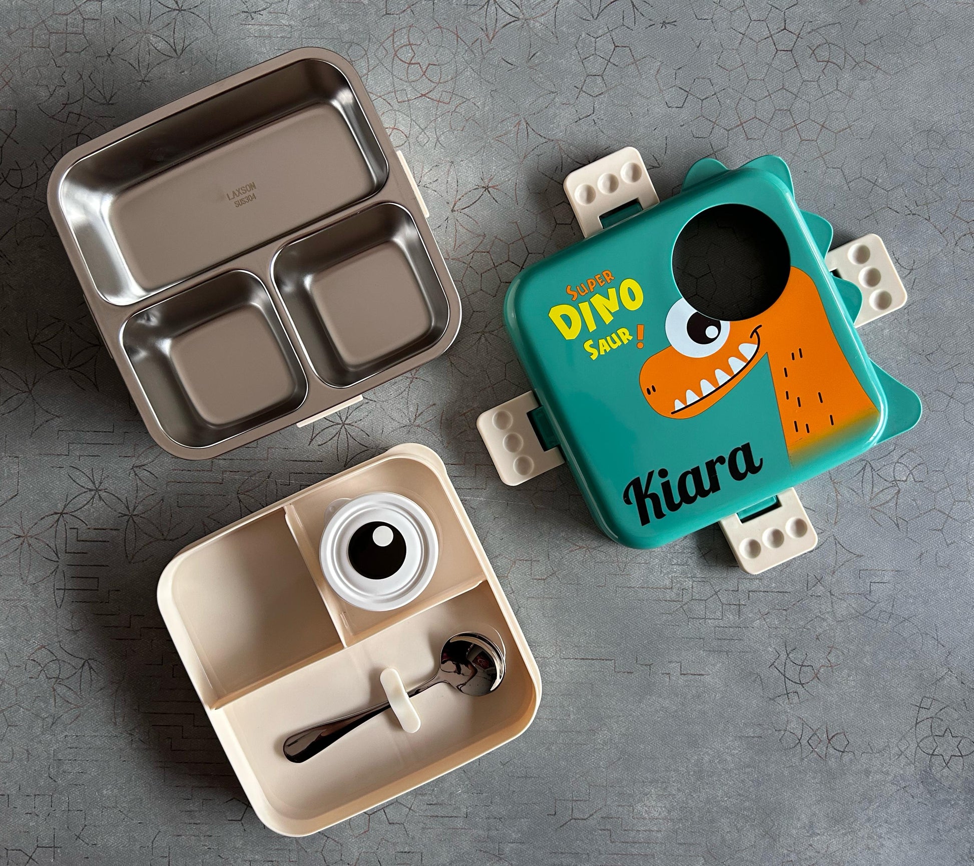 Brighten up your child’s day with this vibrant and personalized Dino Lunch Box and A1 Sipper Bottle combo!