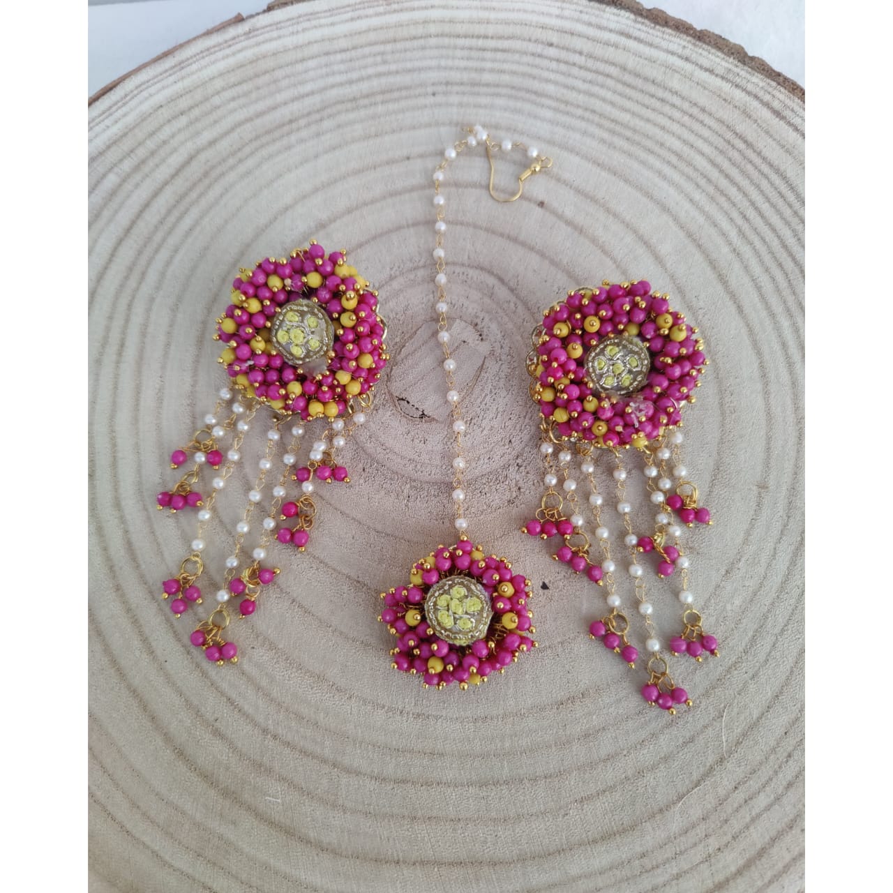 Elevate your ethnic look with this stunning Earrings & Mangtika Set 11.0, crafted with vibrant color and golden beads. The intricate detailing and pearl strands add a touch of tradition, making it perfect for weddings, festive occasions, and bridal celebrations.