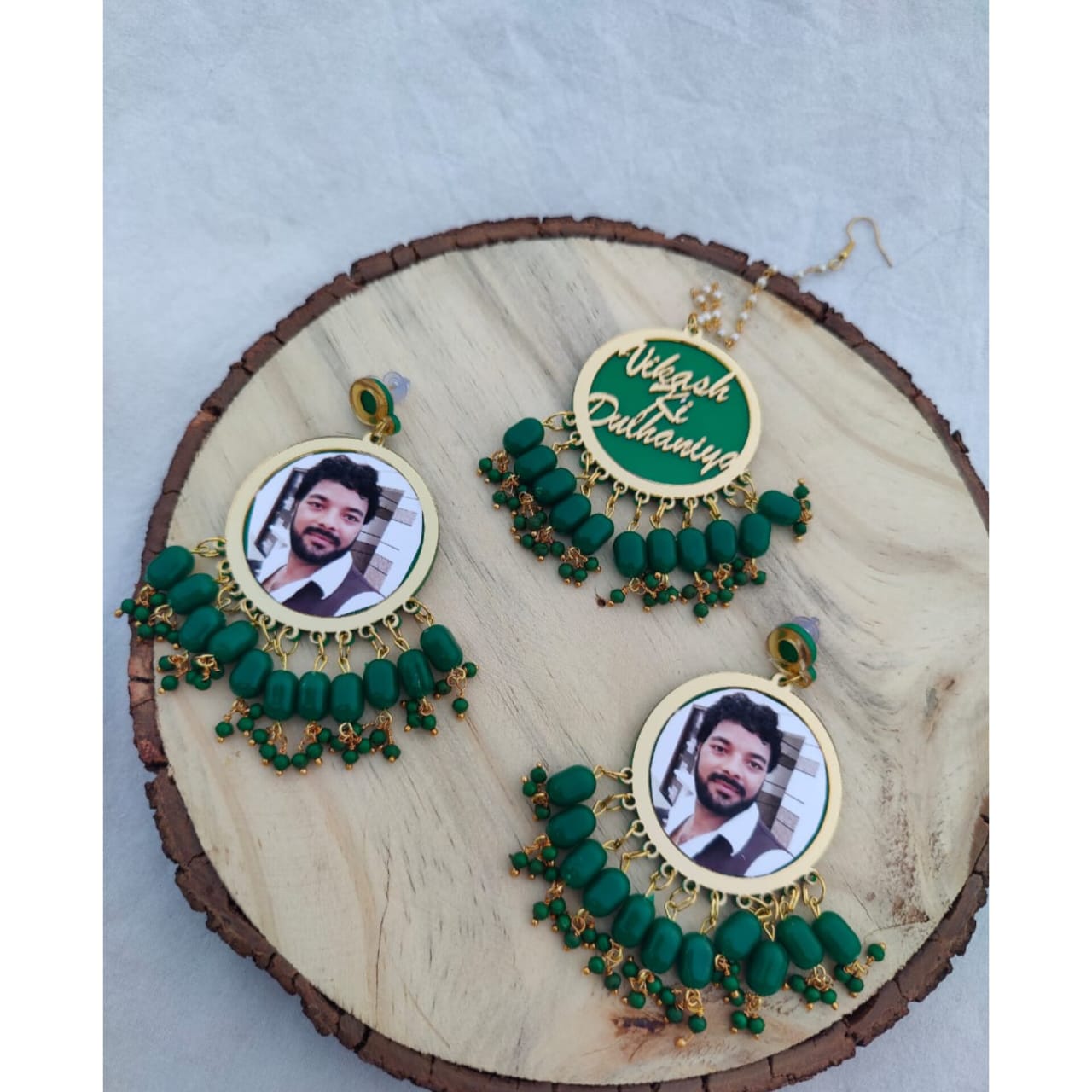 Celebrate your special day with Earrings & Mangtika Set 9.0, featuring personalized photo design and a stylish customized tag. Adorned with beads and golden detailing, this set is perfect for weddings, haldi, and mehendi, making you the center of attention with a customized touch.