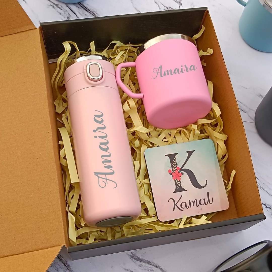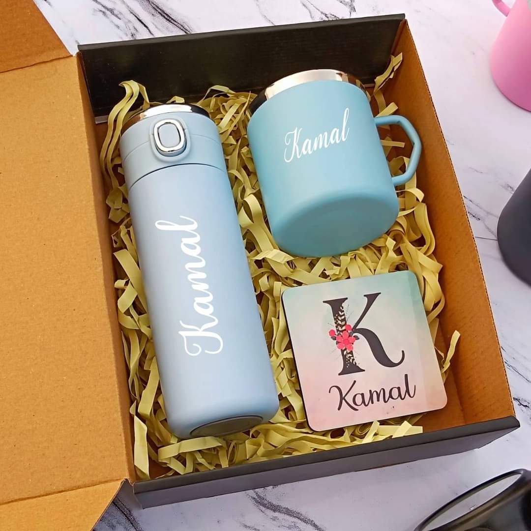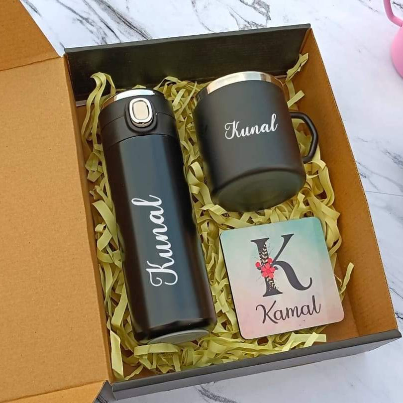 Surprise someone special with this thoughtfully personalized gift set, designed to add a personal touch to everyday essentials. Featuring a coordinated flask, mug, and magnet, all customized with the name, this trio blends practicality with charm.