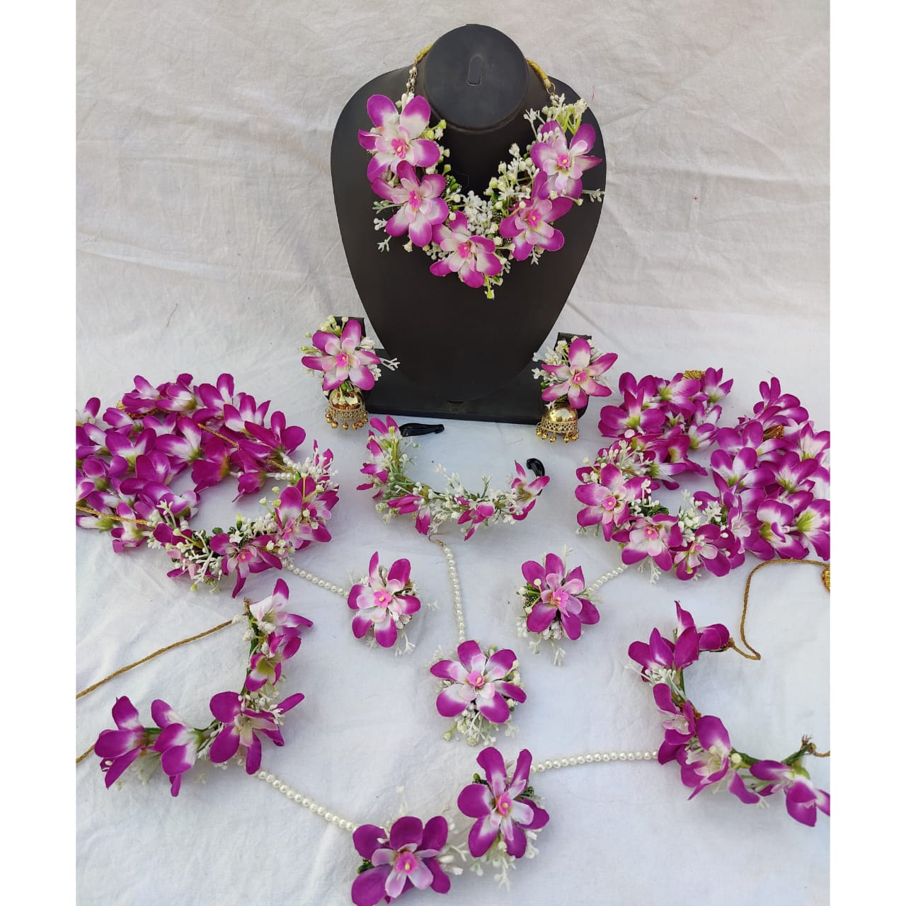 Embrace elegance with Floral Jewelry Set 16.0, crafted with vibrant orchid-inspired flowers and delicate pearl accents. Perfect for haldi, mehendi, and festive celebrations, this handcrafted set adds a refreshing and graceful touch to your traditional look