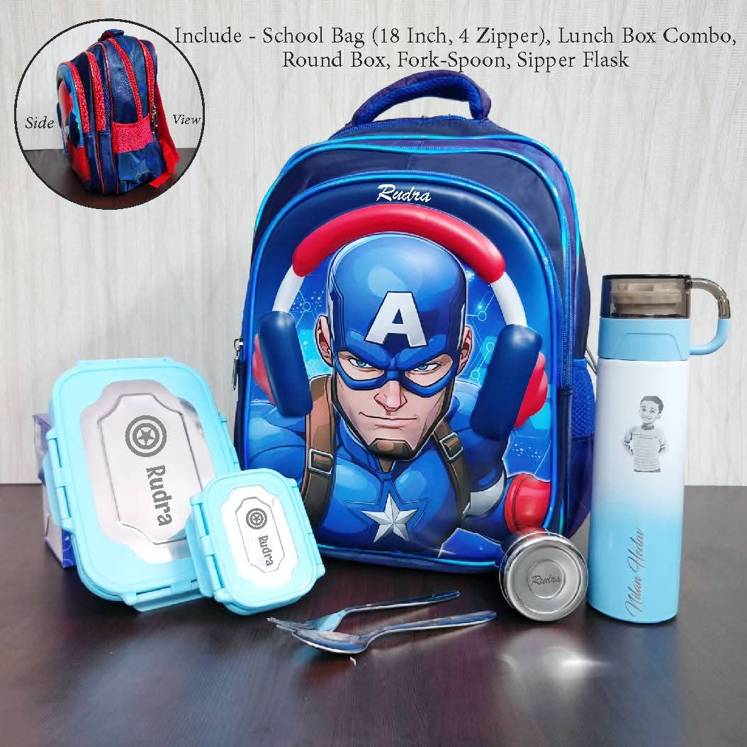 Scope of one name customized on bag, lunch box set, round box, fork, spoon & flask and one pic customized on flask.