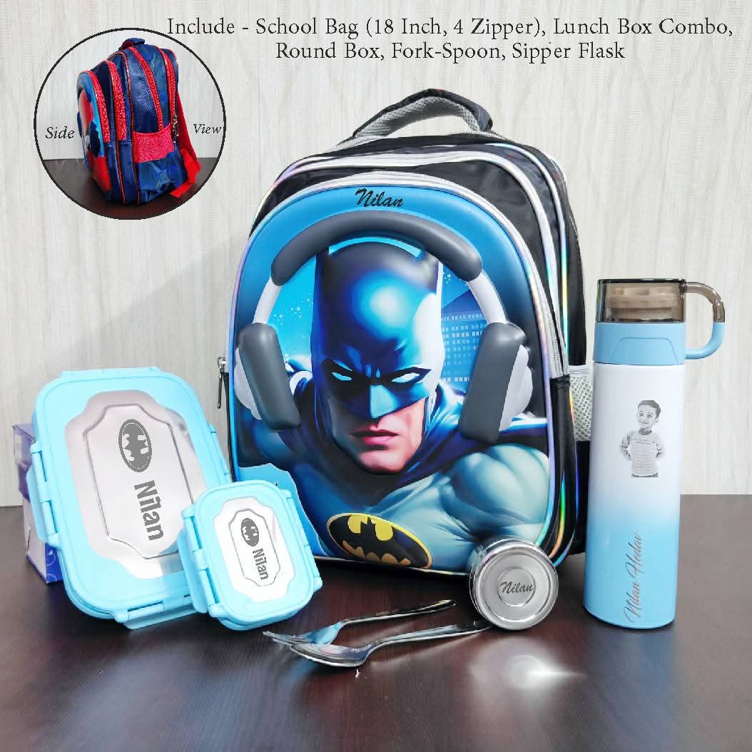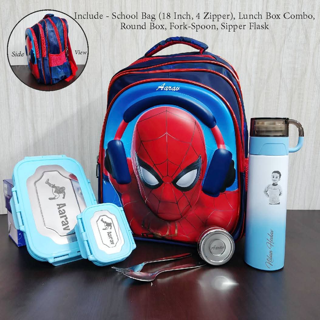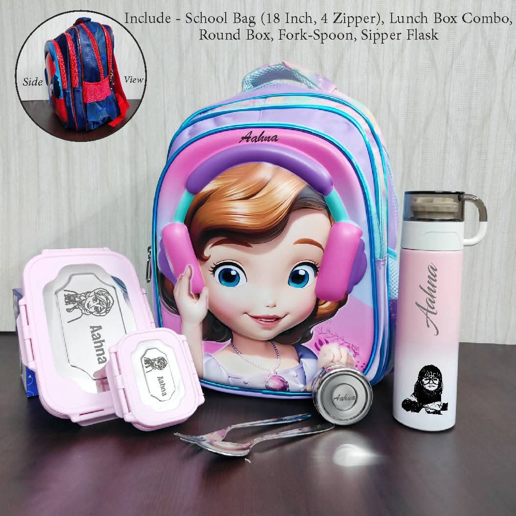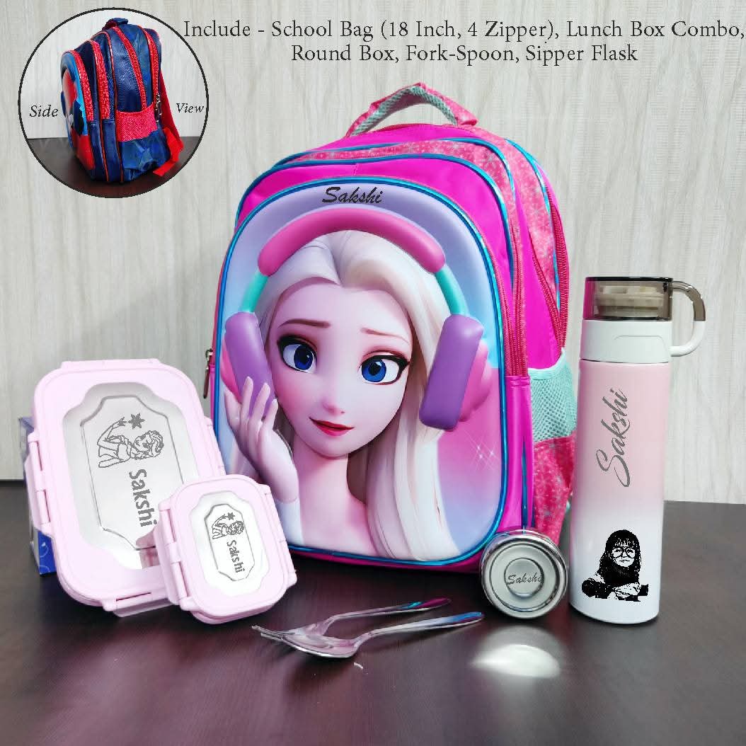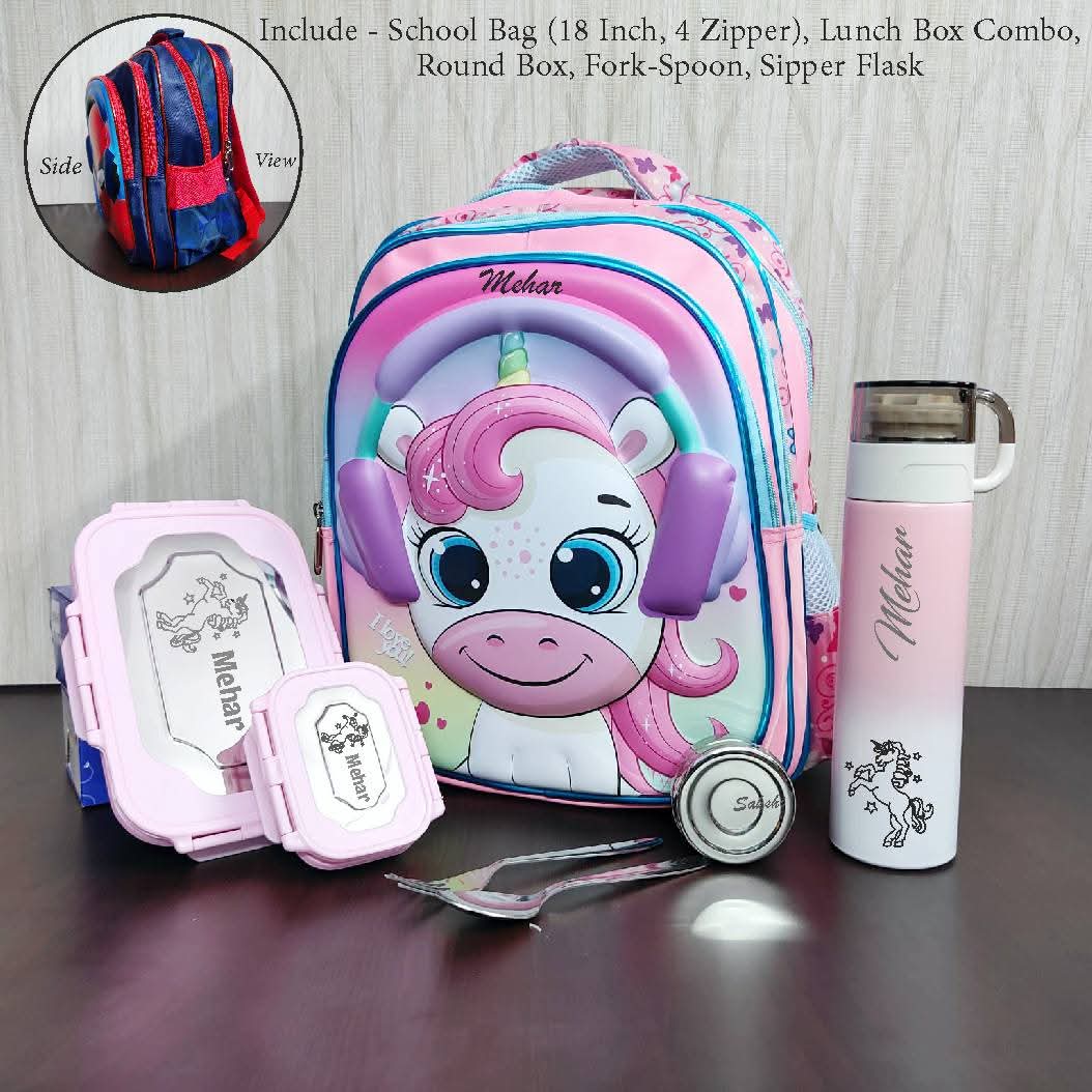 Make school time more exciting with the Headphone Design Bag Hamper. This set includes an 18-inch 4-zipper school bag, lunch box combo, round box, fork-spoon, and sipper flask—perfect for everyday school essentials with a stylish touch.