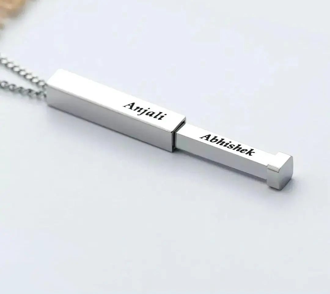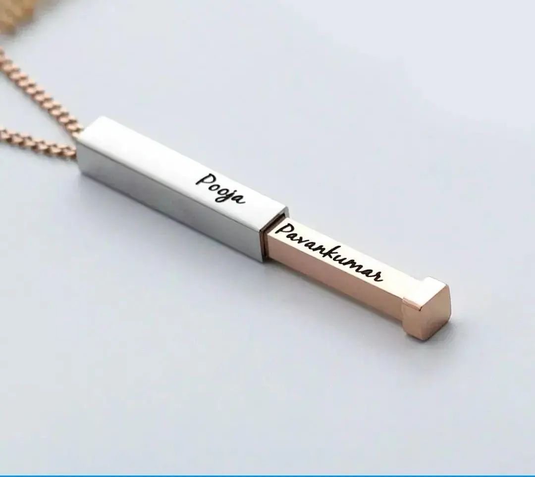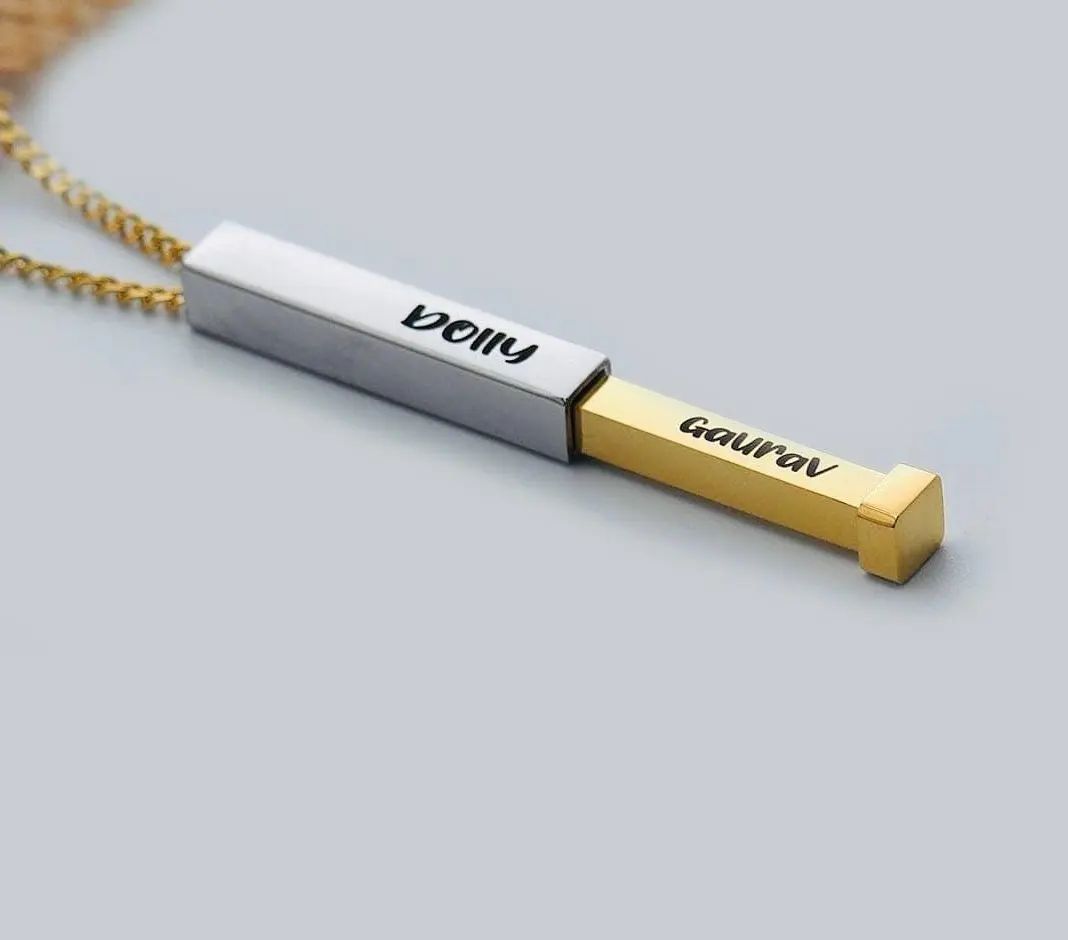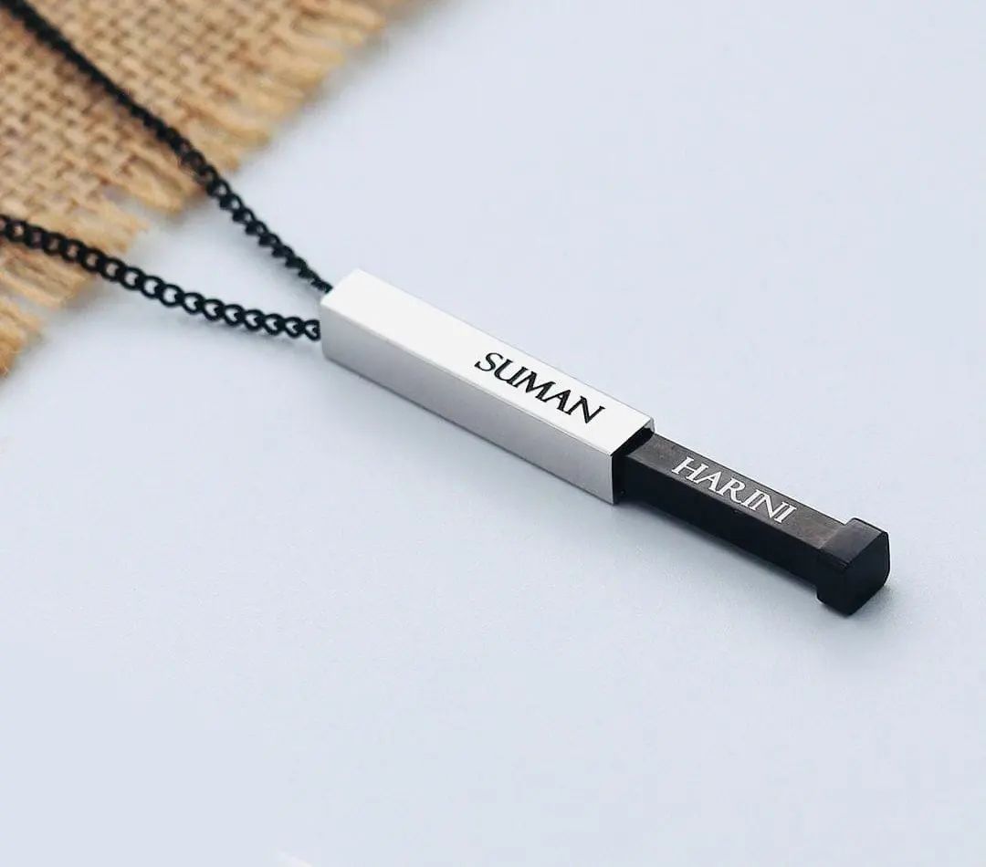 A sleek and modern statement of connection — this personalized Hidden Bar Pendant lets you engrave names on multiple sides, symbolizing the bond between loved ones. Minimalistic yet meaningful, it’s a perfect gift for couples, friends, or family.