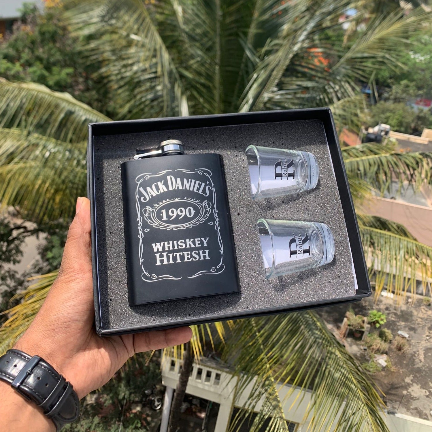 Hip flasks are one of the most convenient & practical ways of carrying your favorite liquor anywhere. At Sajawat Official, you can get your very own customized hip flasks with 2 shot glasses! It comes with a captive top with a hinge & curved design that's easier to carry.
