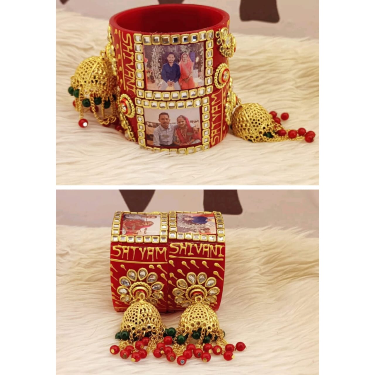 Enhance your Karwachauth celebration with this beautifully customized Kada set, featuring dazzling stones, vibrant red base, and personalized names for a unique touch. A perfect blend of tradition and elegance to make your festive look truly special and memorable.