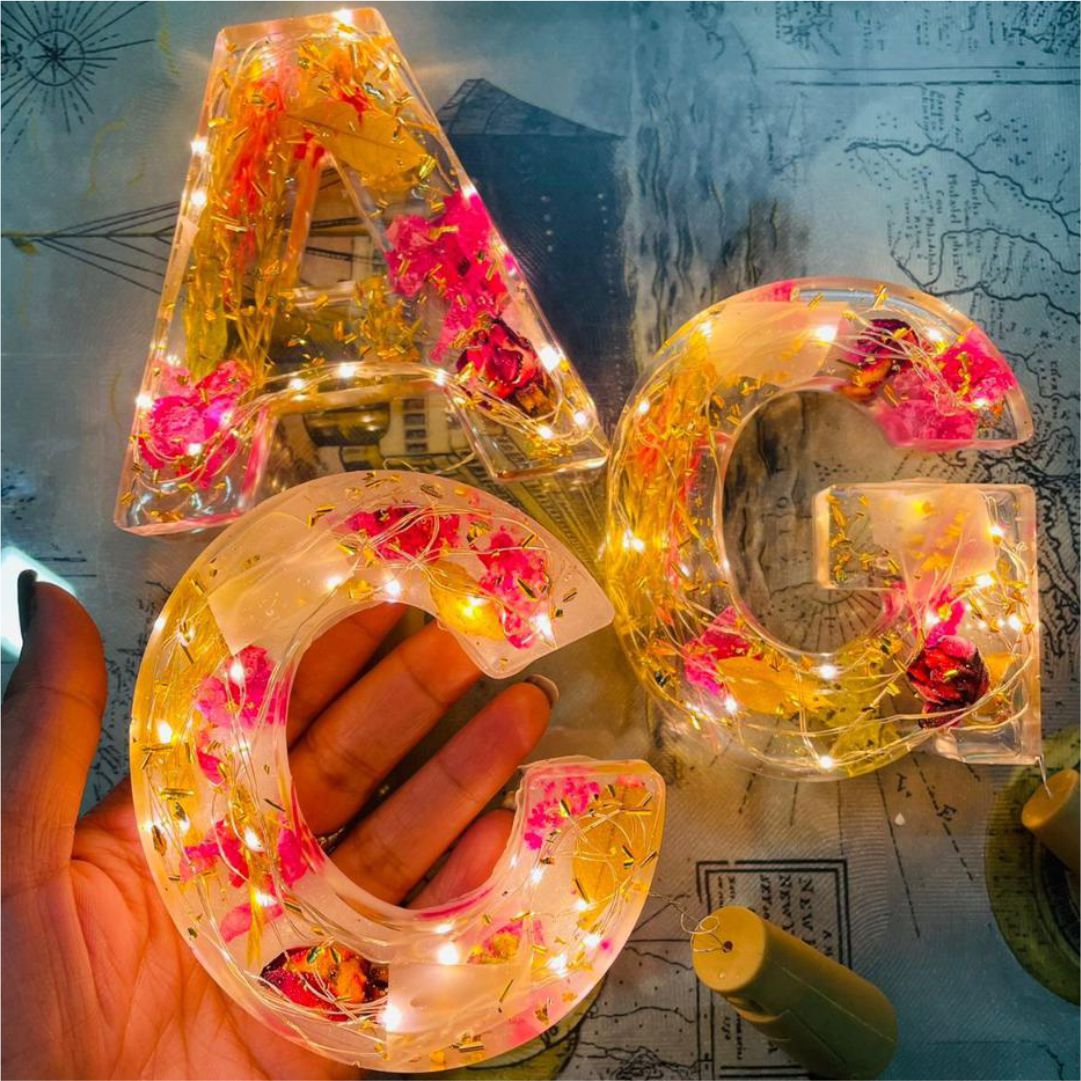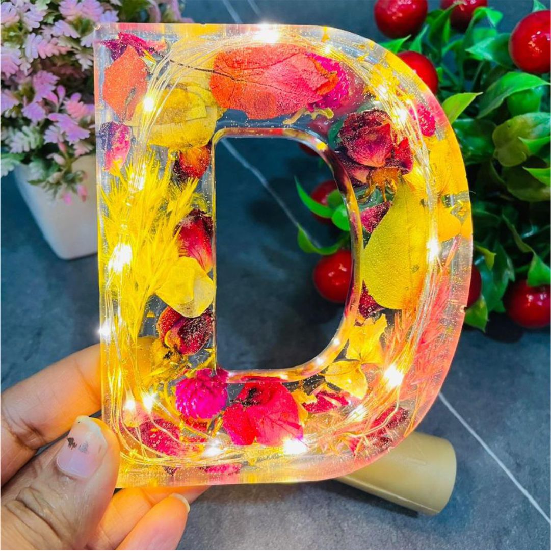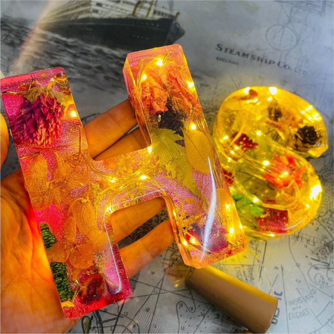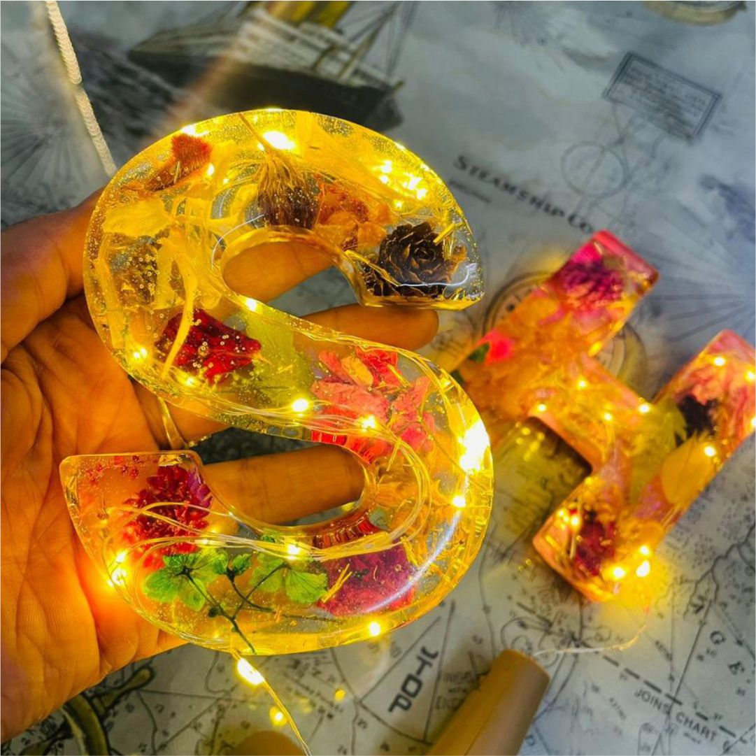 Looking for something unique to gift your loved ones? An ideal gift with an outstanding look, LED resin initial, beautifully crafted with dried flowers, leaves, LED lights resh initial and it also has designed name written on top of the initial in black color.
